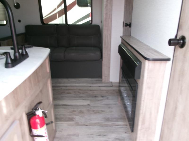 A trip to the lake or your favorite state park just got better in this comfortable travel trailer. Whether you're relaxing on the sofa or booth dinette, cooking in the spacious kitchen, or sitting outside under the electric awning with LED lights, you will enjoy every minute you camp. You and your spouse will have a private bedroom up front with a queen bed and dual wardrobes, and there are double-size bunks for the kids or your friends!