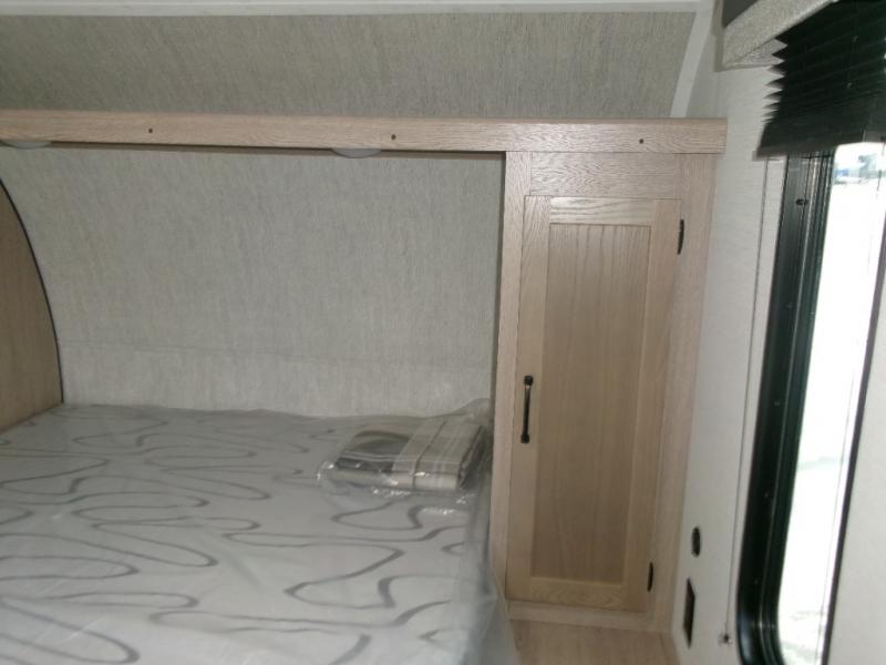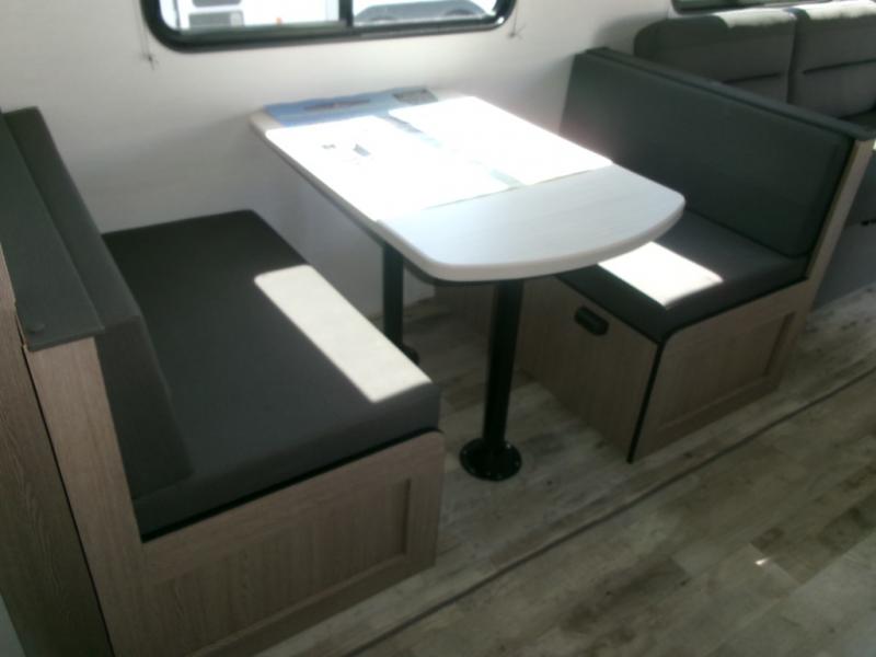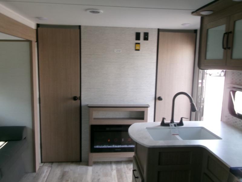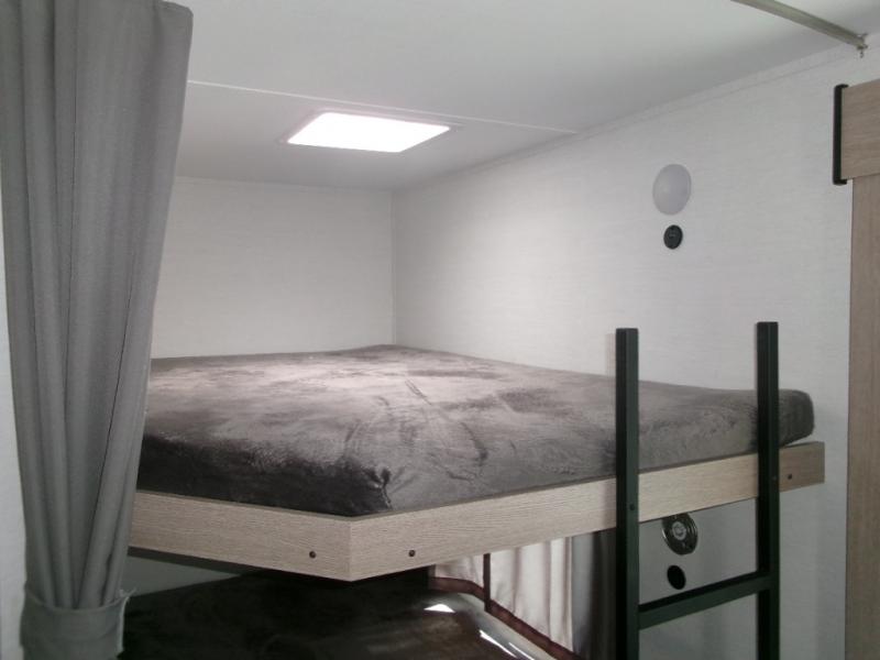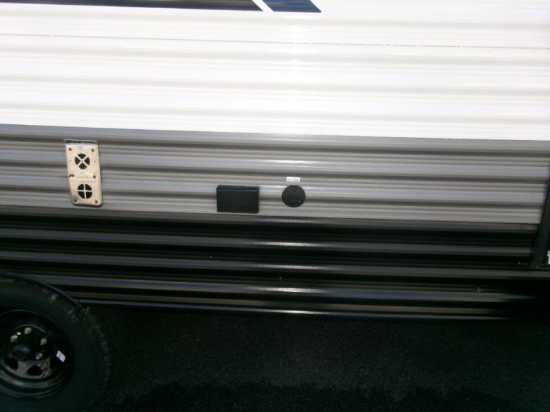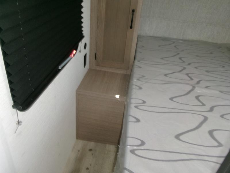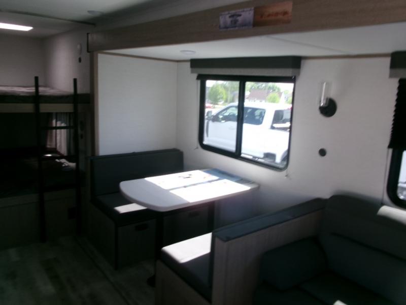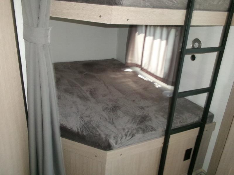 A trip to the lake or your favorite state park just got better in this comfortable travel trailer. Whether you're relaxing on the sofa or booth dinette, cooking in the spacious kitchen, or sitting outside under the electric awning with LED lights, you will enjoy every minute you camp. You and your spouse will have a private bedroom up front with a queen bed and dual wardrobes, and there are double-size bunks for the kids or your friends!