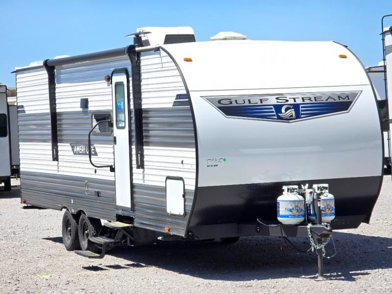 The Ameri-Lite Ultra Lite travel trailers by Gulf Stream are the perfect RV for families wanting to start their camping lifestyle, but not break the bank. These lightweight units are built with a diamond plate lower front, a one-piece synthetic vinyl roof, and a uni-body construction with steel hurricane straps tying the walls to the floor for added durability. The front power hitch jack and four stabilizer jacks will make set-up hassle-free once you arrive at the campground, and you can put out the electric awning to rest in the shade when you're done. Each model includes convenient amenities, like the 13,500 BTU A/C, the tankless water heater, a central control panel, and multiple USB ports for your tablet, phone, and camera! The inside is designed to make you feel at home with radiant LED lighting, designer kitchen backsplash, pleated privacy shades, craft-made cabinetry, plus many more features. Start your RV lifestyle with an affordable, lightweight Ameri-Lite Ultra Lite travel trailer today!