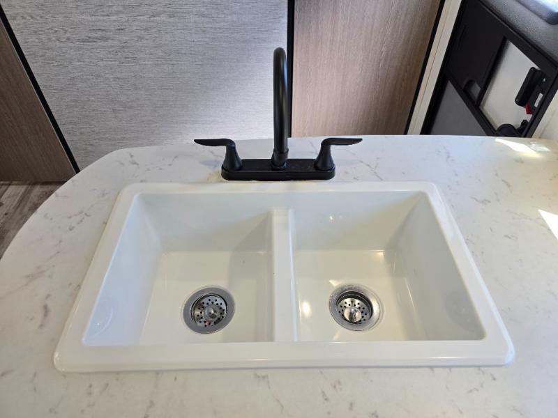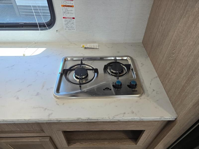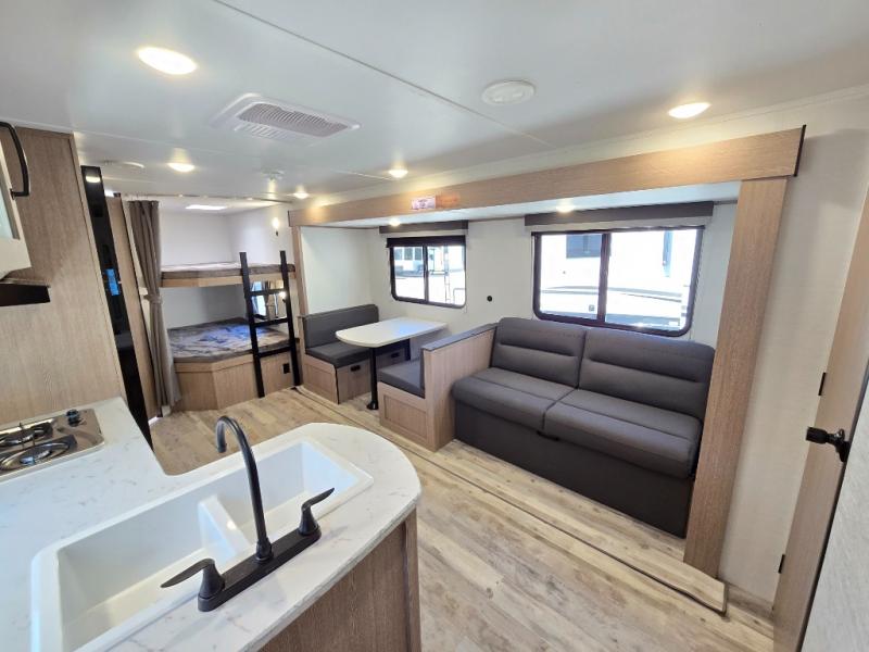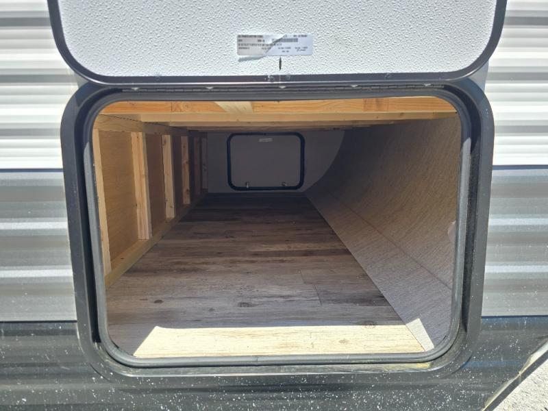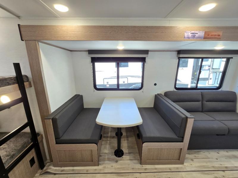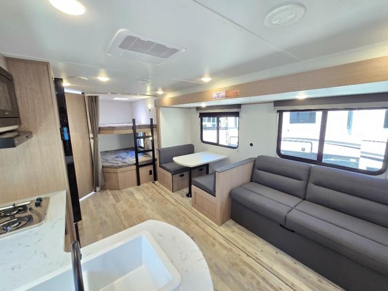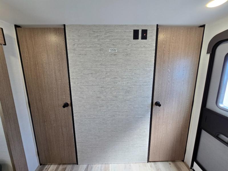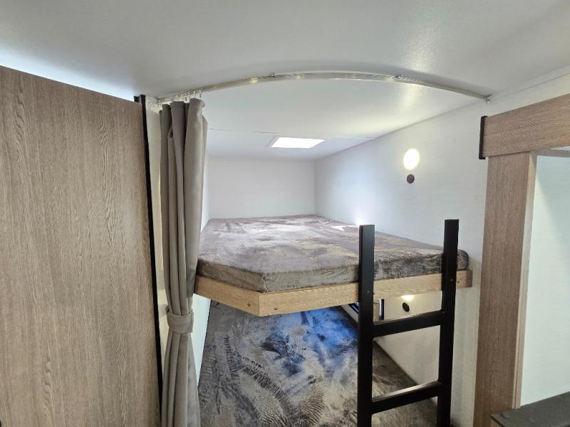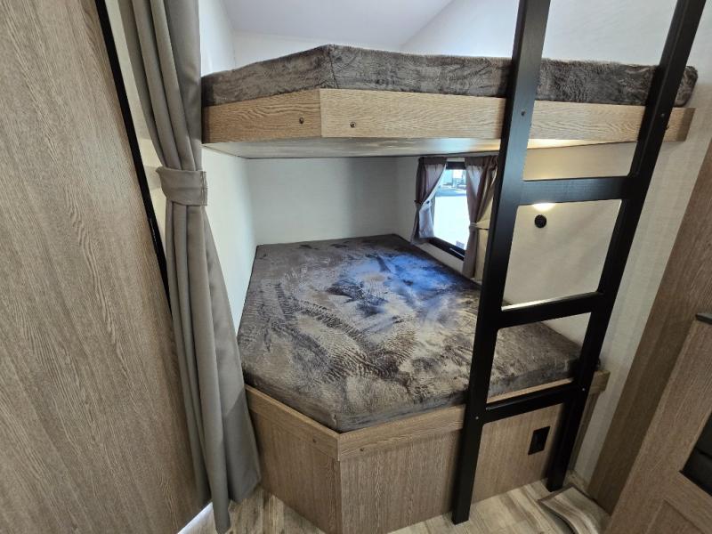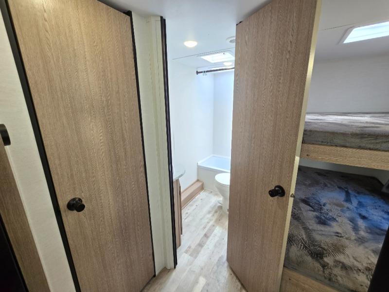 Invite more along with double-size bunks in this 'Show Stopper' travel trailer! The private shower and toilet is close to the bunks if you're camping with little ones making it quite convenient, especially at night. You will be comfortable on the front RV queen bed with dual bedside nightstands and shirt closets. The kitchen features everything you need to create meals and snacks for your entire family, and the outside pass-through storage allows you to easily tuck away your gear like fishing poles, camp chairs and games, plus more!