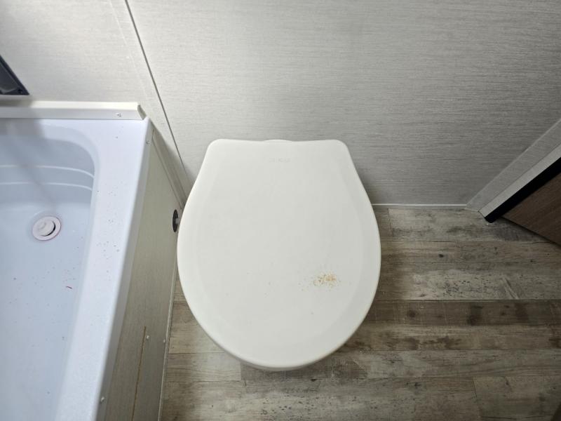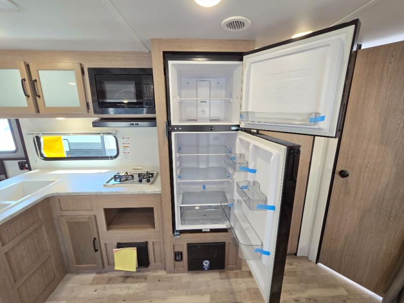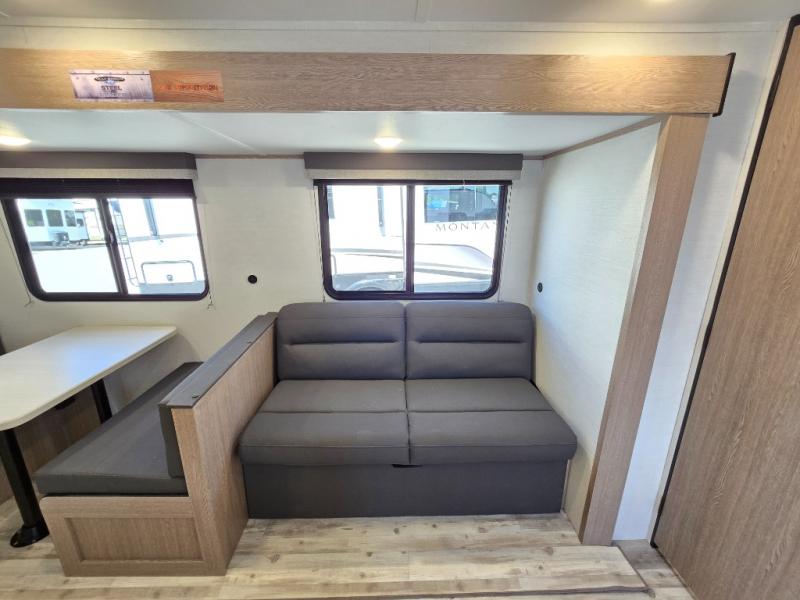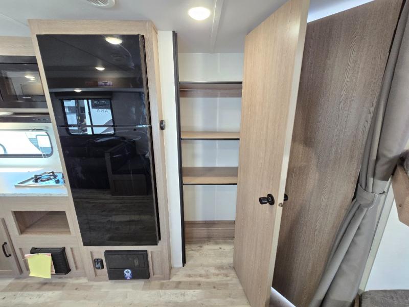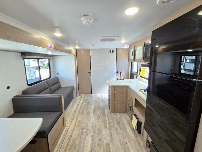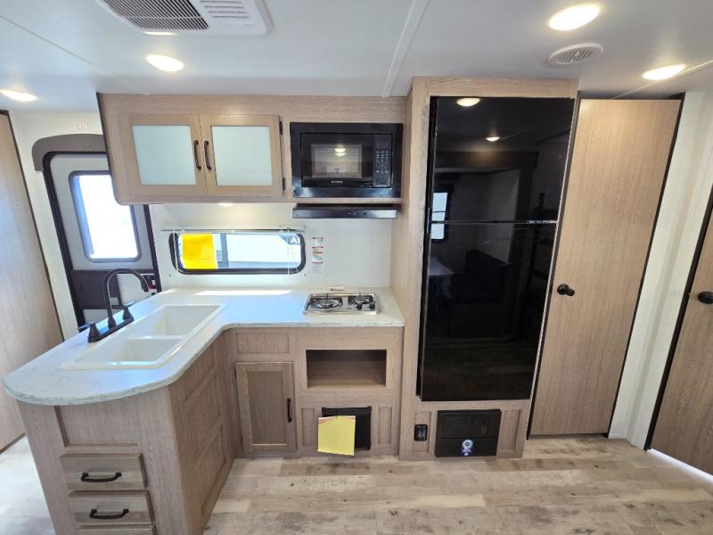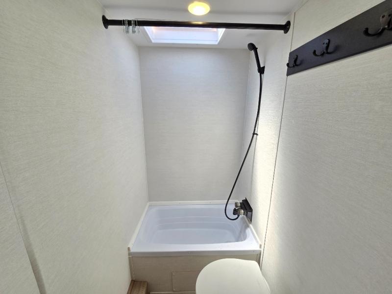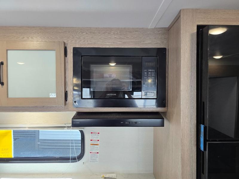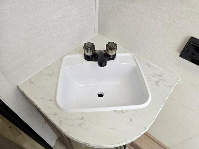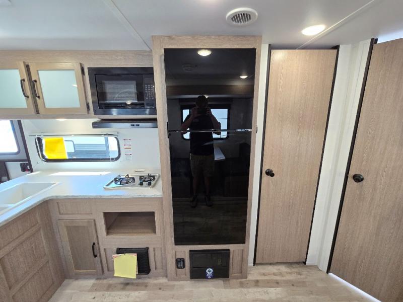 Invite more along with double-size bunks in this 'Show Stopper' travel trailer! The private shower and toilet is close to the bunks if you're camping with little ones making it quite convenient, especially at night. You will be comfortable on the front RV queen bed with dual bedside nightstands and shirt closets. The kitchen features everything you need to create meals and snacks for your entire family, and the outside pass-through storage allows you to easily tuck away your gear like fishing poles, camp chairs and games, plus more!