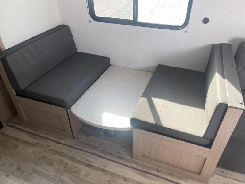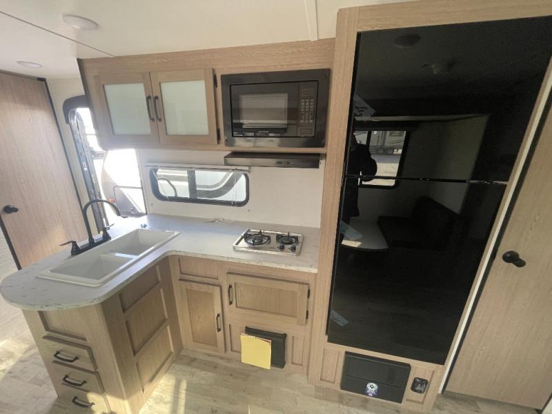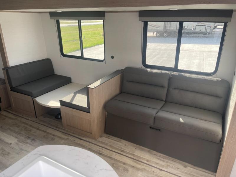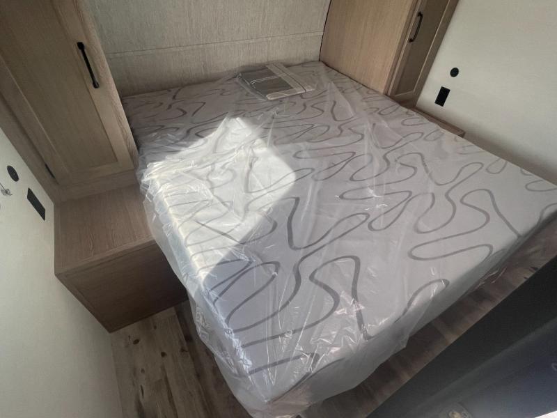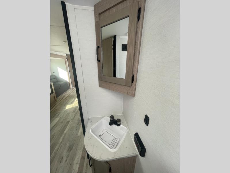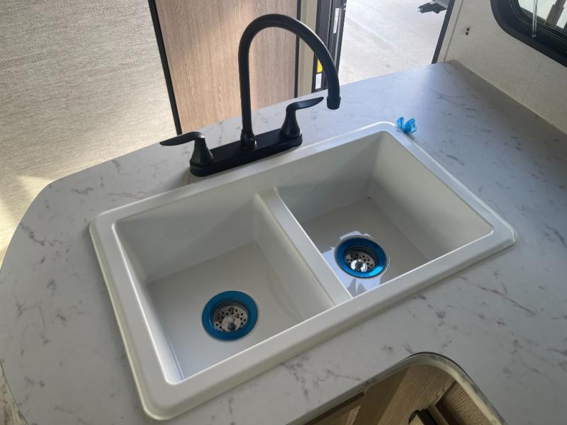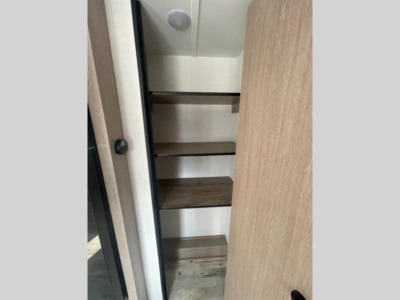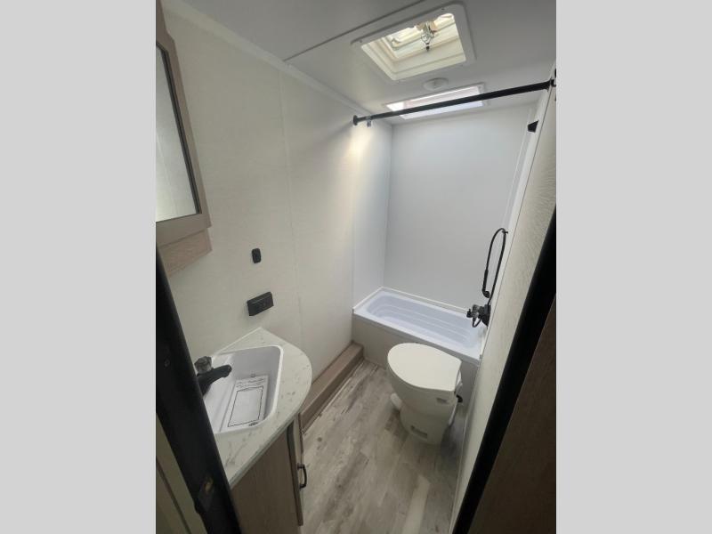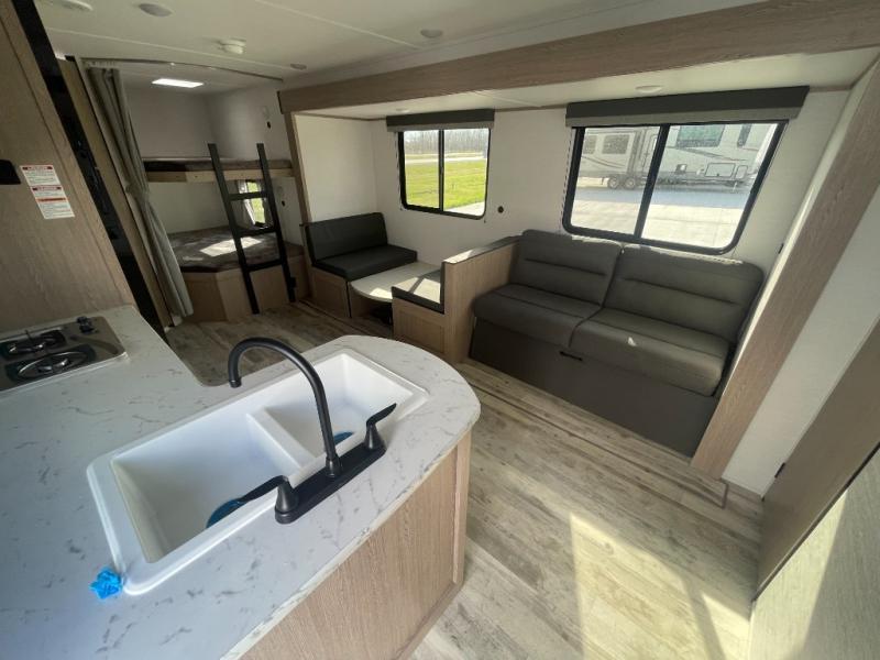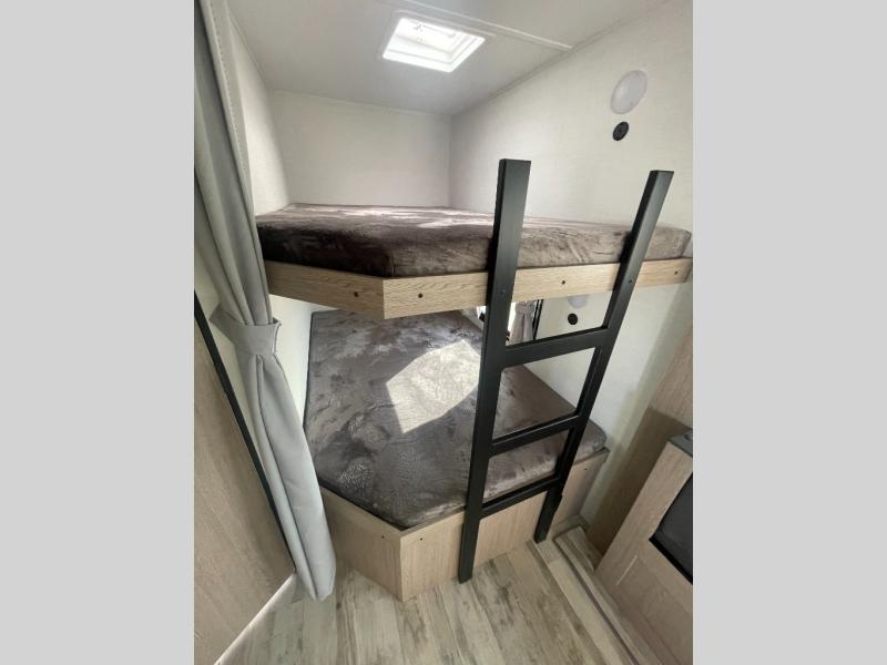 Invite more along with double-size bunks in this 'Show Stopper' travel trailer! The private shower and toilet is close to the bunks if you're camping with little ones making it quite convenient, especially at night. You will be comfortable on the front RV queen bed with dual bedside nightstands and shirt closets. The kitchen features everything you need to create meals and snacks for your entire family, and the outside pass-through storage allows you to easily tuck away your gear like fishing poles, camp chairs and games, plus more!
