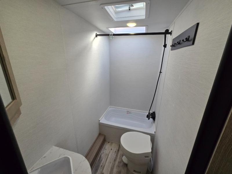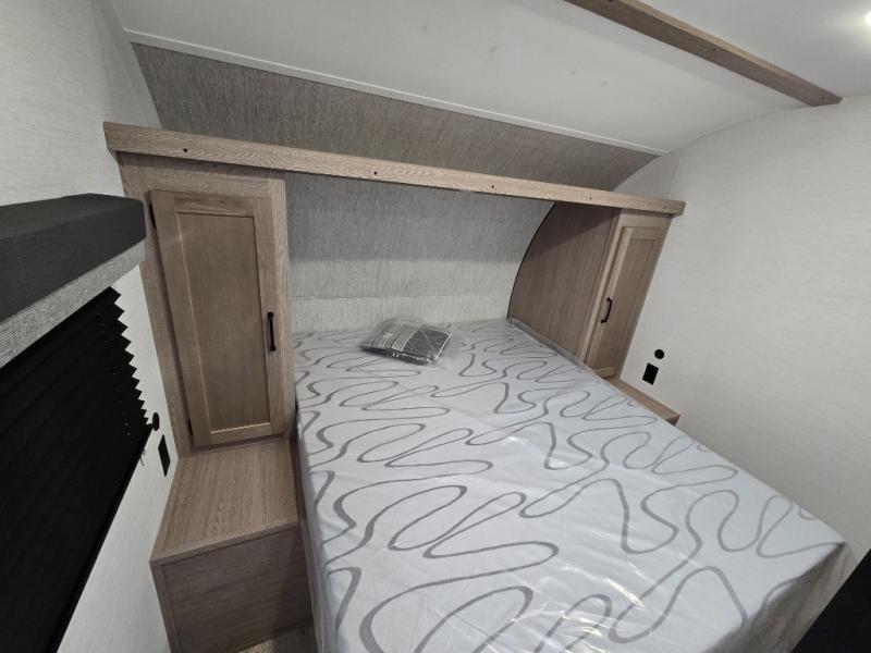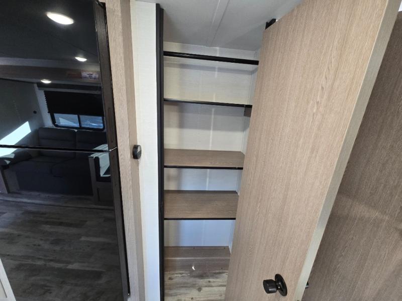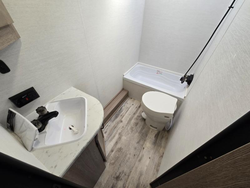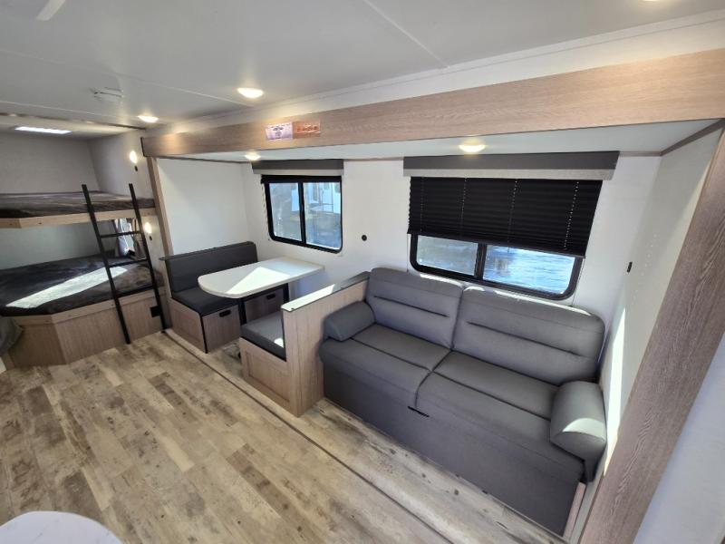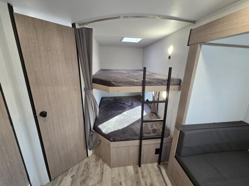 Invite more along with double-size bunks in this 'Show Stopper' travel trailer! The private shower and toilet is close to the bunks if you're camping with little ones making it quite convenient, especially at night. You will be comfortable on the front RV queen bed with dual bedside nightstands and shirt closets. The kitchen features everything you need to create meals and snacks for your entire family, and the outside pass-through storage allows you to easily tuck away your gear like fishing poles, camp chairs and games, plus more!