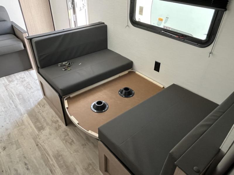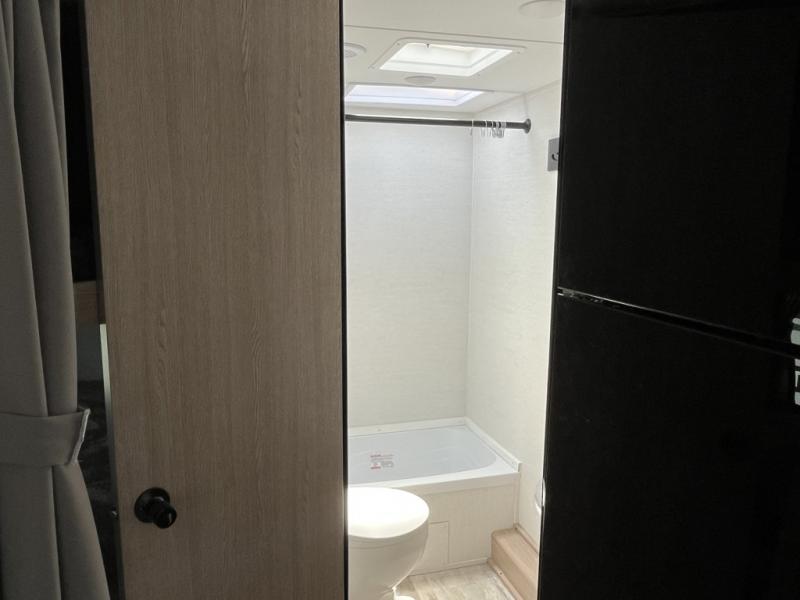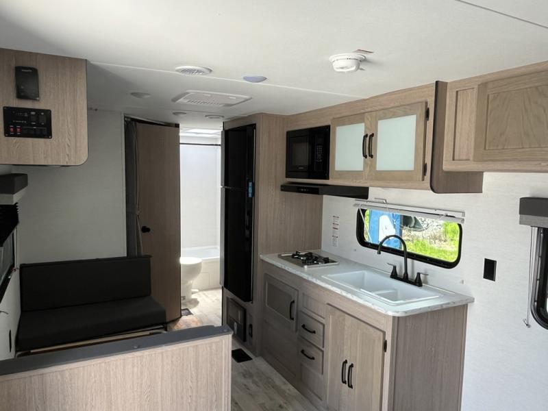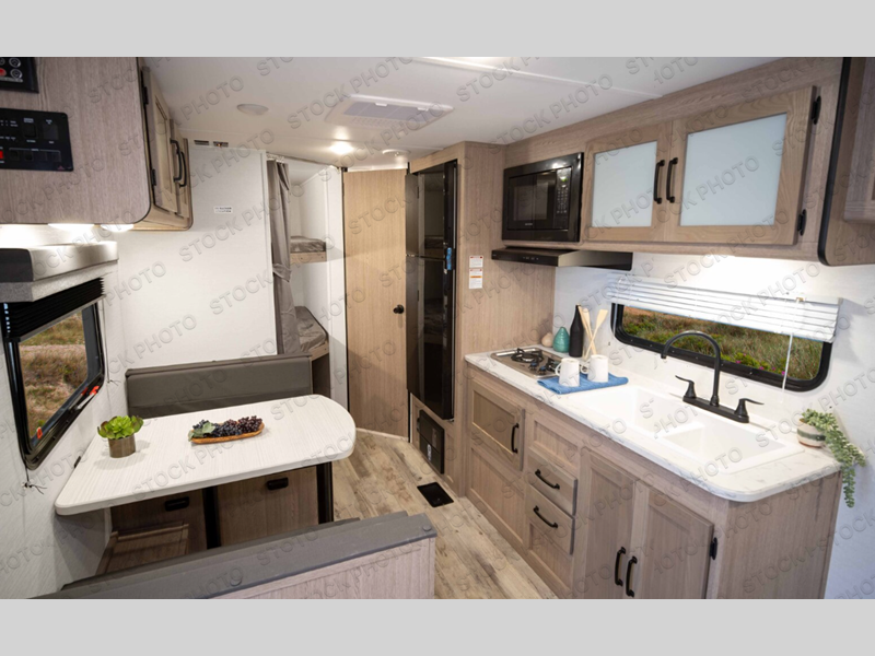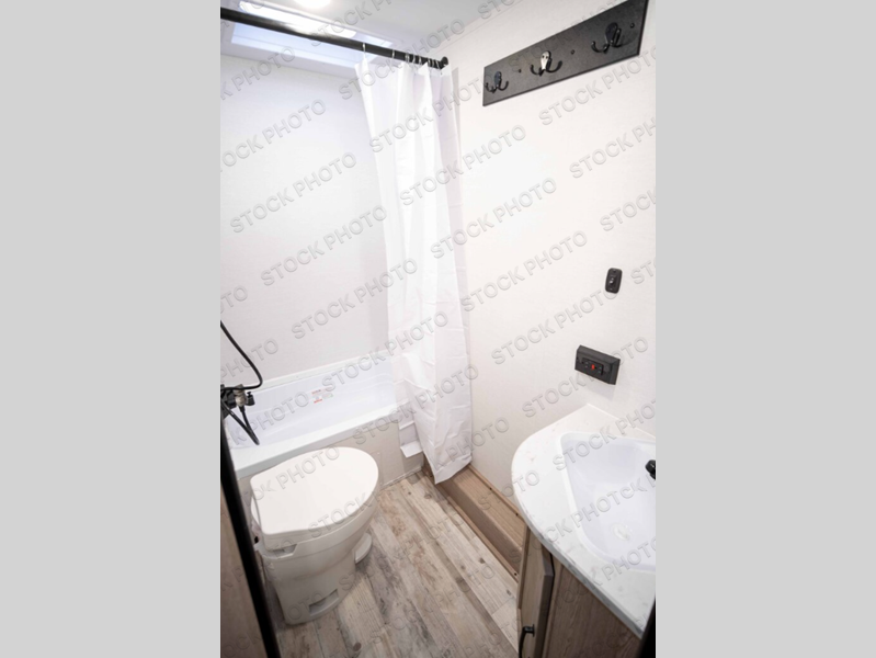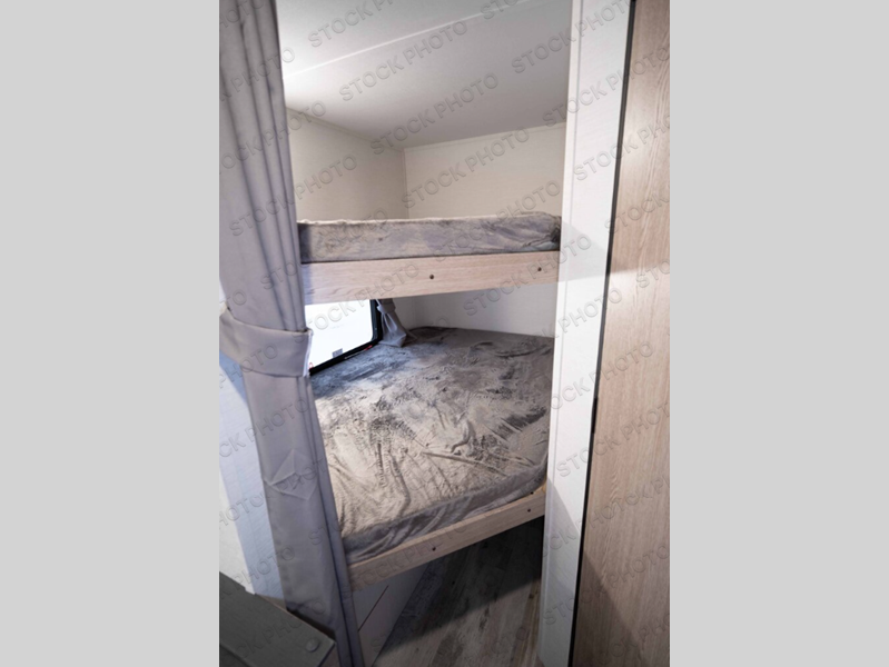 Make your reservations, start planning your menu, and load up your clothes, games, food and more for a fun weekend camping in this 'Show Stopper' trailer! You will have a front private bedroom with a queen-size bed and closets, while your family and friends can choose from the double-size bunks and furniture to sleep on. There is a convertible sofa and a booth dinette, plus a galley kitchen with a microwave oven, sink, plus overhead storage for pots, pans, and dry goods. The rear corner full bathroom offers a tub/shower, toilet, and a sink to be able to get cleaned up in after hiking or relaxing by a fire.