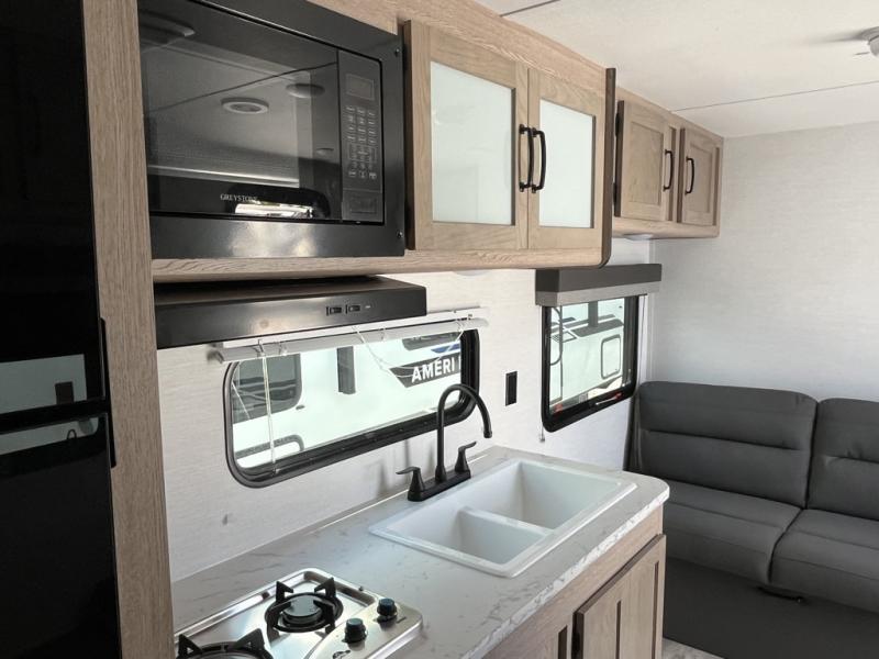 The Ameri-Lite Ultra Lite travel trailers by Gulf Stream are the perfect RV for families wanting to start their camping lifestyle, but not break the bank. These lightweight units are built with a diamond plate lower front, a one-piece synthetic vinyl roof, and a uni-body construction with steel hurricane straps tying the walls to the floor for added durability. The front power hitch jack and four stabilizer jacks will make set-up hassle-free once you arrive at the campground, and you can put out the electric awning to rest in the shade when you're done. Each model includes convenient amenities, like the 13,500 BTU A/C, the tankless water heater, a central control panel, and multiple USB ports for your tablet, phone, and camera! The inside is designed to make you feel at home with radiant LED lighting, designer kitchen backsplash, pleated privacy shades, craft-made cabinetry, plus many more features. Start your RV lifestyle with an affordable, lightweight Ameri-Lite Ultra Lite travel trailer today!