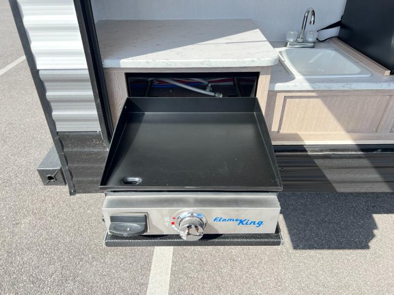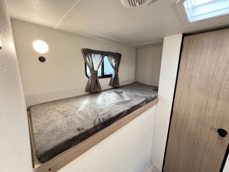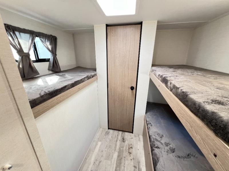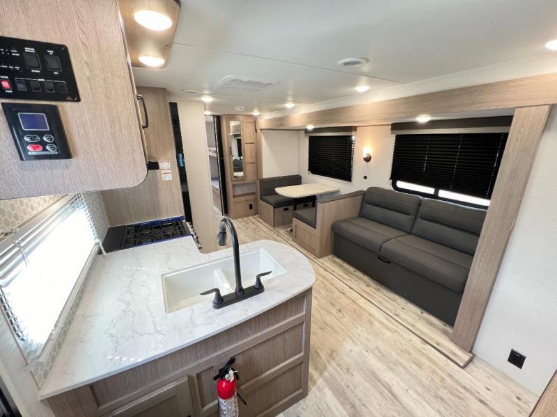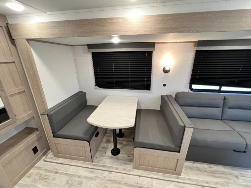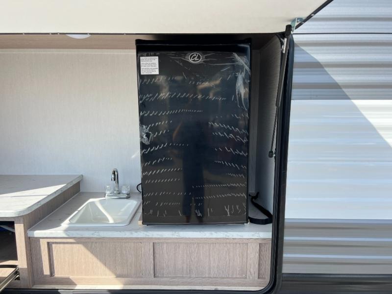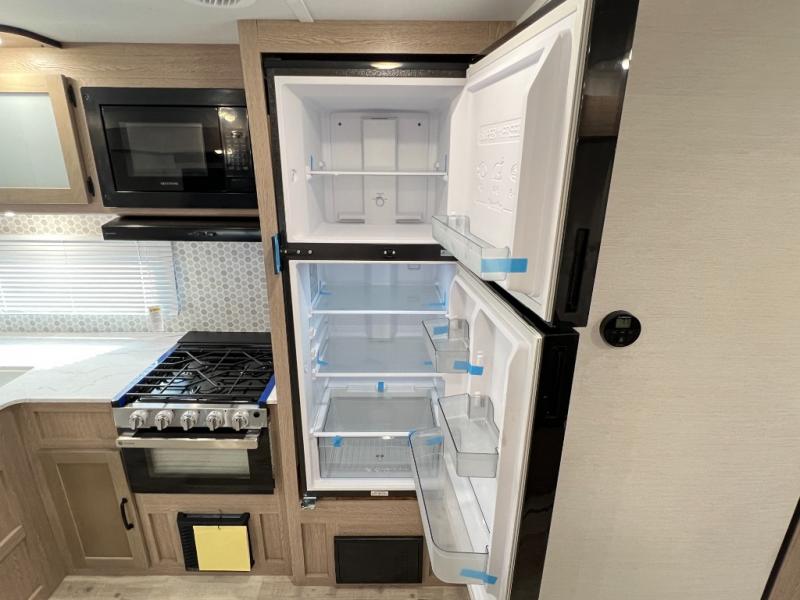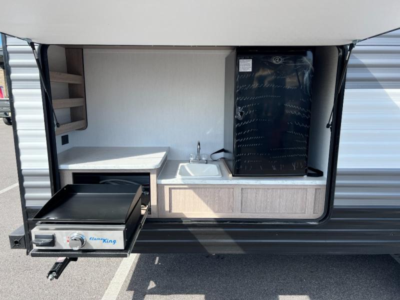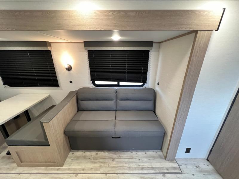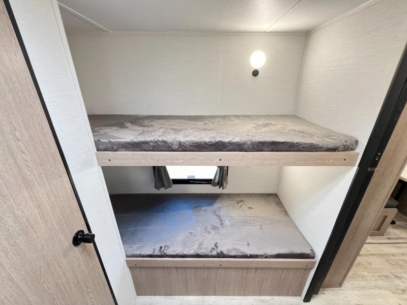 A private bunkhouse for your guests or the kids, and a private bedroom up front make this the perfect travel trailer for camping adventures. The large slide out includes the booth dinette and sofa, which will be great to dine at and relax, and the full bath is easily accessible for everyone. The kitchen includes everything you need to prepare meals each day, including a three burner cooktop and a 10.7 cu. ft. Everchill refrigerator/freezer for perishables. You can also choose to add the optional outside kitchen if you are one that loves to spend a lot of time outdoors!