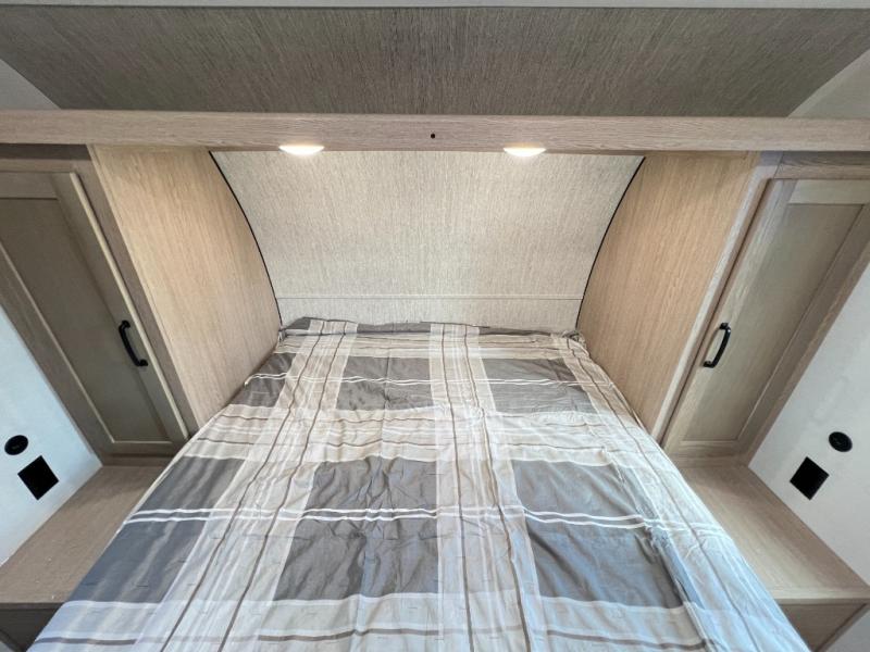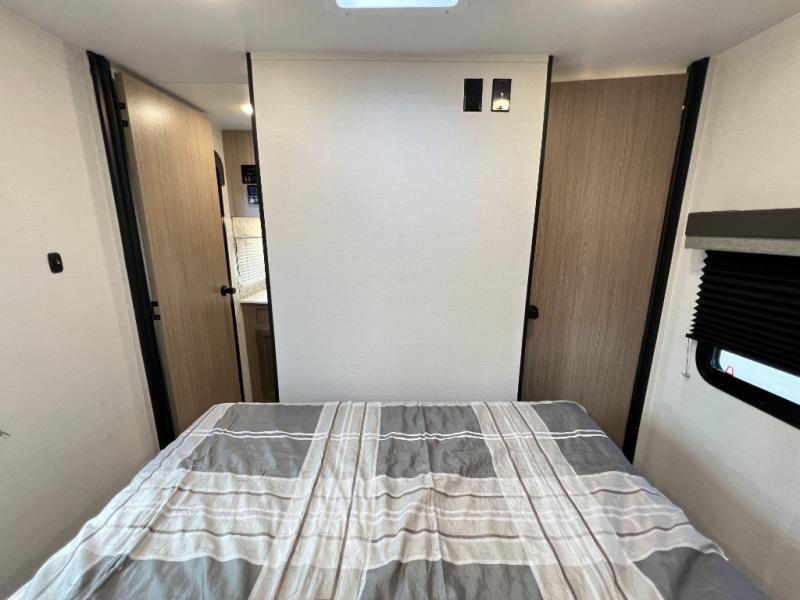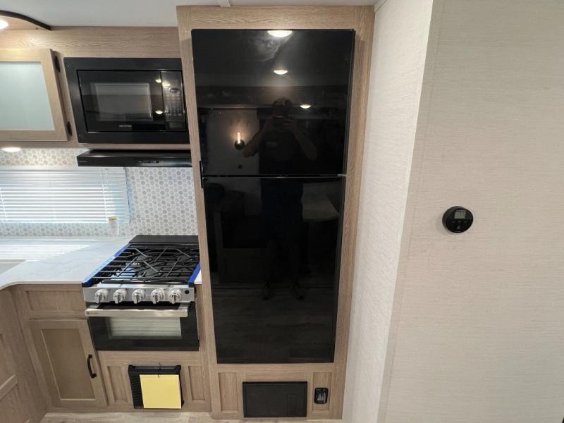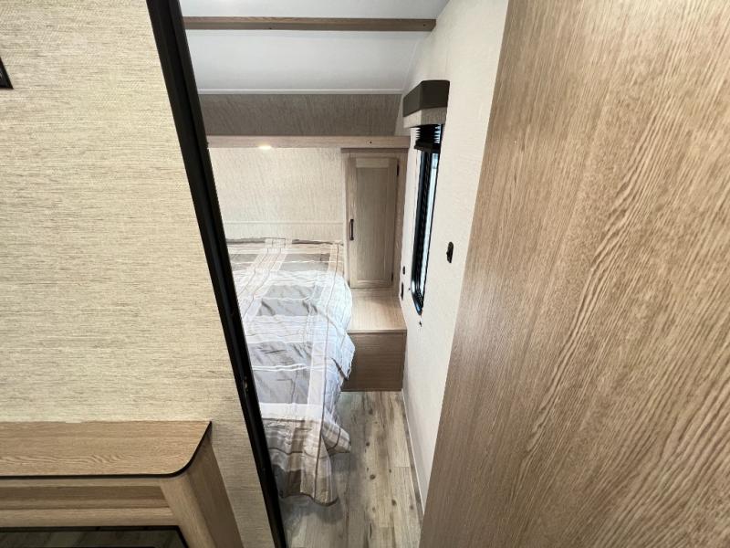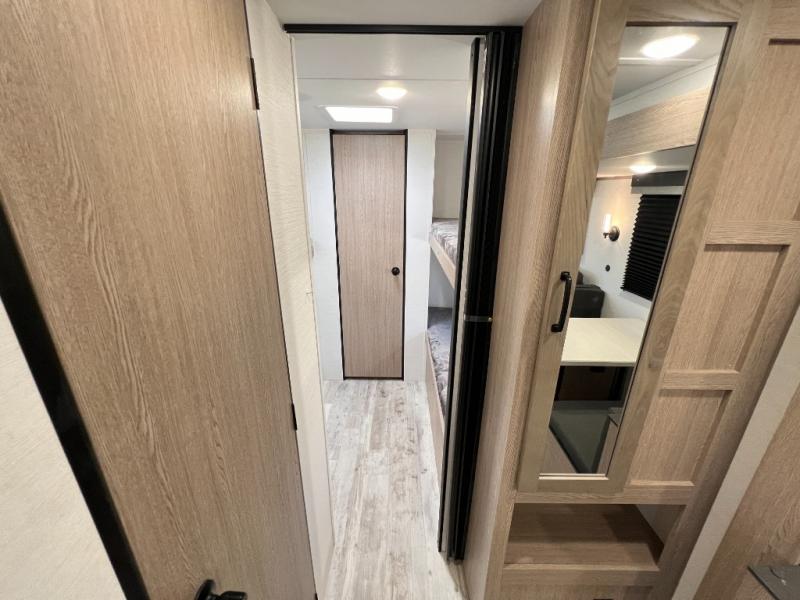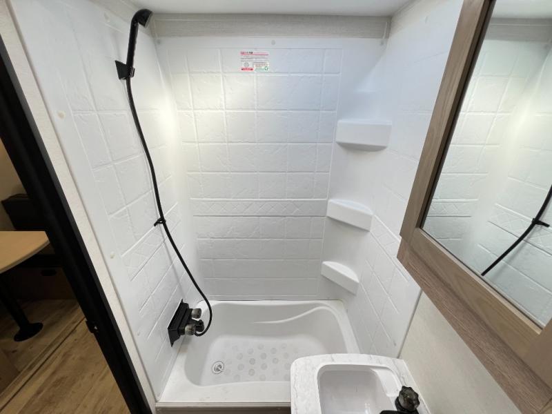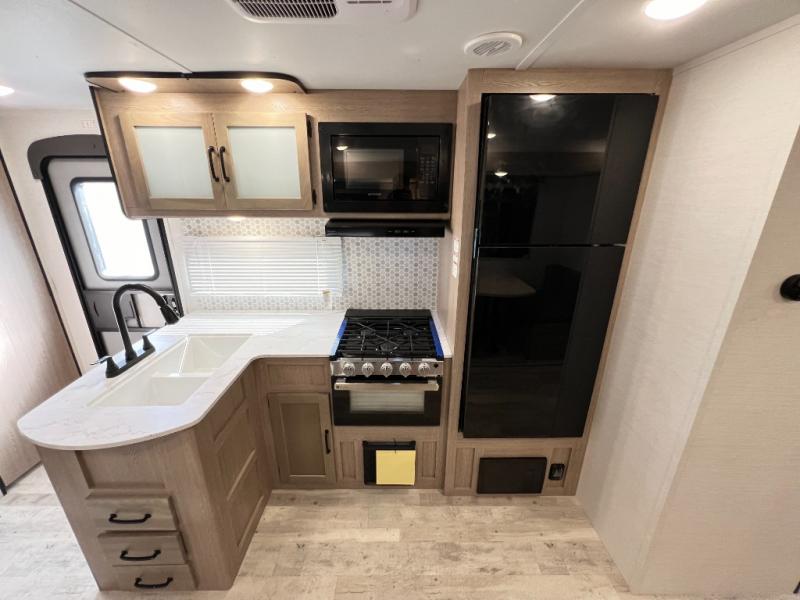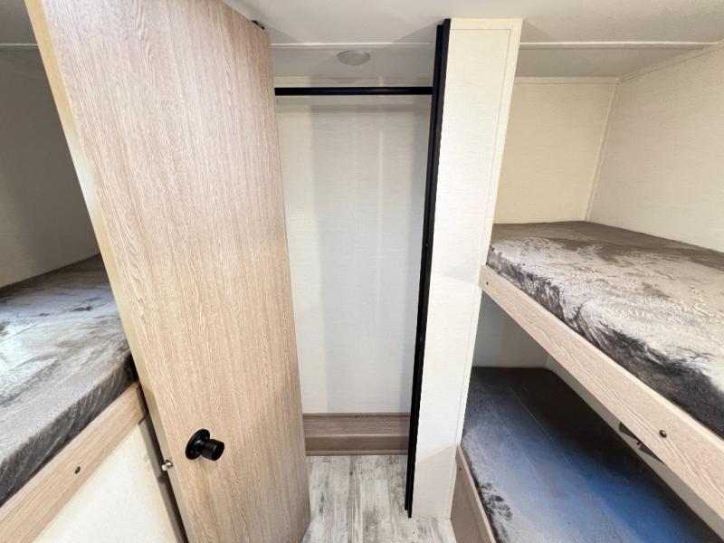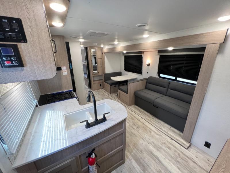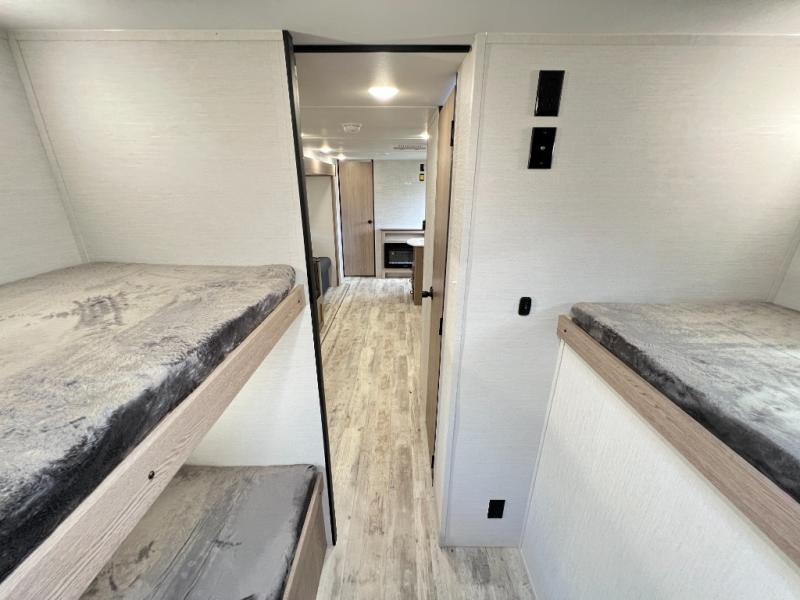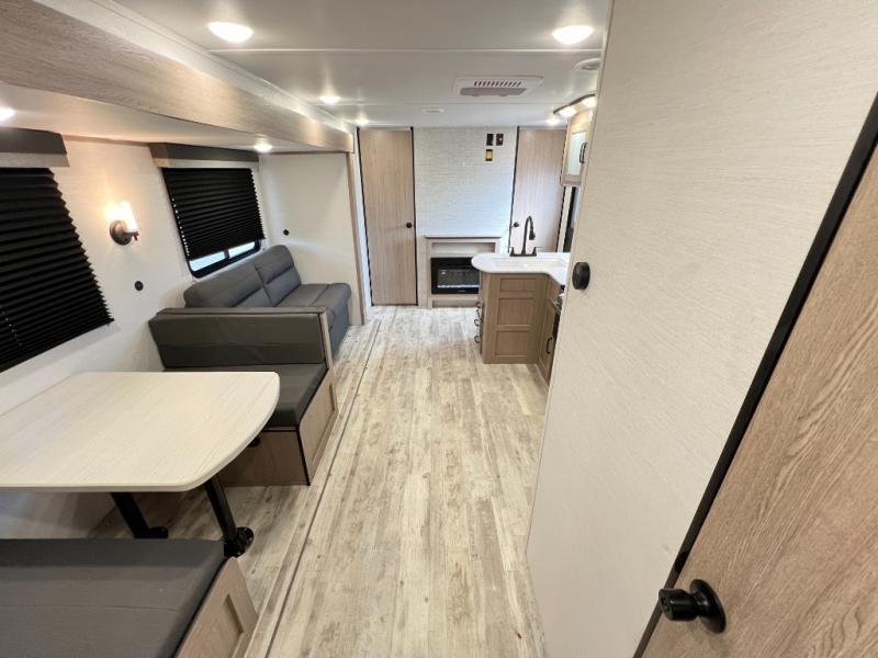A private bunkhouse for your guests or the kids, and a private bedroom up front make this the perfect travel trailer for camping adventures. The large slide out includes the booth dinette and sofa, which will be great to dine at and relax, and the full bath is easily accessible for everyone. The kitchen includes everything you need to prepare meals each day, including a three burner cooktop and a 10.7 cu. ft. Everchill refrigerator/freezer for perishables. You can also choose to add the optional outside kitchen if you are one that loves to spend a lot of time outdoors!