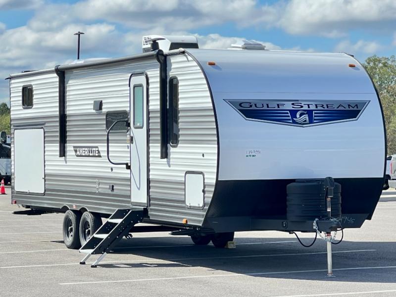 The Ameri-Lite Ultra Lite travel trailers by Gulf Stream are the perfect RV for families wanting to start their camping lifestyle, but not break the bank. These lightweight units are built with a diamond plate lower front, a one-piece synthetic vinyl roof, and a uni-body construction with steel hurricane straps tying the walls to the floor for added durability. The front power hitch jack and four stabilizer jacks will make set-up hassle-free once you arrive at the campground, and you can put out the electric awning to rest in the shade when you're done. Each model includes convenient amenities, like the 13,500 BTU A/C, the tankless water heater, a central control panel, and multiple USB ports for your tablet, phone, and camera! The inside is designed to make you feel at home with radiant LED lighting, designer kitchen backsplash, pleated privacy shades, craft-made cabinetry, plus many more features. Start your RV lifestyle with an affordable, lightweight Ameri-Lite Ultra Lite travel trailer today!