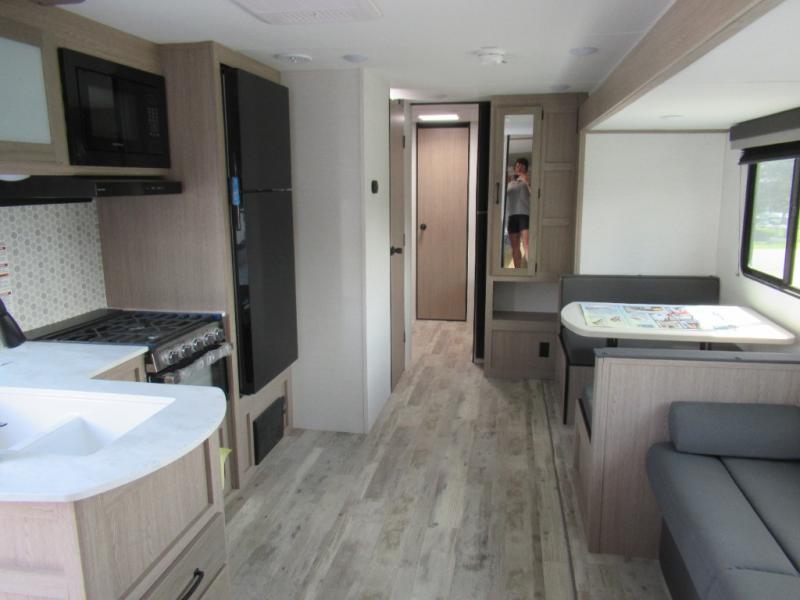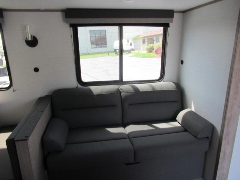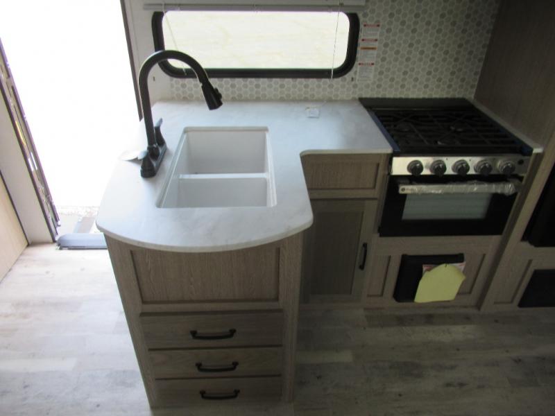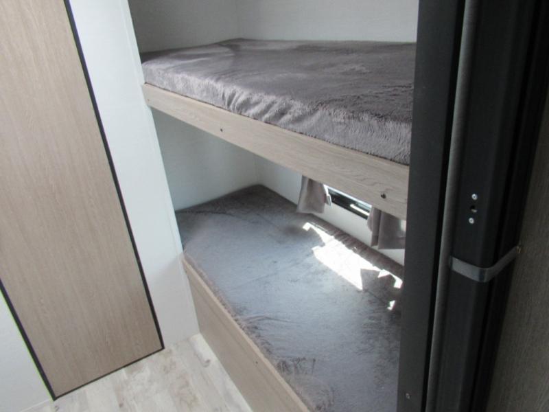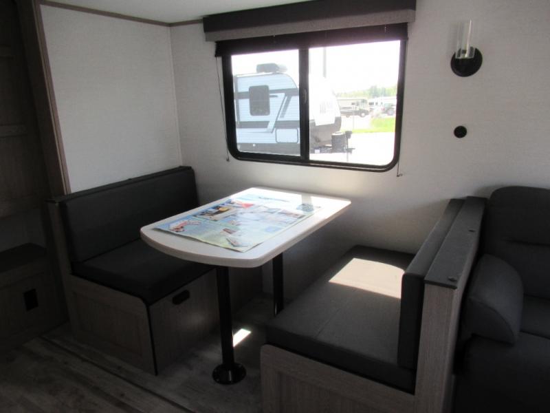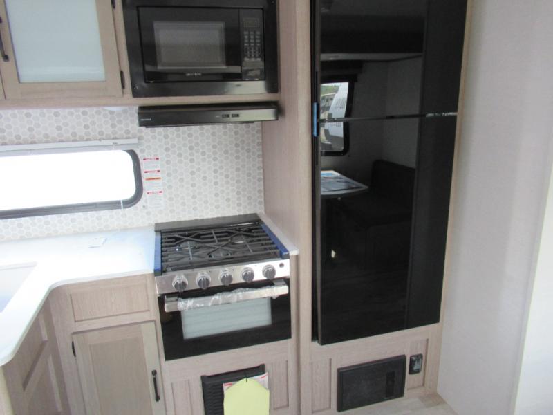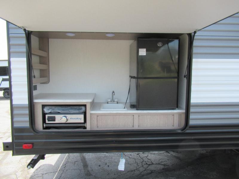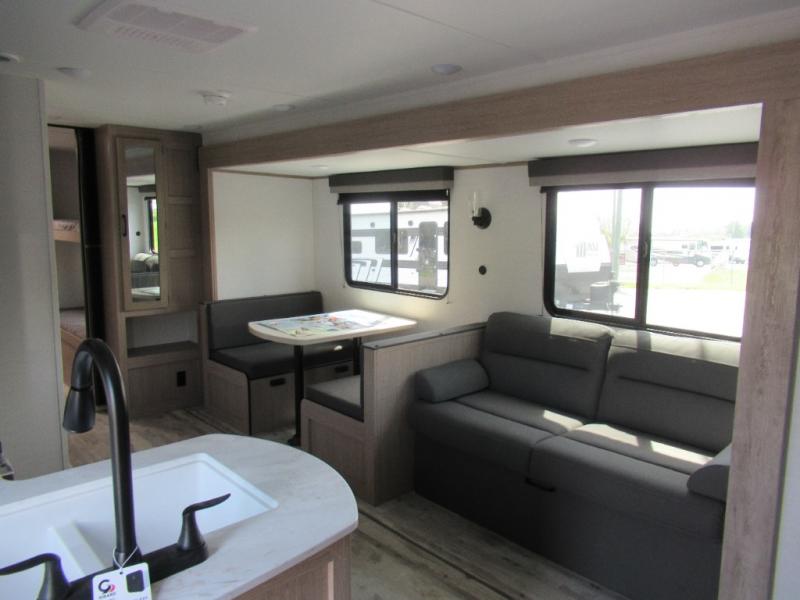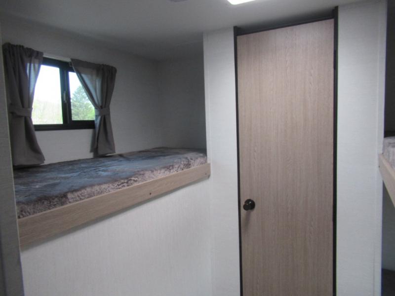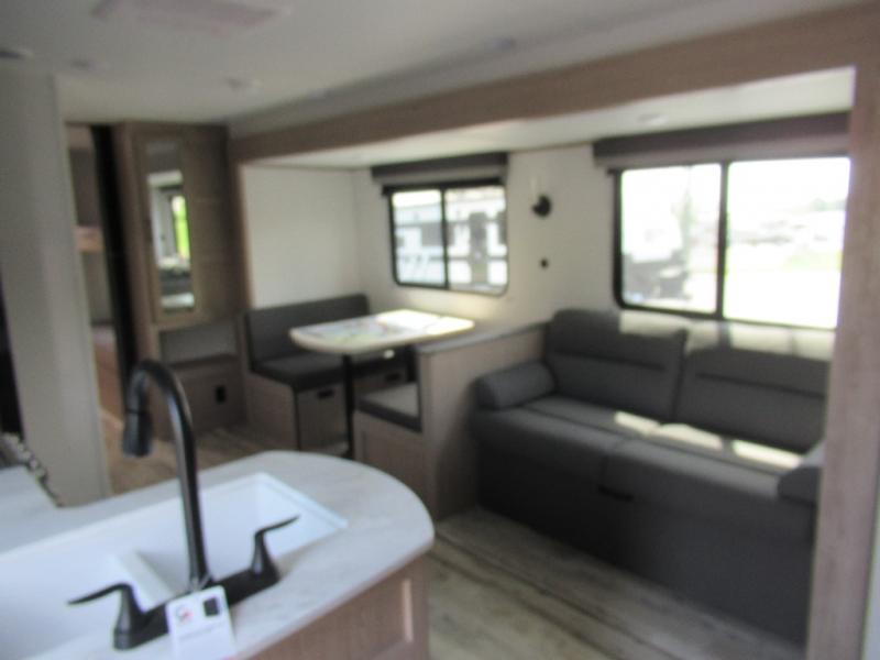 A private bunkhouse for your guests or the kids, and a private bedroom up front make this the perfect travel trailer for camping adventures. The large slide out includes the booth dinette and sofa, which will be great to dine at and relax, and the full bath is easily accessible for everyone. The kitchen includes everything you need to prepare meals each day, including a three burner cooktop and a 10.7 cu. ft. Everchill refrigerator/freezer for perishables. You can also choose to add the optional outside kitchen if you are one that loves to spend a lot of time outdoors!