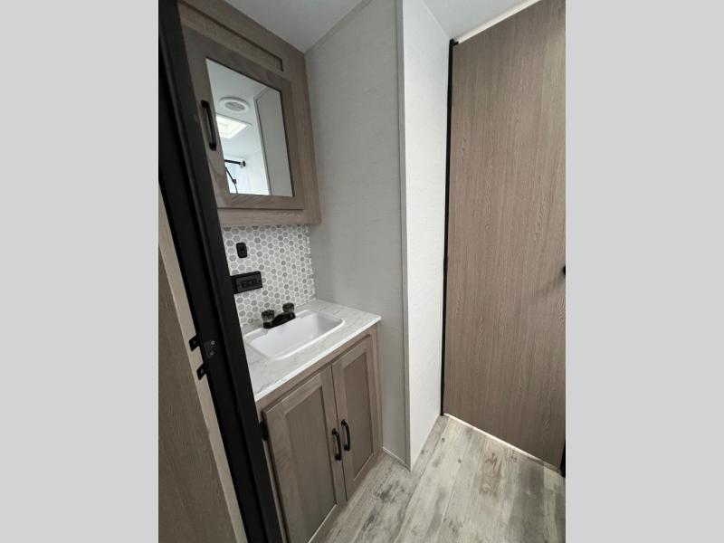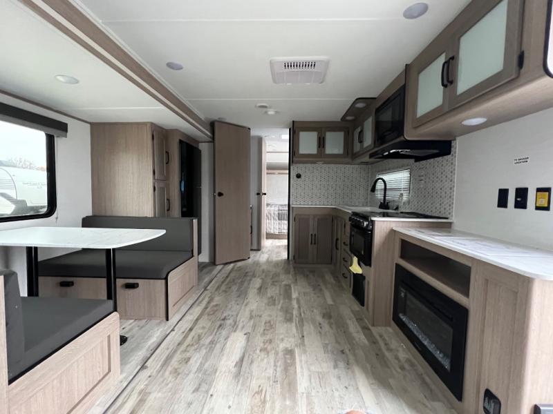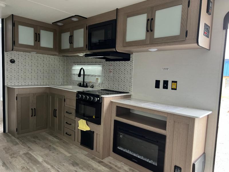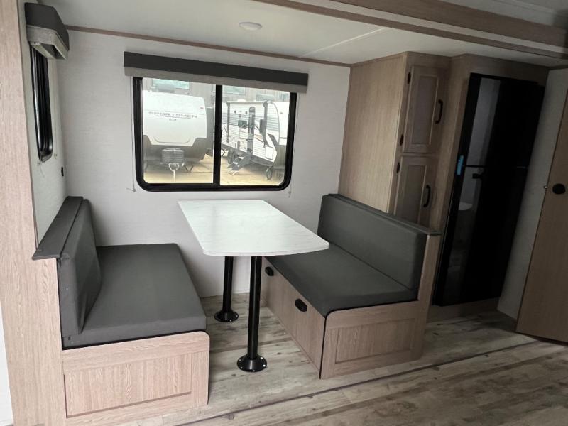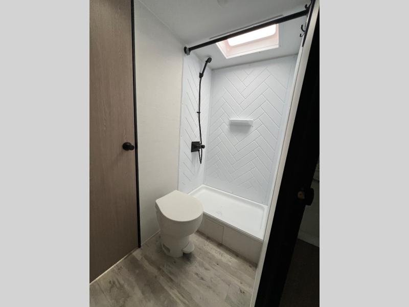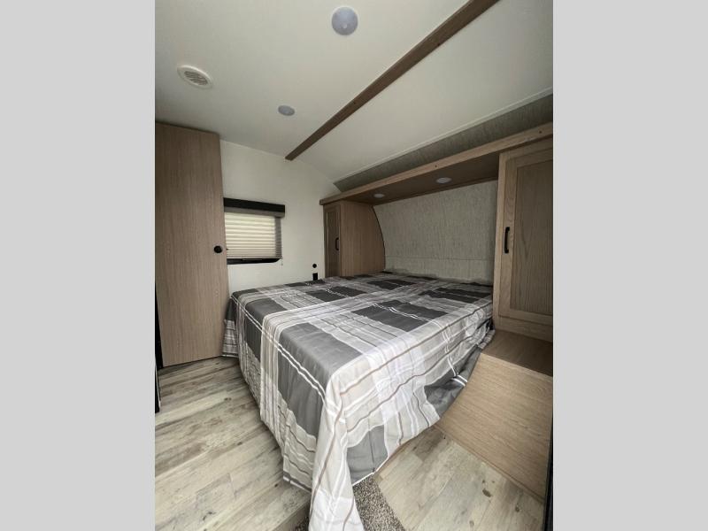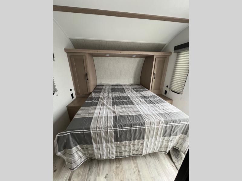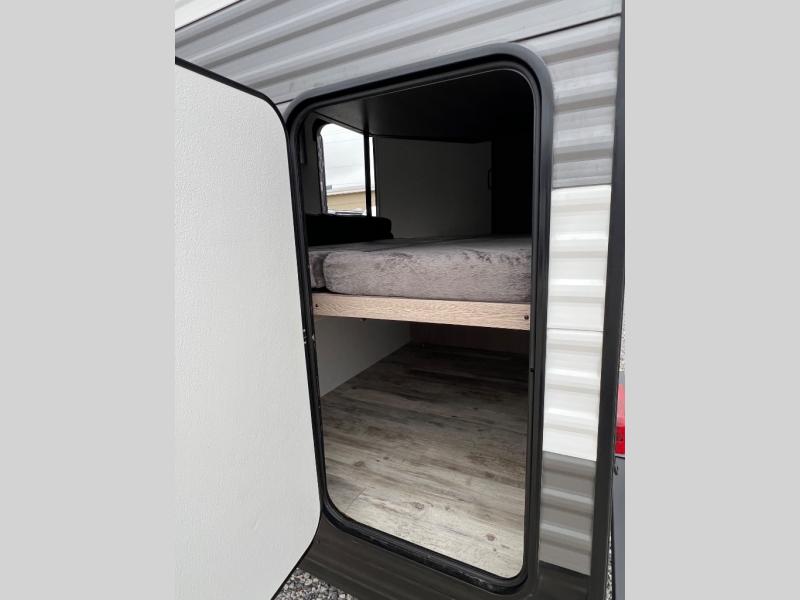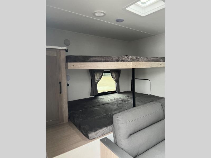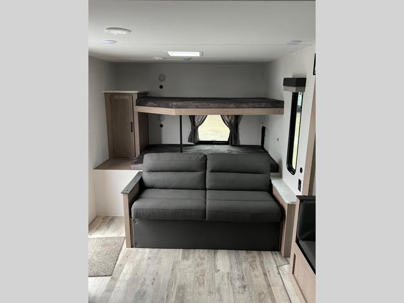 This travel trailer is perfect for a family thanks to its several spaces for rest on the road like the queen bed for you and your partner, the double size bunks for kids, and a sofa for guests, who will also have tons of fun thanks to the entertainment center place in front of the sofa. This unit also has a lot of space to store things and belongings like a closet, shirt closet, and wardrobe beside the bed, pass-thru storage ideal for all your gear, a closet beside the double-size bunk, and an overhead cabinet and pantry in the kitchen. Also, in the kitchen area, you will find a refrigerator, sink, a three-cooktop burner, and a dinette, perfect for enjoying each meal of the day. Finally, take a relaxing bath in the incredible full pass-through bathroom.