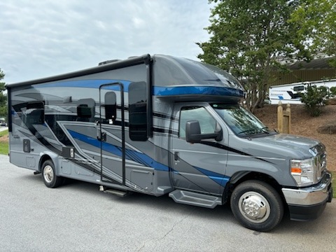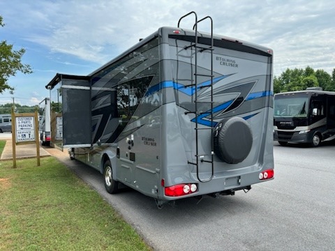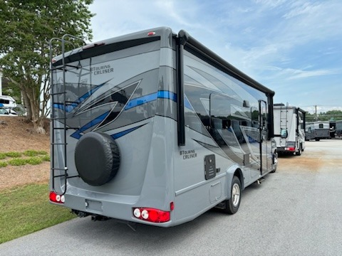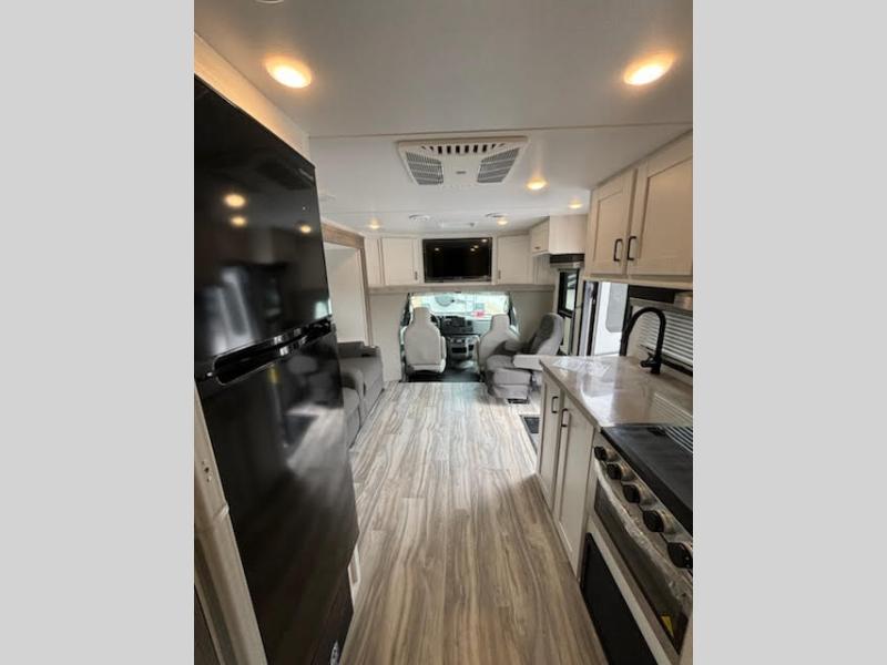 Cruise the countryside in this coach with your favorite person plus two more if you wish! The full bathroom is convenient while on the road or at your campsite and includes linen storage. You can sleep on one of the two twin beds with a center aisle to easily get to the rear bathroom or the main living and kitchen area up front. You will find overhead storage above the cab which has 2-way driver and passenger seats, plus a chair and U-shaped dinette slide to relax on. And the dinette offers sleeping space when needed. The cook can whip up a meal using the kitchen appliances and you can dine inside, or outside under the electric awning, just add your camping chairs.