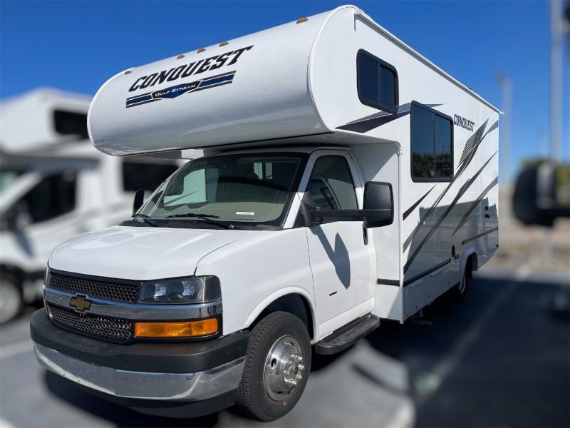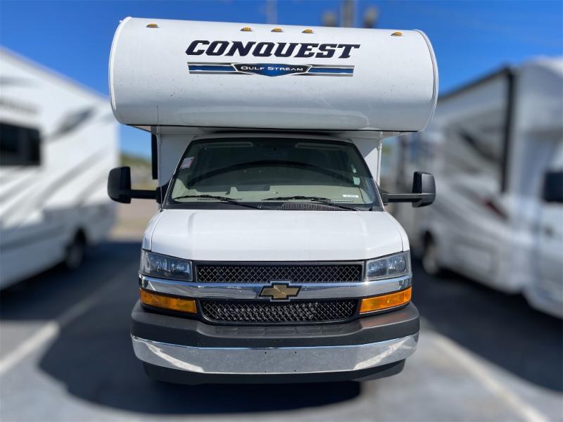 Each one of these Gulf Stream RV Conquest Class C LE Series gas motorhomes is built with a Cradle of Strength® on a Ford E350 chassis and a 7.3L V8 engine, or you can choose the optional Chevy chassis with a 6.0L V8 engine! Their construction also consists of a welded aluminum perimeter frame, an EPDM rubber roof, and a white fiberglass exterior that is ultra slick. There is solid wood cabinetry inside, along with upgraded interior fabrics, and two decor choices to best fit your style.