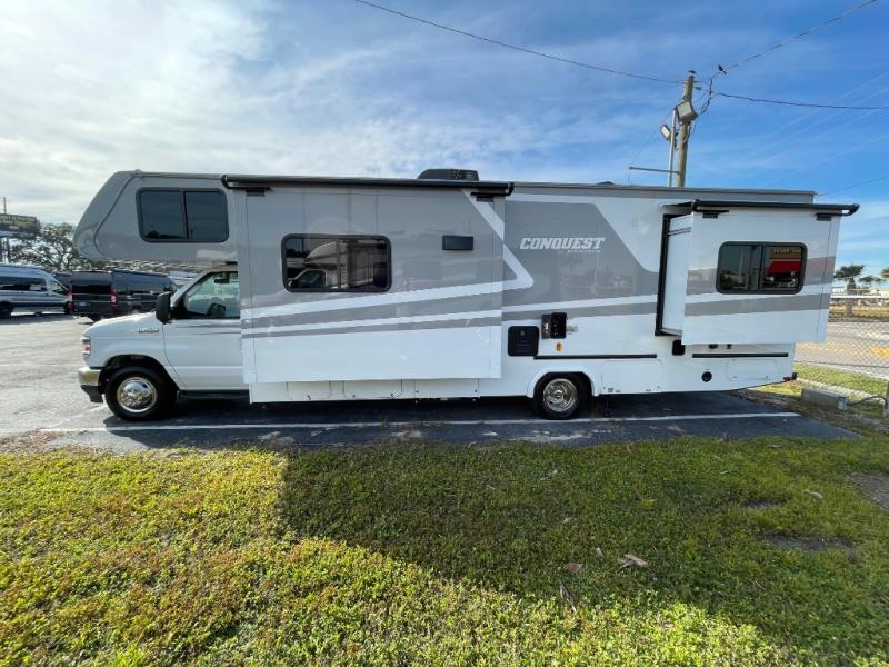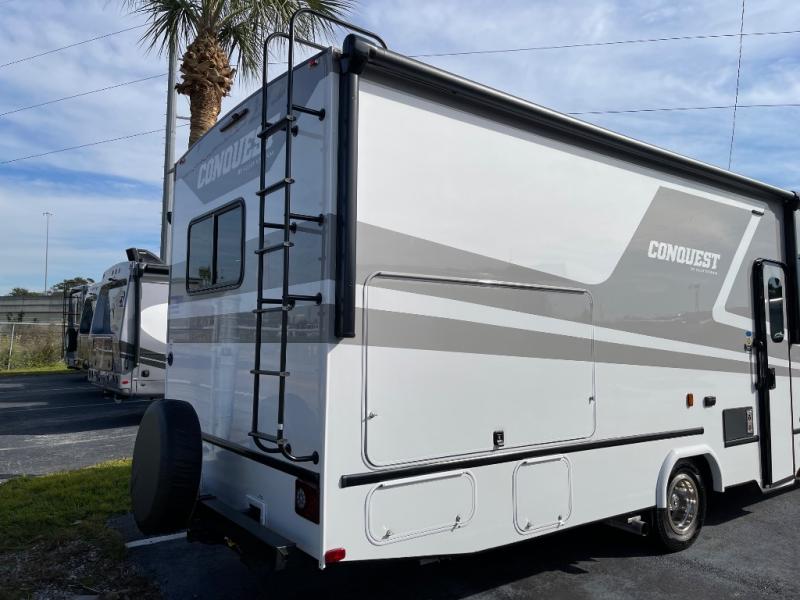 Imagine you and your family exploring new RV parks every chance you get with this Conquest Class C gas motorhome. The rear bedroom has a door that you can shut for privacy, and the separated bath has a skydome above the shower for extra room to rinse off each morning. You can cook meals on the three-burner range and visit with other RVers while relaxing on the jackknife sofa. This model also features an optional outside kitchen with a 32" HDTV!