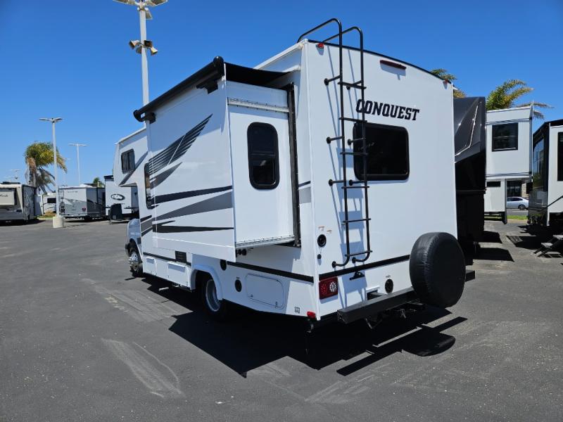 This Conquest Class C LE Series gas motorhome is a real treat to have as you cross the country making your way to scenic destinations! You will find an RV queen bed in the back of this coach so that you can stop and rest your head whenever it is convenient for you, and you will also be able to whip up a meal at any time with the three-burner range in the kitchen. The refrigerator will store your dairy and produce so that it is fresh and ready to be snacked on, and you will enjoy having a closet to use for various items, like your garments or cleaning supplies.
