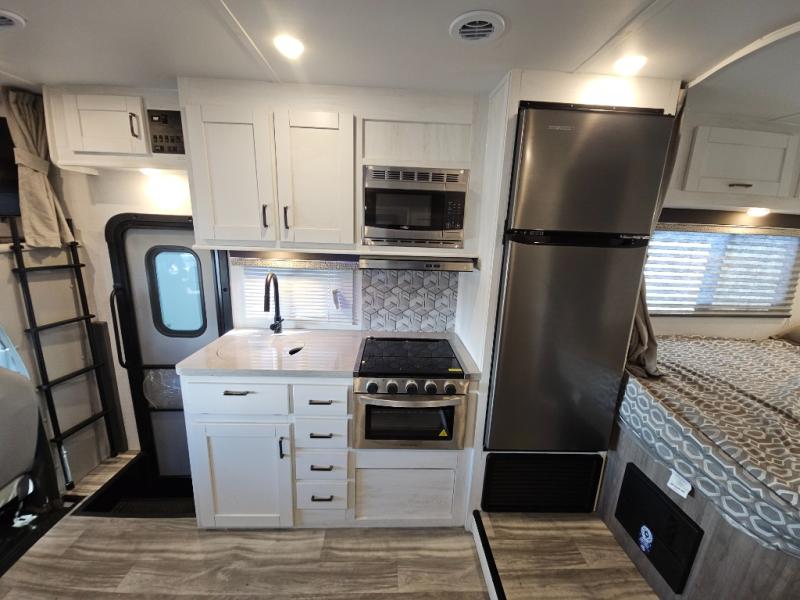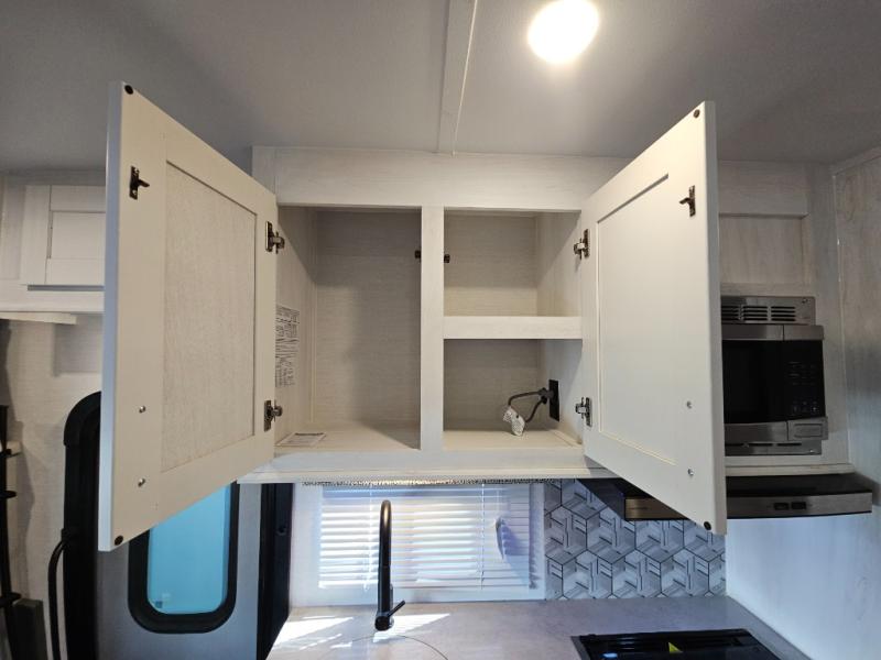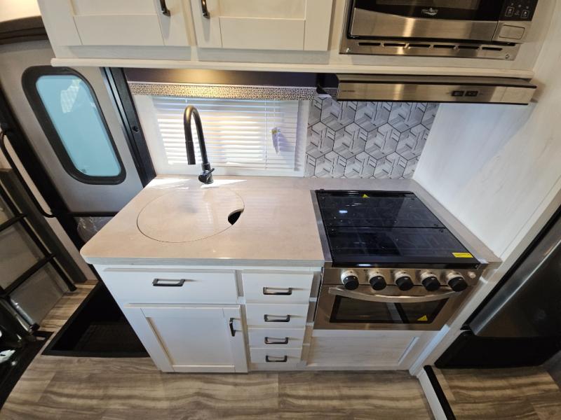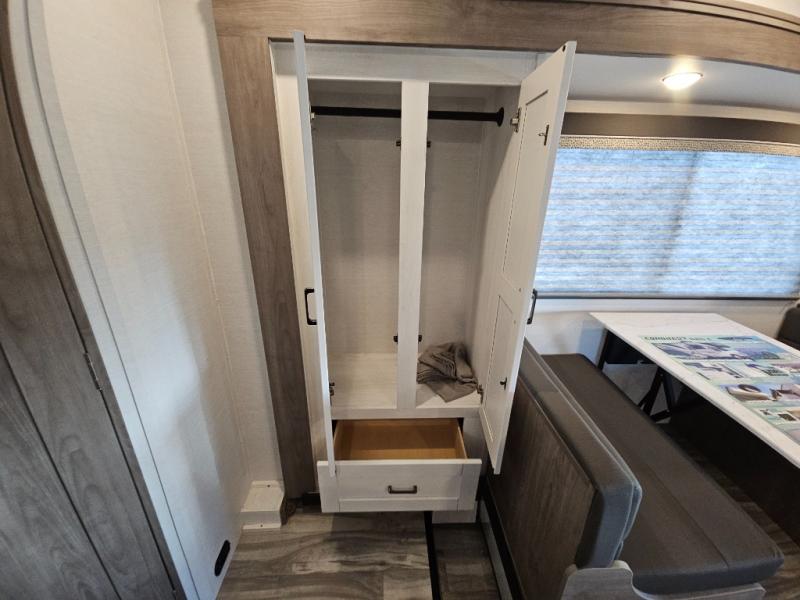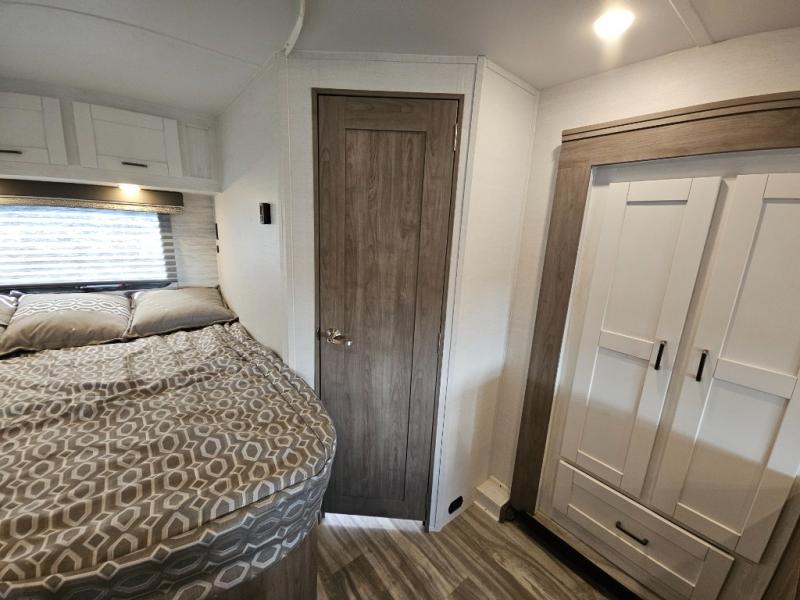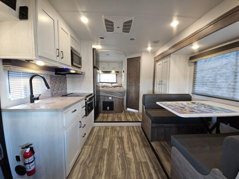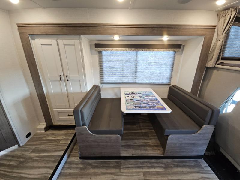 If you enjoy traveling the countryside during the day and pulling off into your favorite campground at night, then check out the comfortable accommodations this motorhome has to offer. For your group of five, you will have enough sleeping space between the RV queen bed in the rear, the overhead bunk above the cab, and the booth dinette. The kitchen provides everything you will need to cook all your meals and store leftovers, plus the dinette allows you to eat inside without worrying about bugs swarming you. The electric awning offers another living space outdoors, and it comes with LED lights so that you can party with the neighbors.