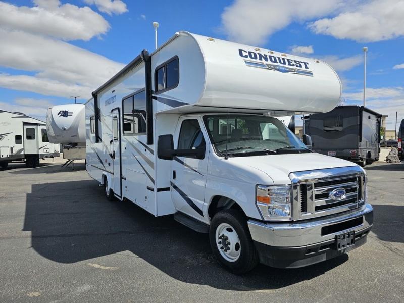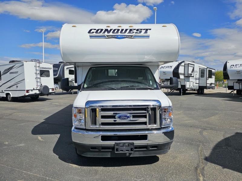 Each one of these Gulf Stream RV Conquest Class C LE Series gas motorhomes is built with a Cradle of Strength® on a Ford E350 chassis and a 7.3L V8 engine, or you can choose the optional Chevy chassis with a 6.0L V8 engine! Their construction also consists of a welded aluminum perimeter frame, an EPDM rubber roof, and a white fiberglass exterior that is ultra slick. There is solid wood cabinetry inside, along with upgraded interior fabrics, and two decor choices to best fit your style.
