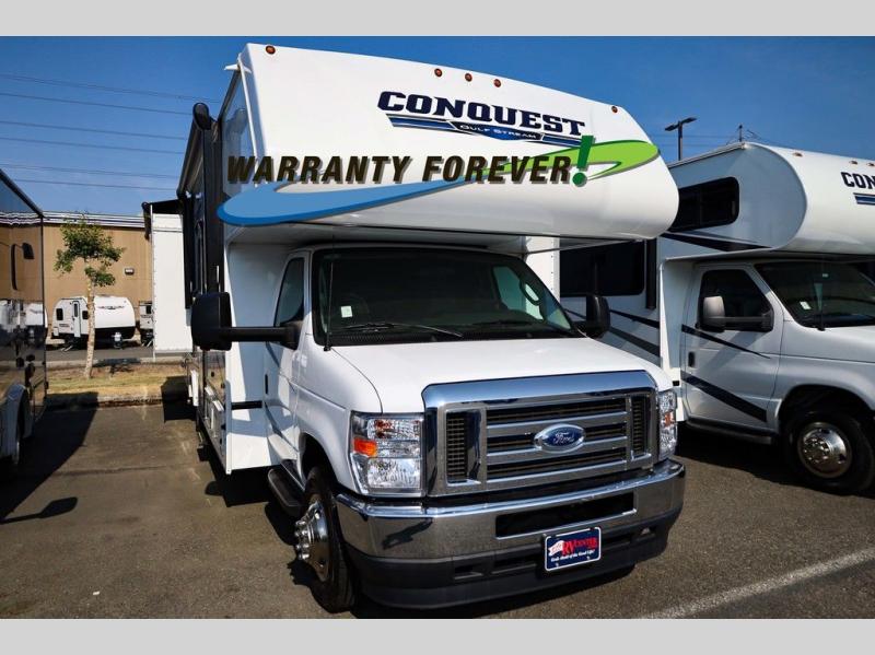 Each one of these Gulf Stream RV Conquest Class C gas motorhomes is built with a Cradle of Strength® on either the Ford E350 or E450 chassis depending on the model! Their construction also consists of a welded aluminum perimeter frame, an EPDM rubber roof, and high gloss white fiberglass sidewalls with Azdel substrate to prevent rotting. The included Conquest Luxury Package comes with vinyl flooring throughout for an easier clean, upgraded designer graphics, a dual-mounted stereo, and a back-up camera for easy parking.