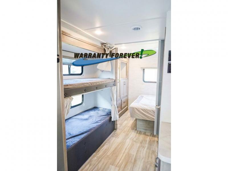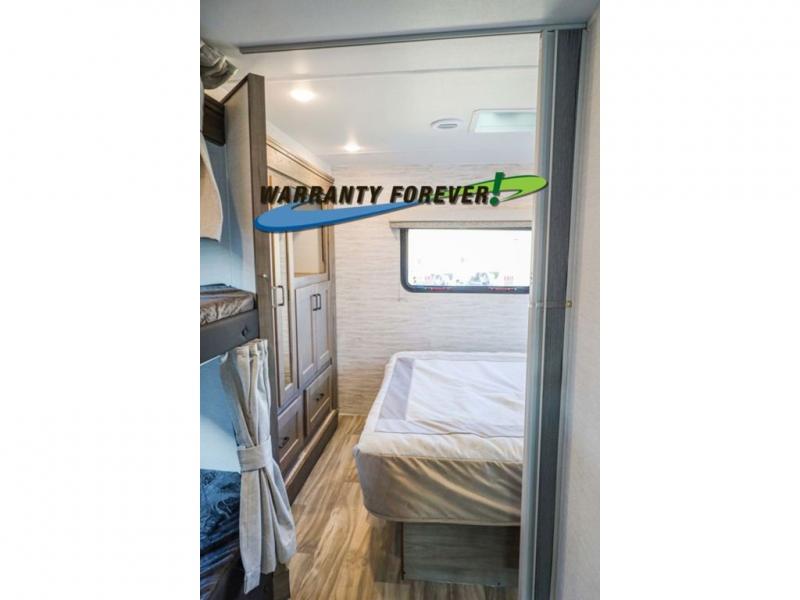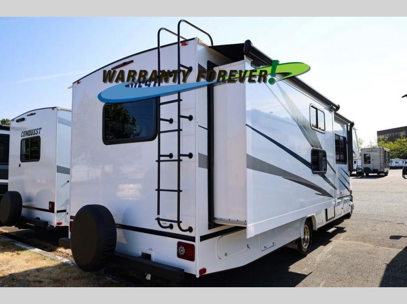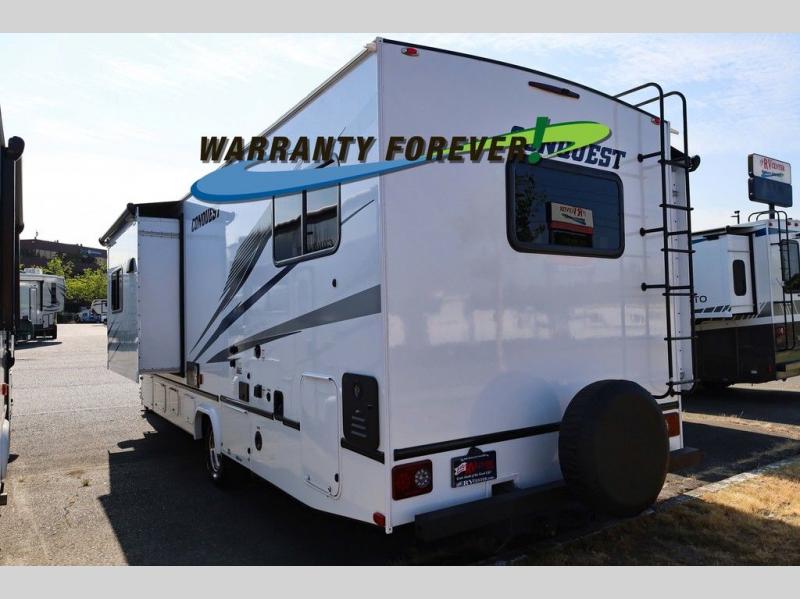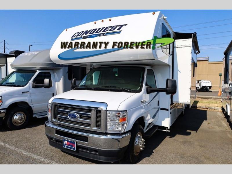 Looking for space for everyone and everything on your next road trip? With this Conquest Class C gas motorhome, you will find exterior and interior storage throughout including a bedroom wardrobe, overhead cabinets, and exterior basement storage. You will find sleeping space on the RV queen bed in the private bedroom, the set of bunk beds across from the bathroom, and the bunk over the cab. Additional sleeping space can be created when you maneuver the jackknife sofa and booth dinette into place. If you enjoy cooking, the kitchen has what you need with its three burner cooktop, microwave oven, and 10.2 cu. ft. 12V double door refrigerator/freezer!