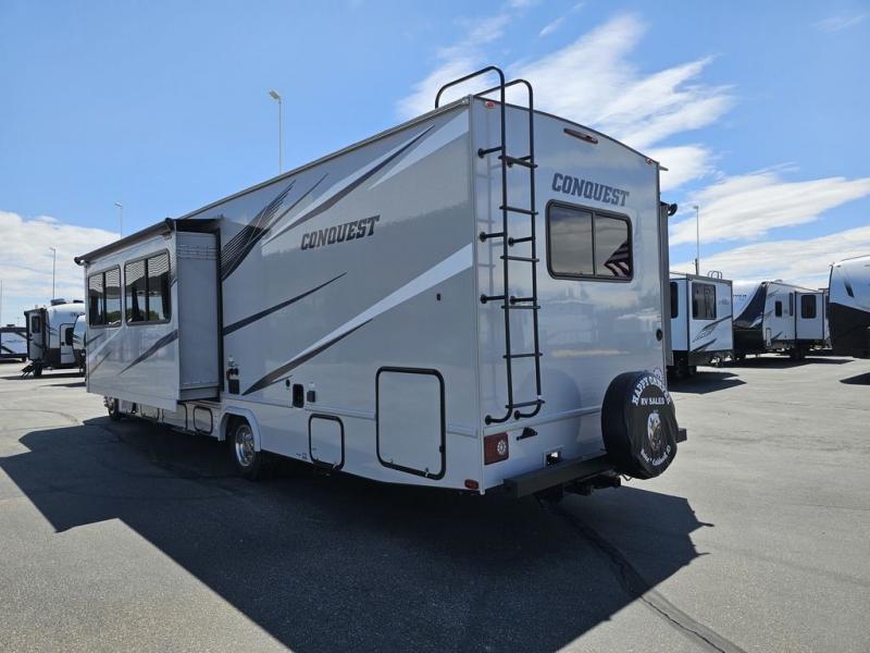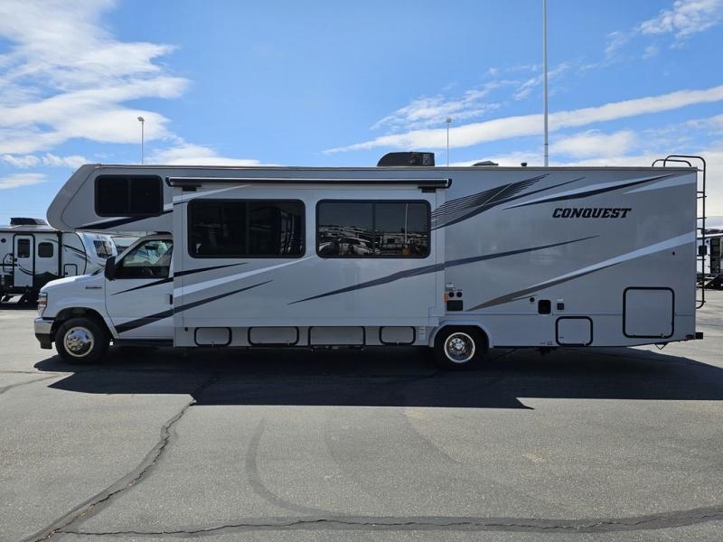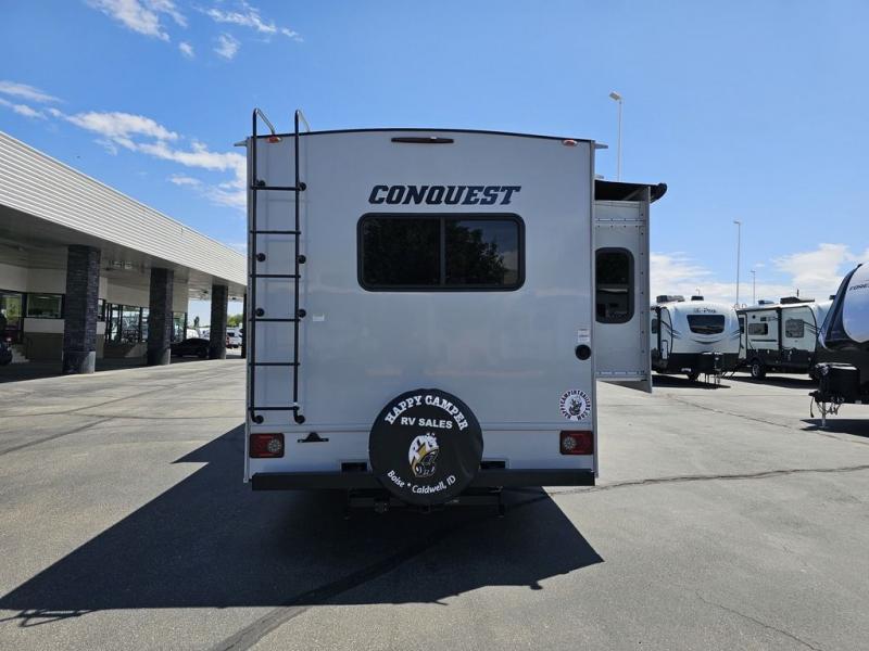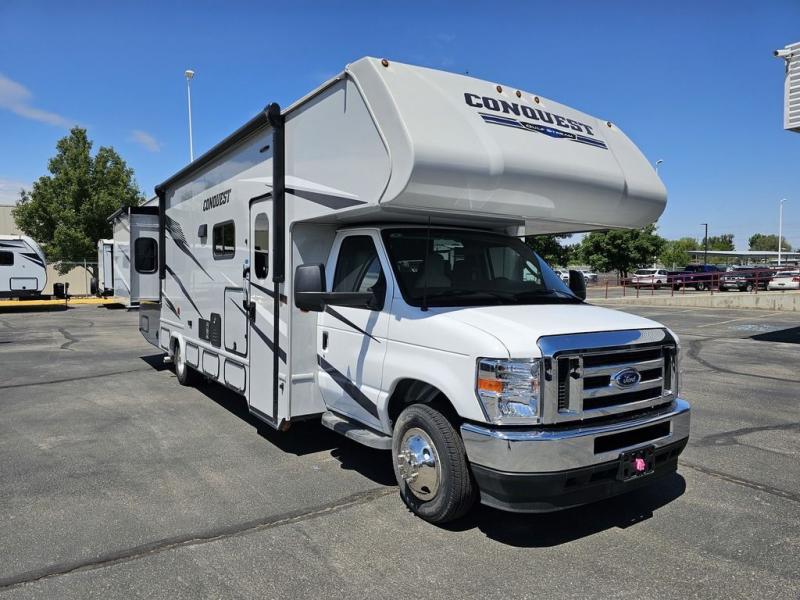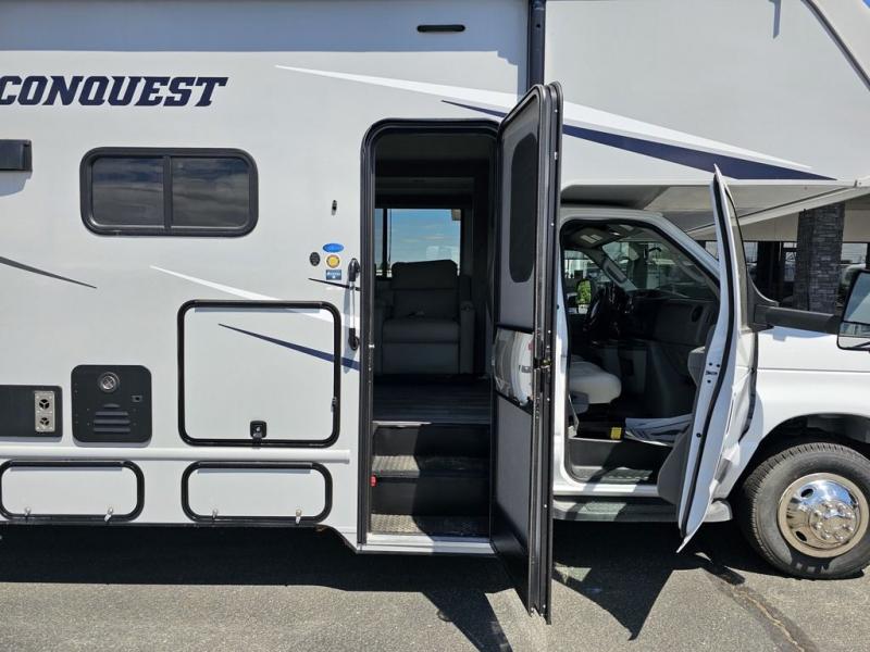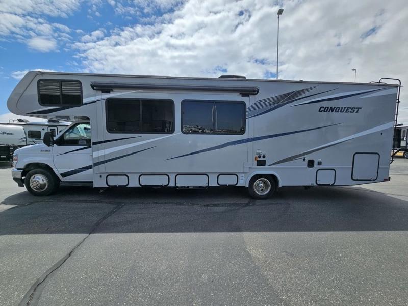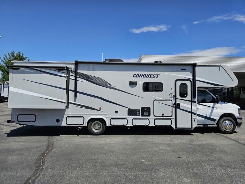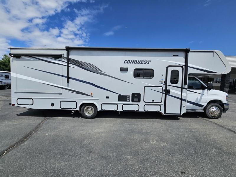 Set out to new destinations with this Conquest Class C gas motorhome to travel and stay in comfort! Your family will love having their own space to sleep with the bunk over the cab, which will be a hot spot for sure, the jackknife sofa and the booth dinette in the main living area, and the RV queen bed in the rear private bedroom. The kitchen offers all the appliances necessary to keep the crew fed, like a three-burner range, a microwave oven, and a double-door 12V refrigerator/freezer. You might even decide to add the optional outdoor entertainment center for more fun.