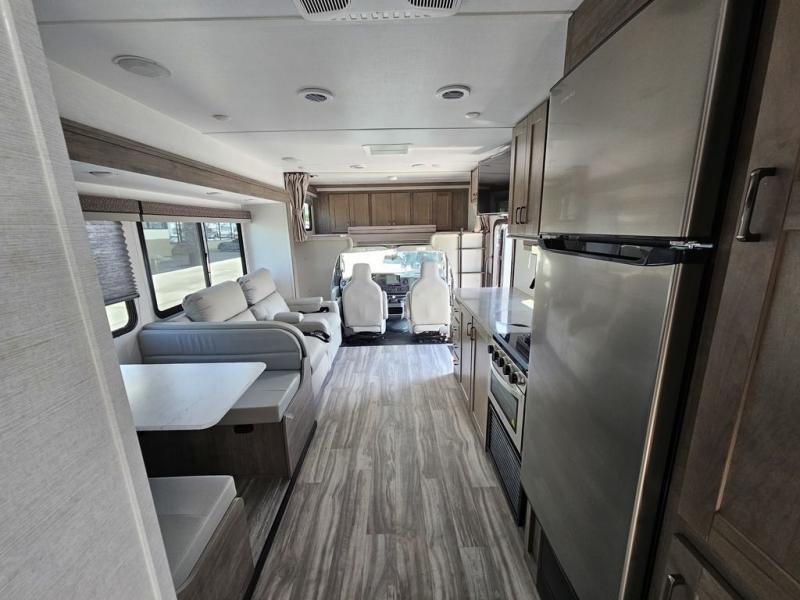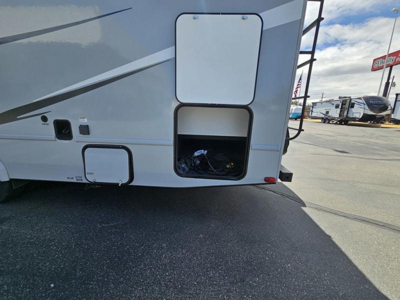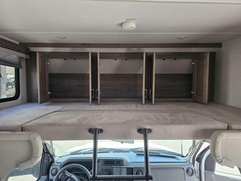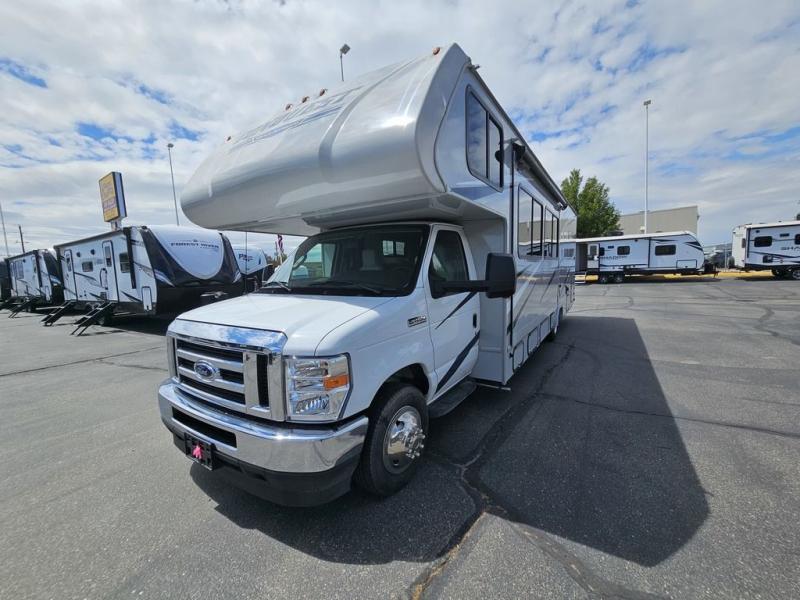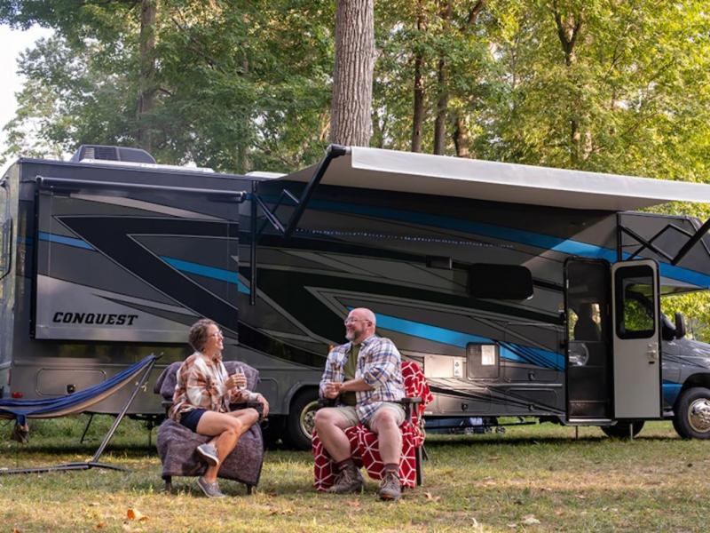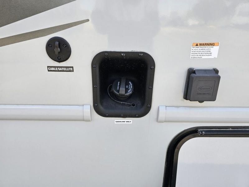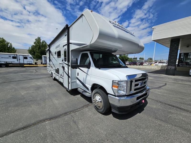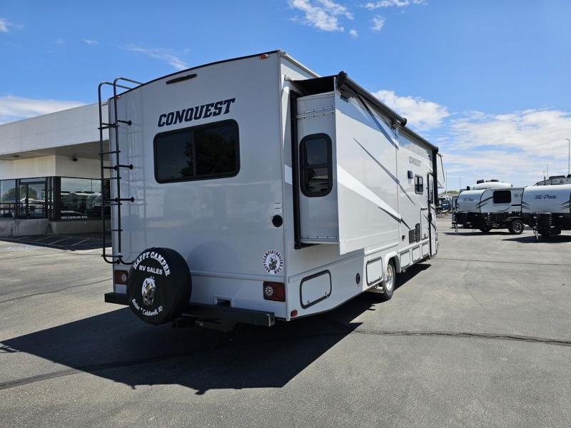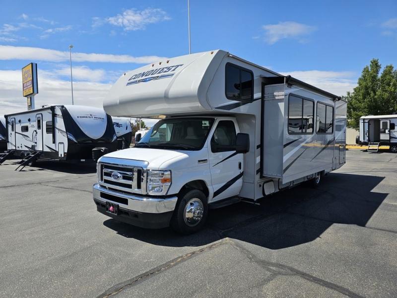 Set out to new destinations with this Conquest Class C gas motorhome to travel and stay in comfort! Your family will love having their own space to sleep with the bunk over the cab, which will be a hot spot for sure, the jackknife sofa and the booth dinette in the main living area, and the RV queen bed in the rear private bedroom. The kitchen offers all the appliances necessary to keep the crew fed, like a three-burner range, a microwave oven, and a double-door 12V refrigerator/freezer. You might even decide to add the optional outdoor entertainment center for more fun.