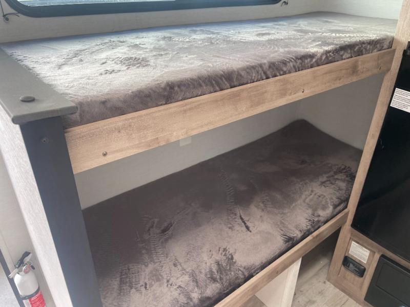 This travel trailer is ideal for families seeking adventure and relaxation! The incredible microwave and refrigerator simplify meal planning, while the two-burner cooktop lets you cook up delicious meals for the whole family. The bunk beds are a hit with kids, providing a fun and cozy sleeping space, while the comfortable bed is perfect for parents to unwind. Ample storage space is available, including flip-up storage and overhead shelves, keeping your belongings organized and within reach.