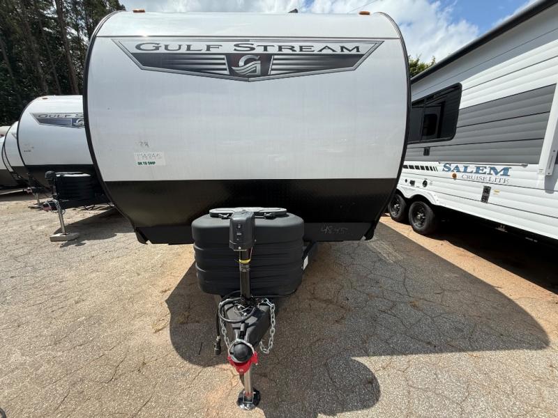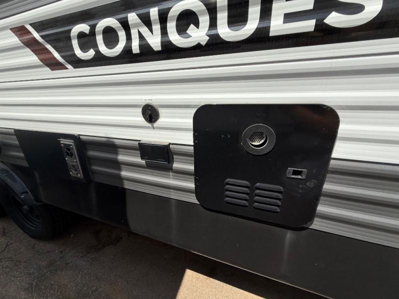 One of these Gulf Stream Conquest Supreme Series travel trailers is ideal for you whether you are looking for a family-friendly unit or a two person getaway! Their uni-body construction is made up of sidewalls, ceiling and floor screwed, glued and tied together with steel straps for unmatched strength and resilience. A powder-coated steel I-beam frame with welded outriggers hold them together and the one-piece seamless roof will last for years to come. Each model includes a 13,500 BTU ducted roof A/C and a gas furnace to keep you comfortable all year long, and the tankless water heater will provide endless hot showers. The included Supreme Package includes upgraded graphics and bigger slide windows, a heated and enclosed underbelly, solar and backup camera prep, and many more hassle-free features. You will appreciate the lighted storage area to easily pack your gear, and the Bluetooth soundbar with outside speakers will make unloading fun!