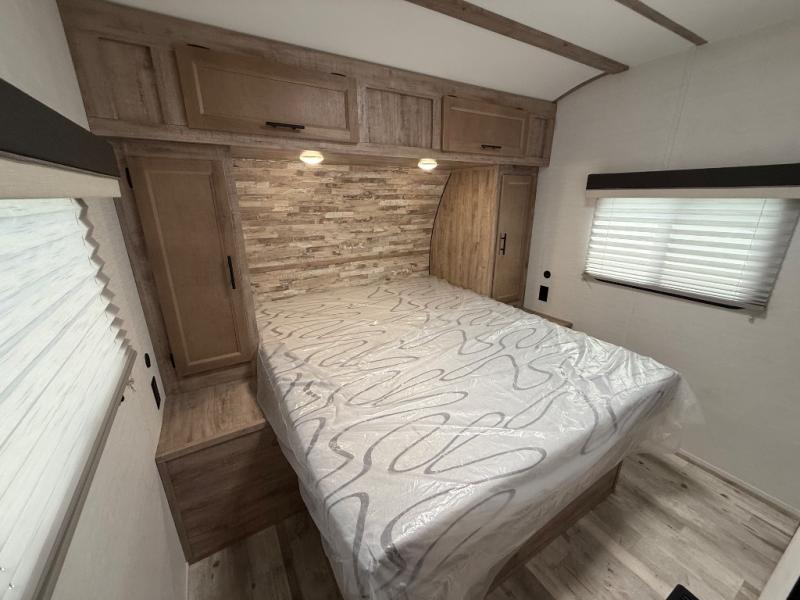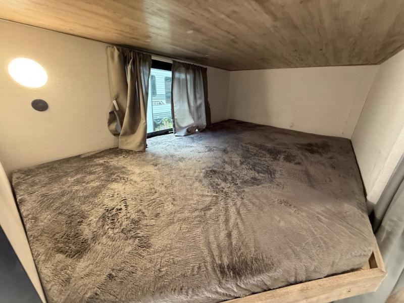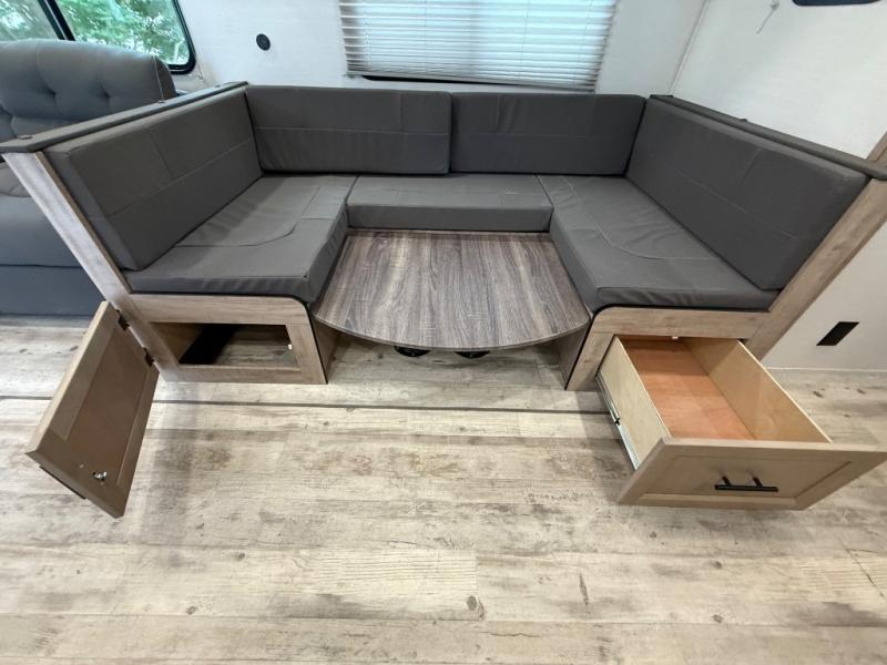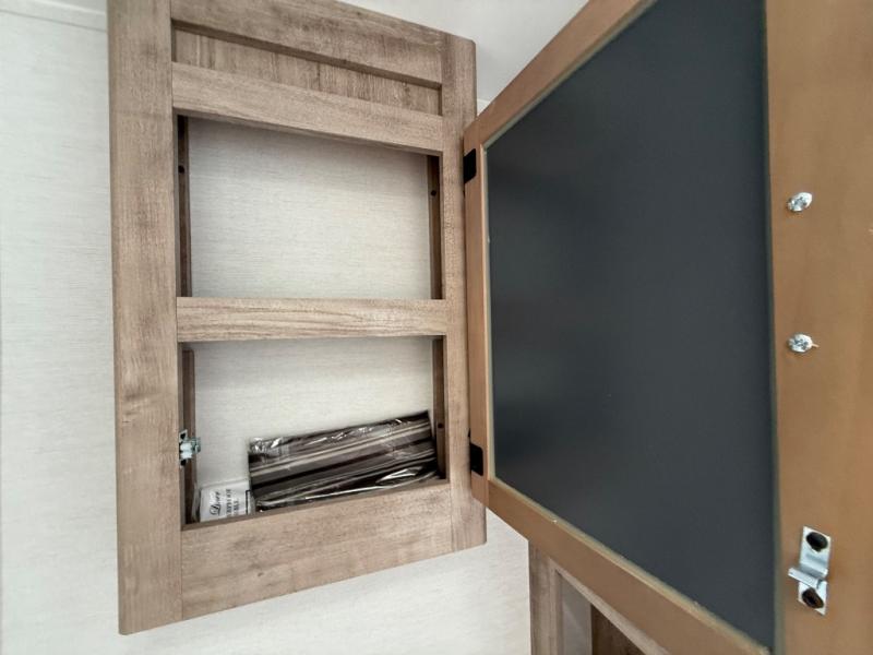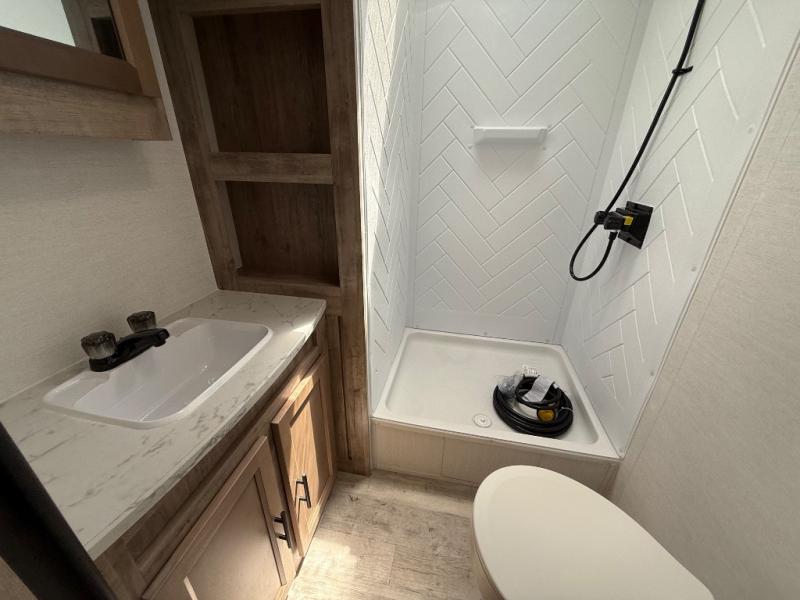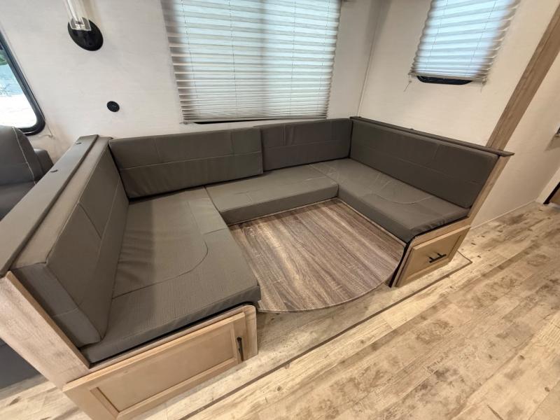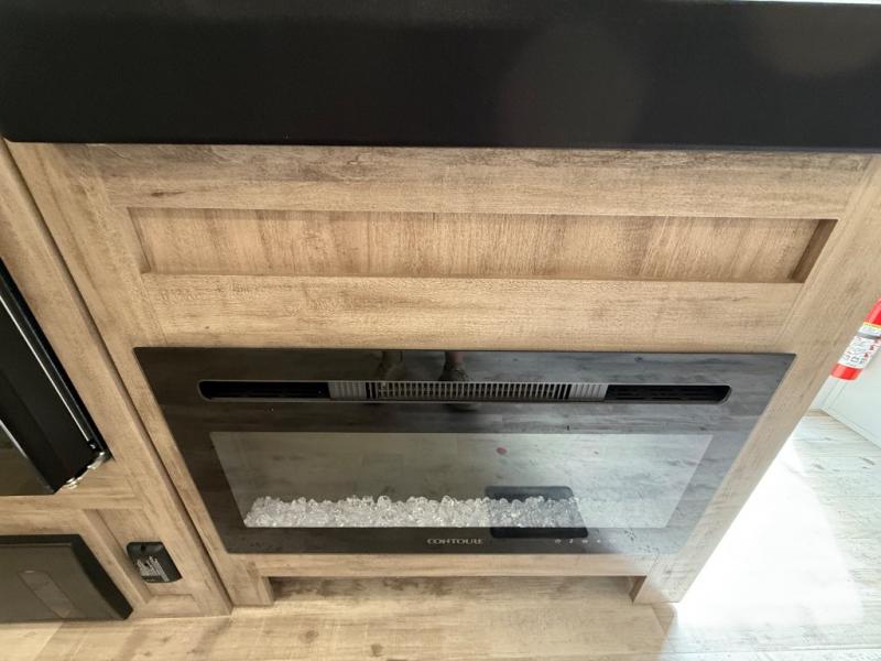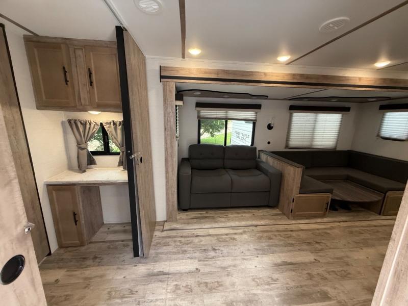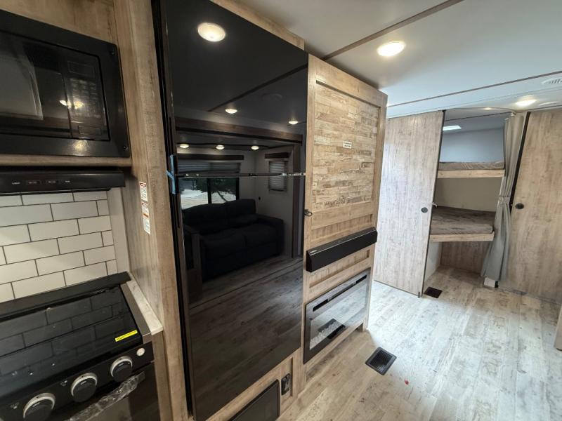 The whole family will have a good time in this travel trailer! The kiddos will have their own space in the rear private bunkhouse which has a set of double-size bunk beds next to a half bathroom and even a desk for them to get some work done. The front private bedroom has a king bed for a good night's rest and a closet with shelf. Just outside the bedroom is the full bathroom to freshen up in each morning, and you can keep your bellies full with delicious home cooked meals prepared in the fully equipped kitchen. Enjoy your meals at the U-shaped dinette and relax on the sofa next to it, plus if you add the optional fireplace to the entertainment center then you can feel even more at home.