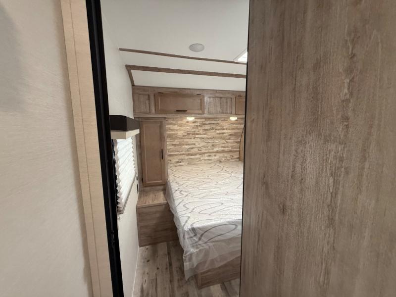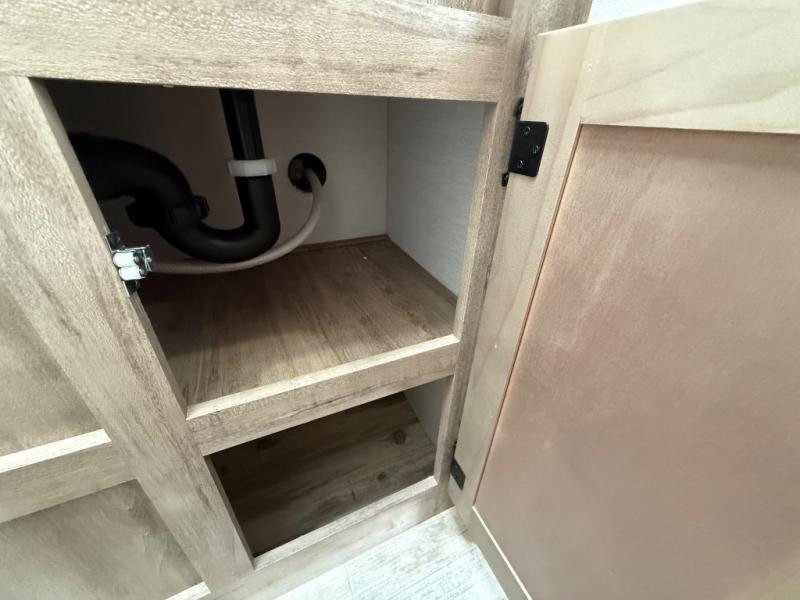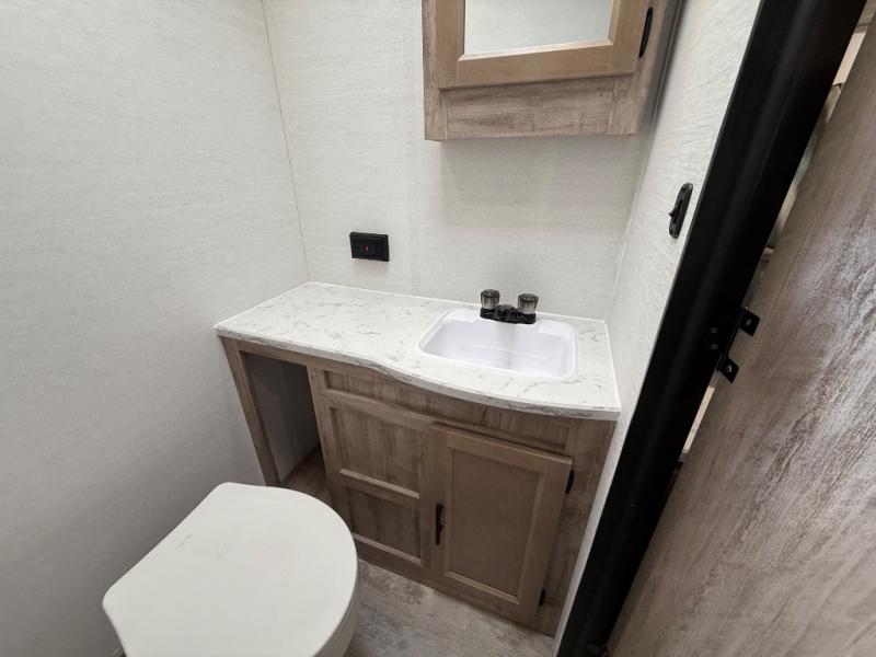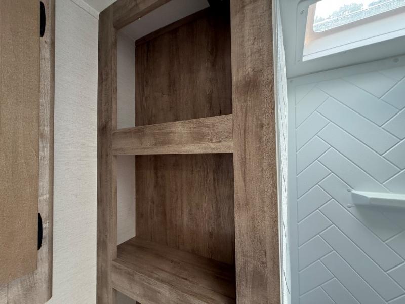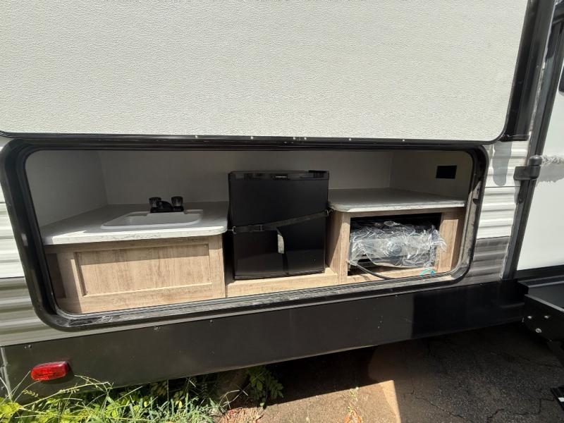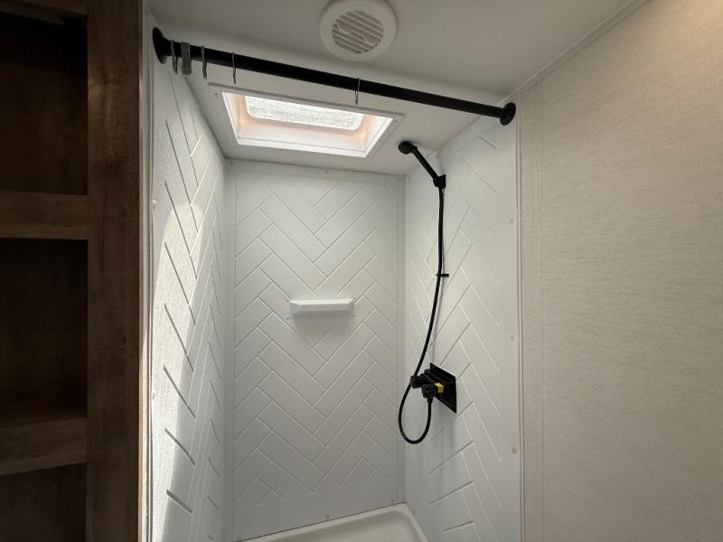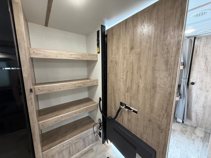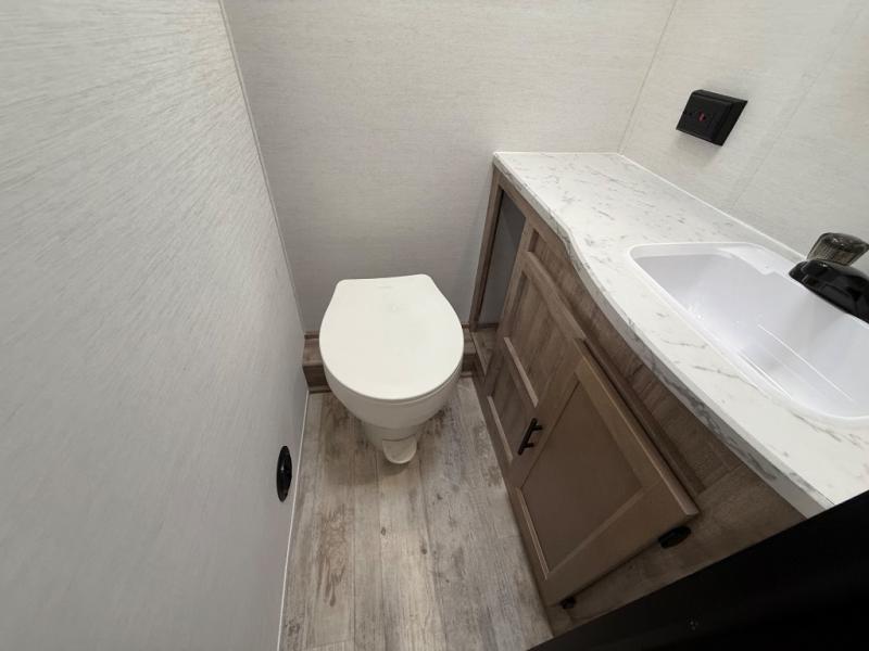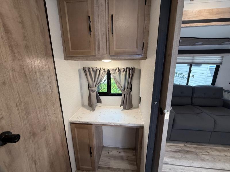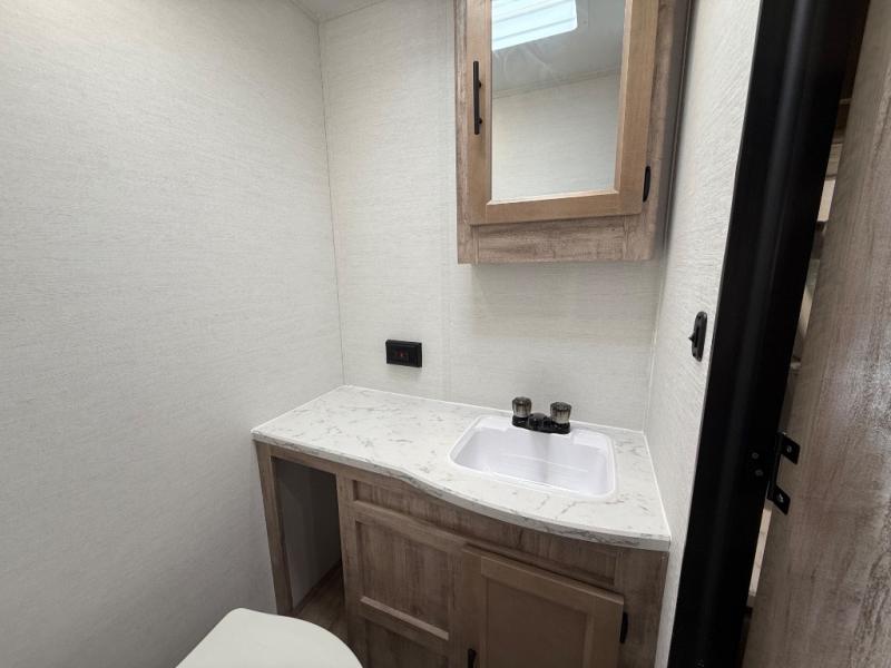 The whole family will have a good time in this travel trailer! The kiddos will have their own space in the rear private bunkhouse which has a set of double-size bunk beds next to a half bathroom and even a desk for them to get some work done. The front private bedroom has a king bed for a good night's rest and a closet with shelf. Just outside the bedroom is the full bathroom to freshen up in each morning, and you can keep your bellies full with delicious home cooked meals prepared in the fully equipped kitchen. Enjoy your meals at the U-shaped dinette and relax on the sofa next to it, plus if you add the optional fireplace to the entertainment center then you can feel even more at home.