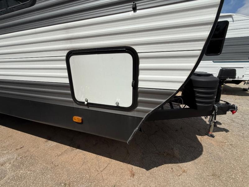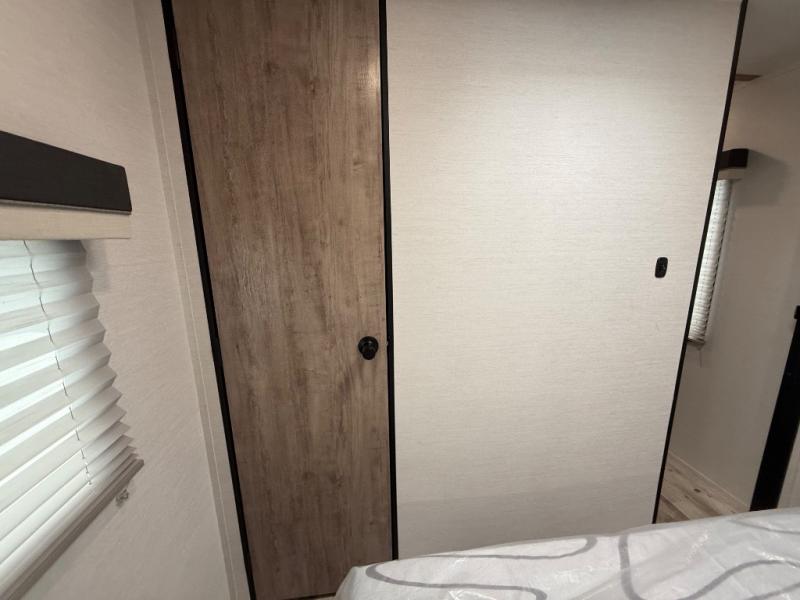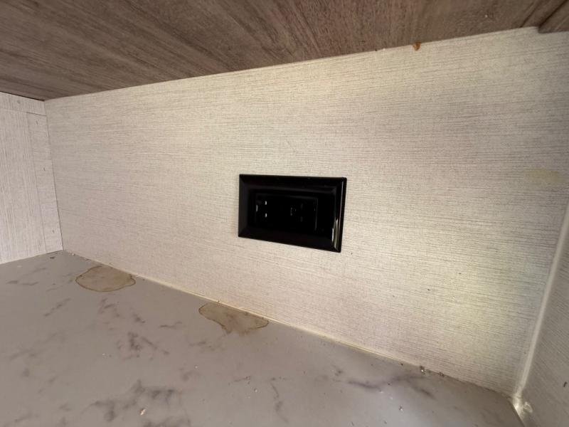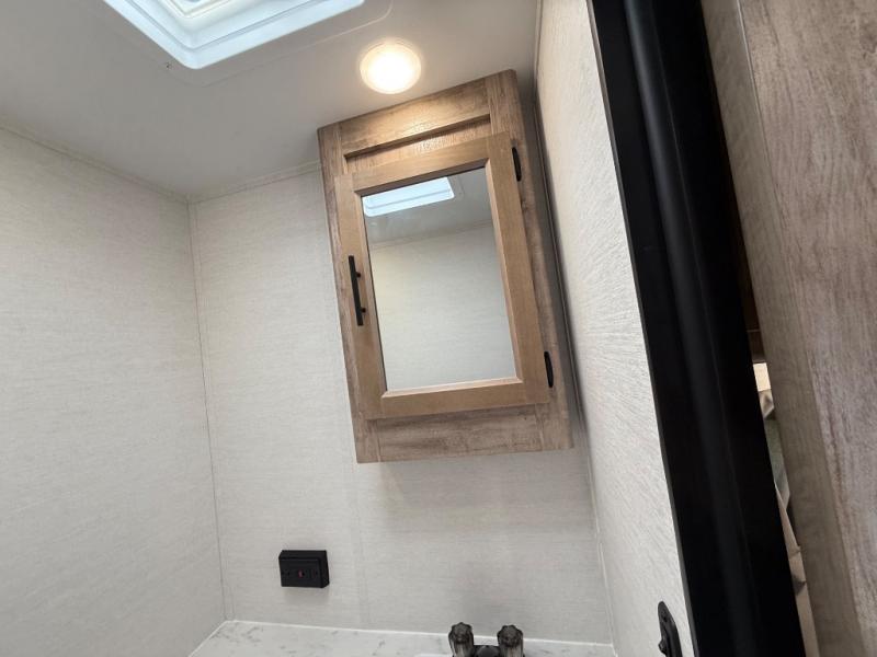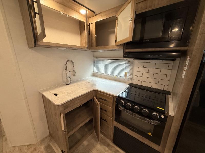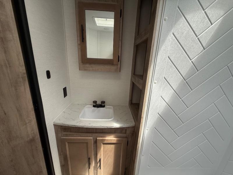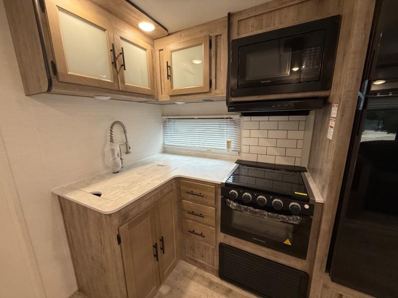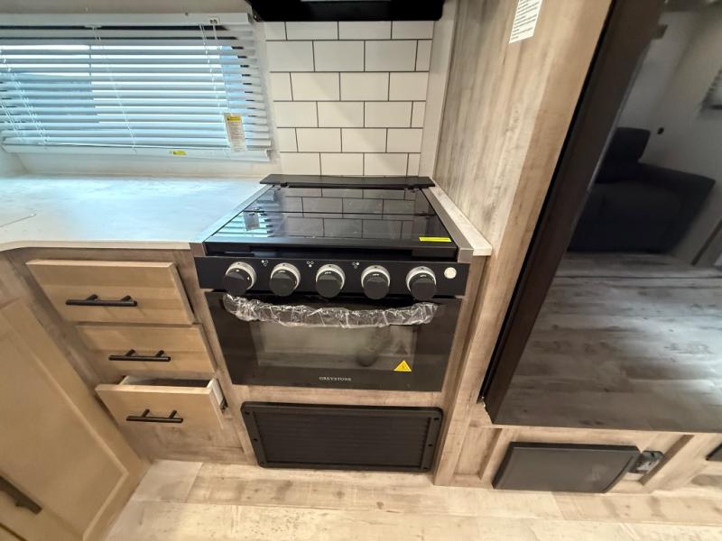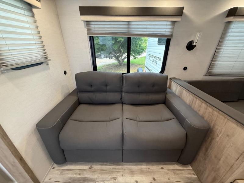 The whole family will have a good time in this travel trailer! The kiddos will have their own space in the rear private bunkhouse which has a set of double-size bunk beds next to a half bathroom and even a desk for them to get some work done. The front private bedroom has a king bed for a good night's rest and a closet with shelf. Just outside the bedroom is the full bathroom to freshen up in each morning, and you can keep your bellies full with delicious home cooked meals prepared in the fully equipped kitchen. Enjoy your meals at the U-shaped dinette and relax on the sofa next to it, plus if you add the optional fireplace to the entertainment center then you can feel even more at home.