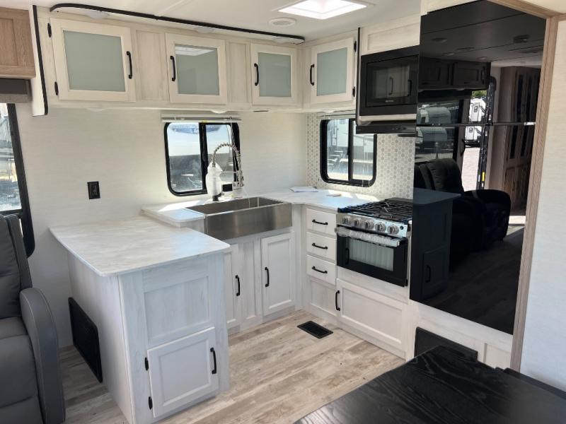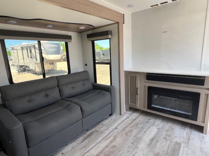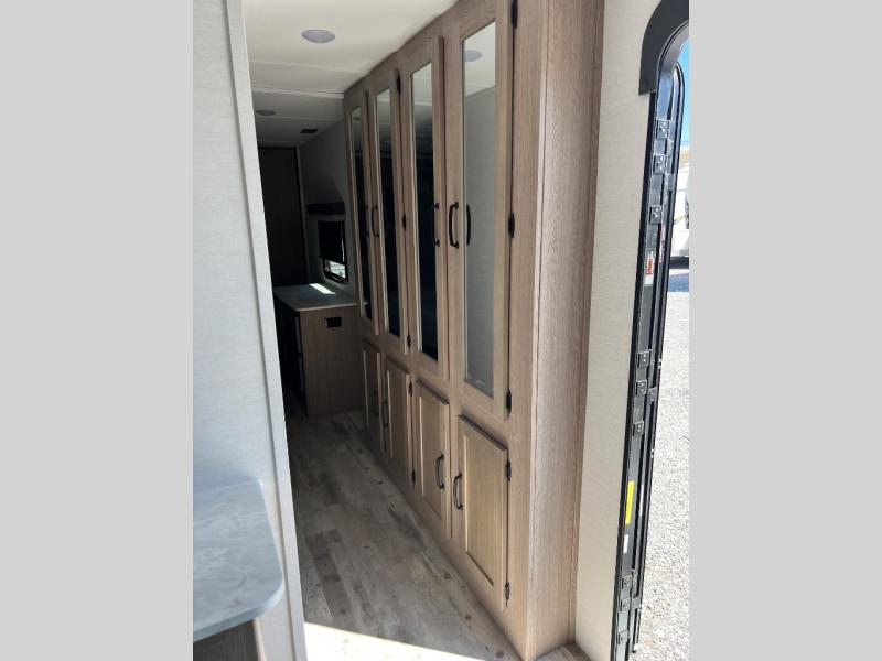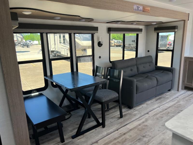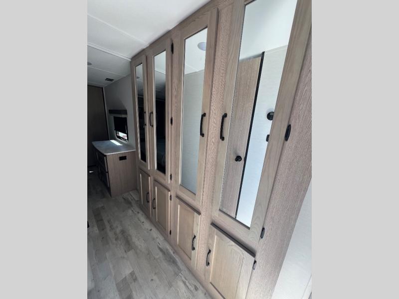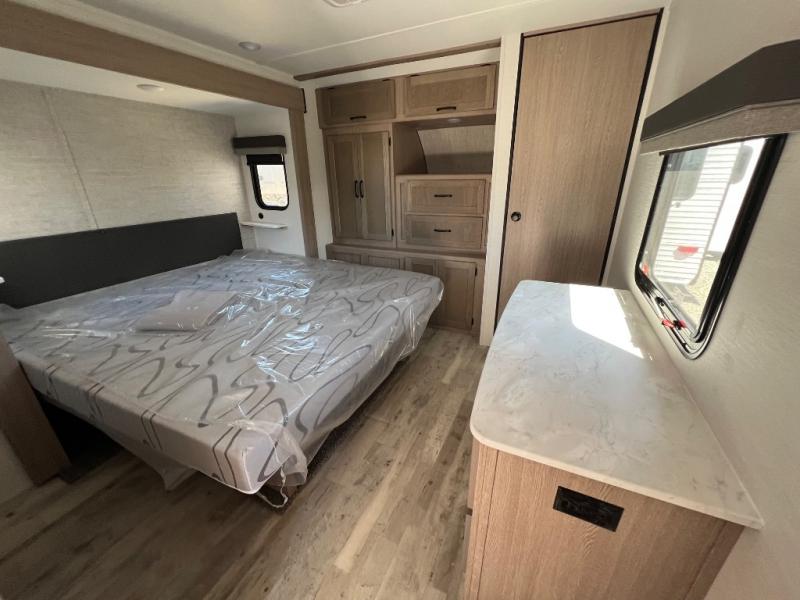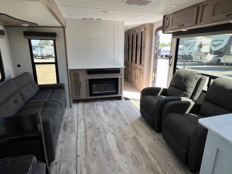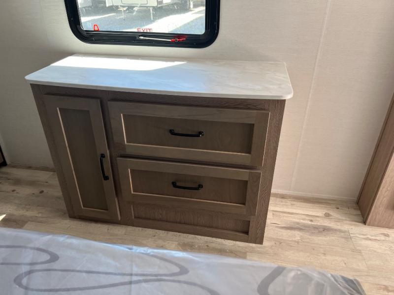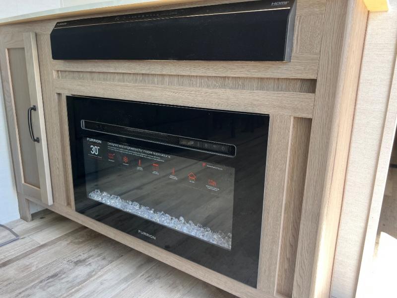 One look at this travel trailer and you'll be sold! The rear kitchen includes generous counter space to prep meals, and the large slide out in the main living area will let everyone relax in comfort. You'll find a sofa and booth dinette here across from theater seating. There is also an entertainment center where you can add a TV, plus a fireplace to make your space feel like home. A front private bedroom includes a king bed slide out with nightstands on either side, a front vanity with wardrobes on either side, plus a dresser to keep all your clothes tidy.