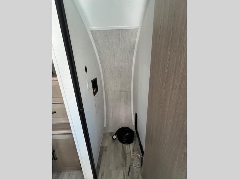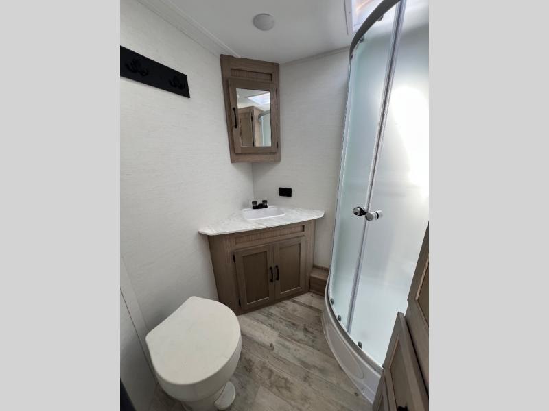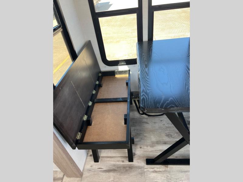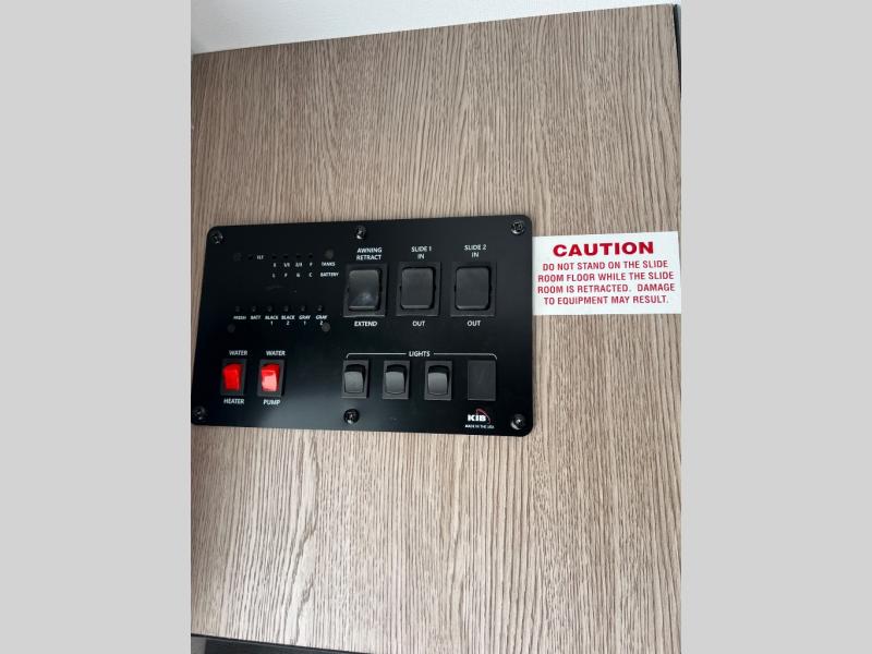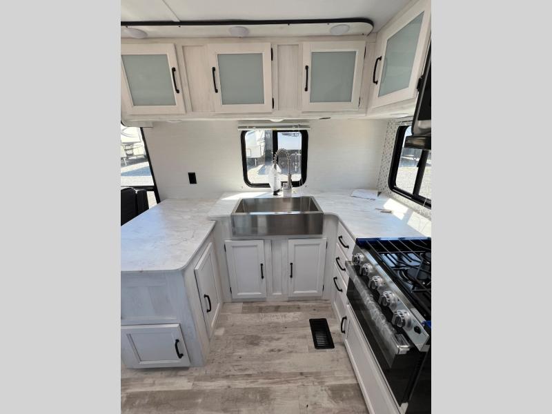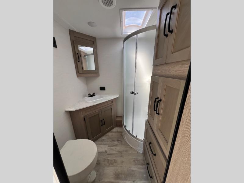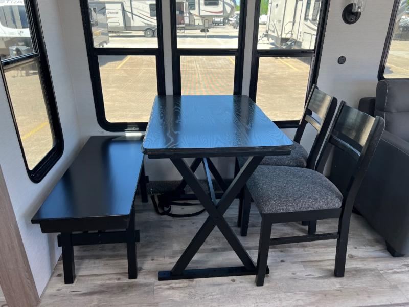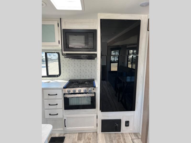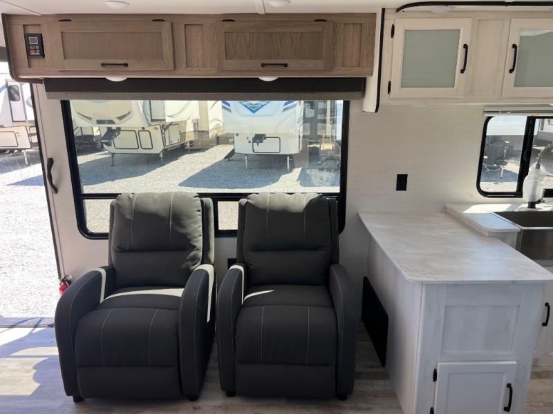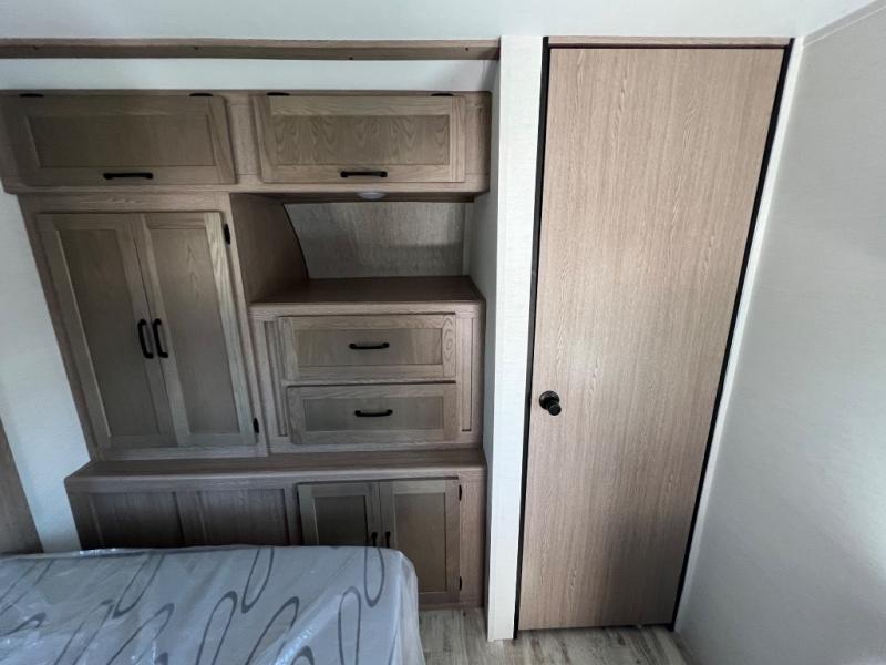 One look at this travel trailer and you'll be sold! The rear kitchen includes generous counter space to prep meals, and the large slide out in the main living area will let everyone relax in comfort. You'll find a sofa and booth dinette here across from theater seating. There is also an entertainment center where you can add a TV, plus a fireplace to make your space feel like home. A front private bedroom includes a king bed slide out with nightstands on either side, a front vanity with wardrobes on either side, plus a dresser to keep all your clothes tidy.