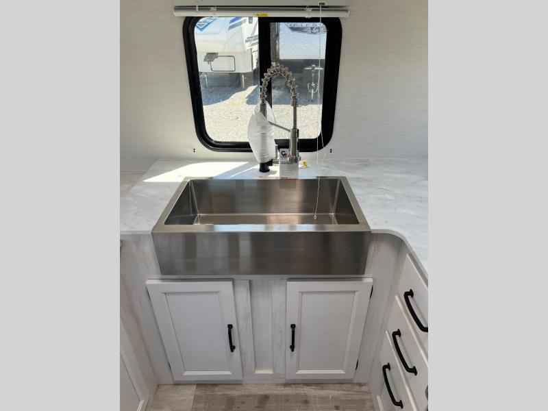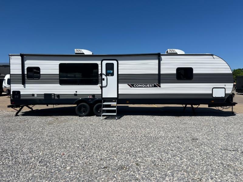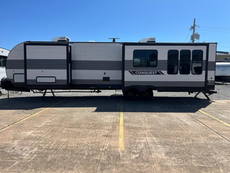One of these Gulf Stream Conquest Supreme Series travel trailers is ideal for you whether you are looking for a family-friendly unit or a two-person getaway! Their uni-body construction is made up of sidewalls, ceiling and floor screwed, glued and tied together with steel straps for unmatched strength and resilience. A powder-coated steel I-beam frame with welded outriggers hold them together and the one-piece seamless roof will last for years to come. Each model includes a 13,500 BTU ducted roof A/C and a gas furnace to keep you comfortable all year long, and the tankless water heater will provide endless hot showers. The included Supreme Package includes upgraded graphics and bigger slide windows, a heated and enclosed underbelly, solar and backup camera prep, and many more hassle-free features. You will appreciate the lighted storage area to easily pack your gear, and the Bluetooth soundbar with outside speakers will make unloading fun!