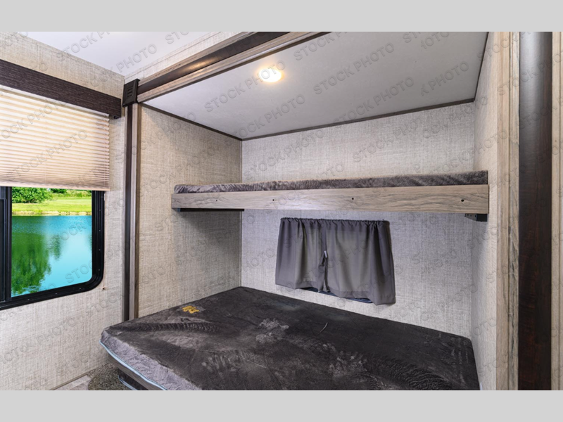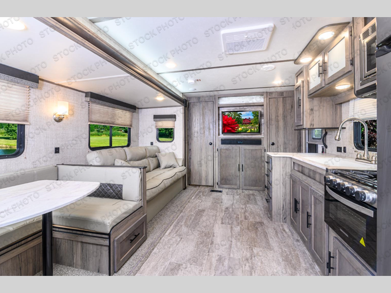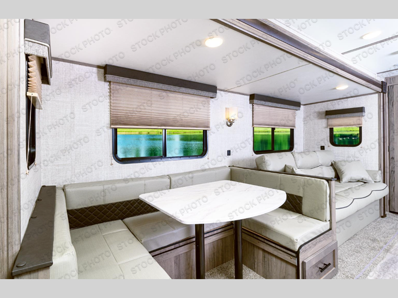 The whole family will have a comfortable place to sleep in this travel trailer! The kiddos can sleep in the rear private bunkhouse with the set of bunk beds slide and the bunk above the wardrobe and entertainment center. You will have your own privacy with the front private bedroom that has a queen bed, a shirt closet and a wardrobe on either side, and doors on either side of the living area entertainment center to enter/exit the bedroom. Take an afternoon nap on the sofa or play a card game at the U-shaped dinette after enjoying a delicious meal prepared with the three burner gas range with super burner and oven. There's even an outside kitchen that you can prepare your meals at too!