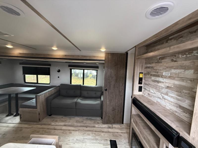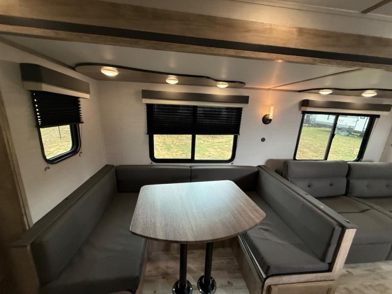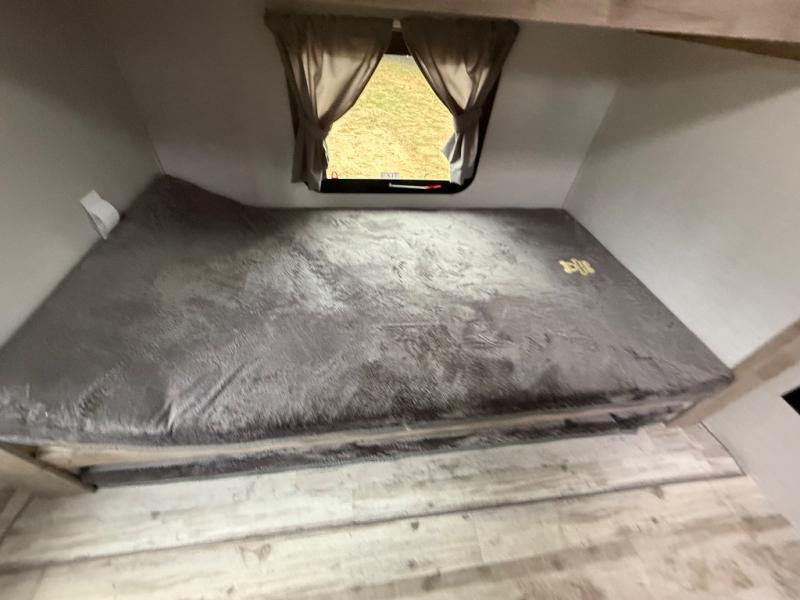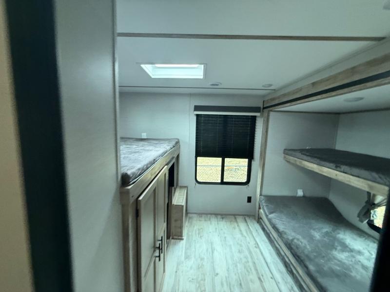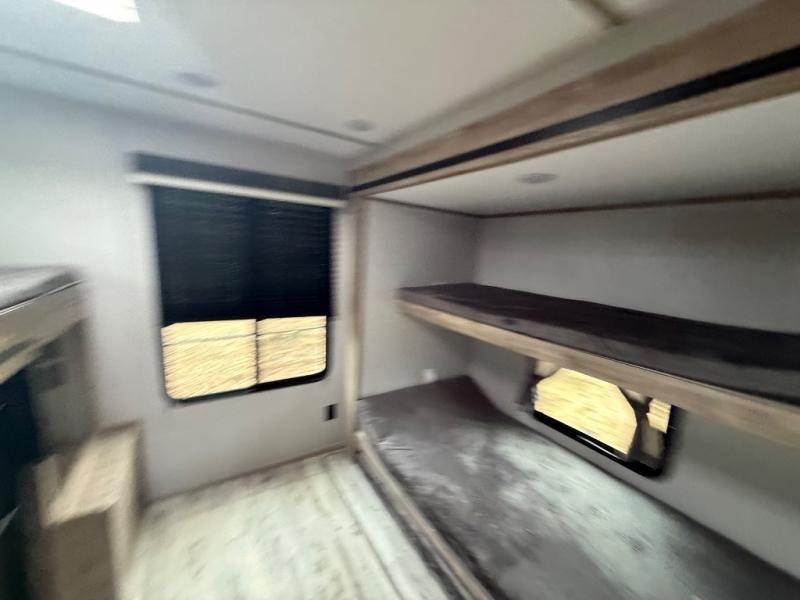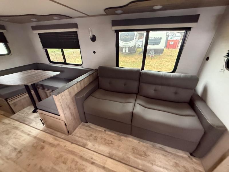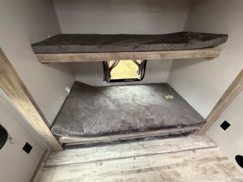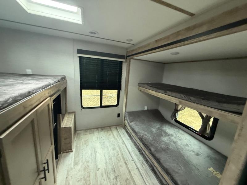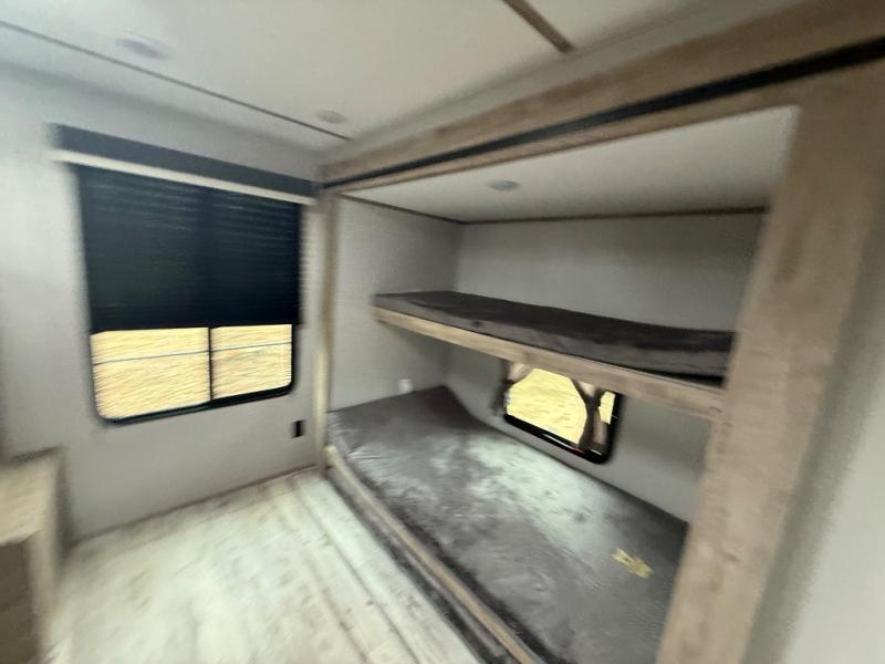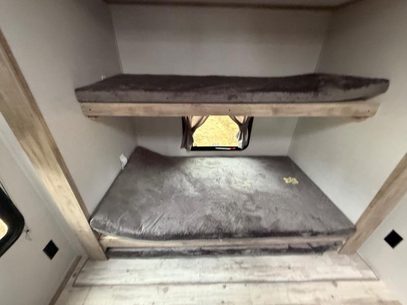 The whole family will have a comfortable place to sleep in this travel trailer! The kiddos can sleep in the rear private bunkhouse with the set of bunk beds slide and the bunk above the wardrobe and entertainment center. You will have your own privacy with the front private bedroom that has a queen bed, a shirt closet and a wardrobe on either side, and doors on either side of the living area entertainment center to enter/exit the bedroom. Take an afternoon nap on the sofa or play a card game at the U-shaped dinette after enjoying a delicious meal prepared with the three burner gas range with super burner and oven. There's even an outside kitchen that you can prepare your meals at too!
