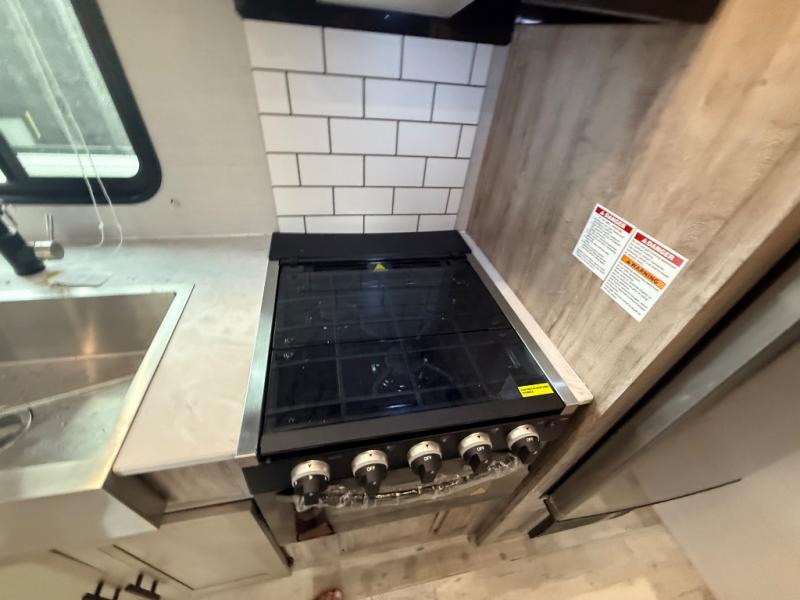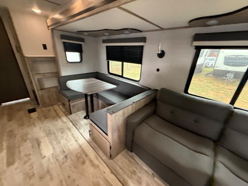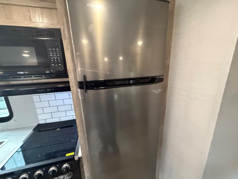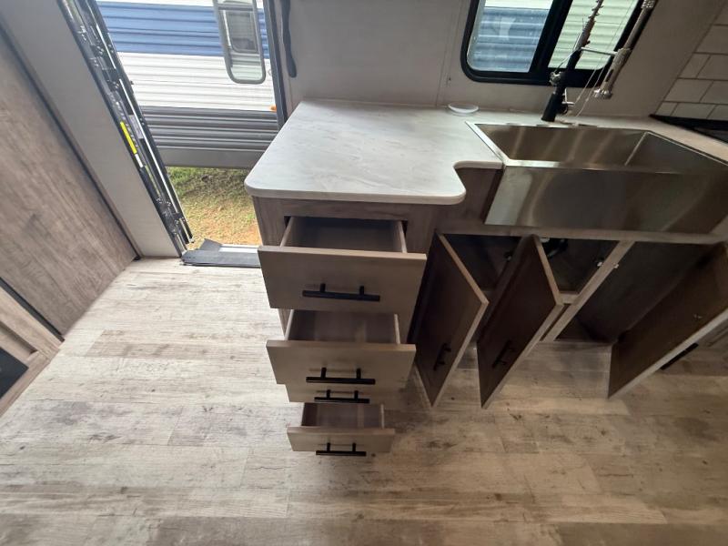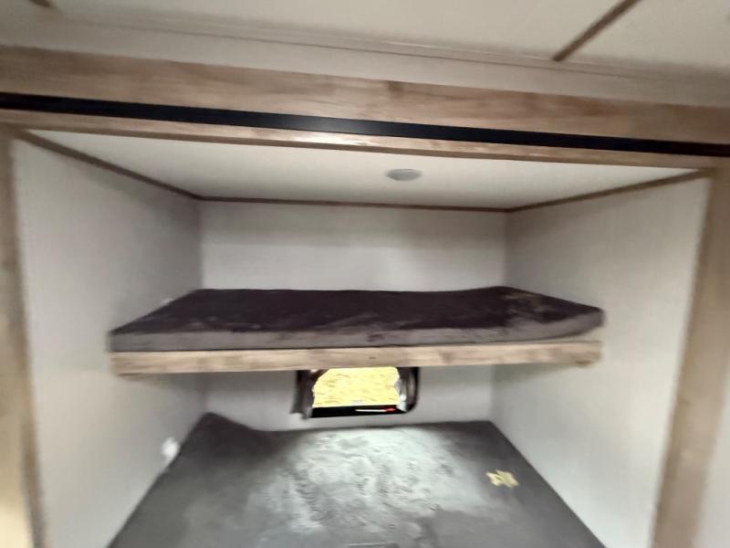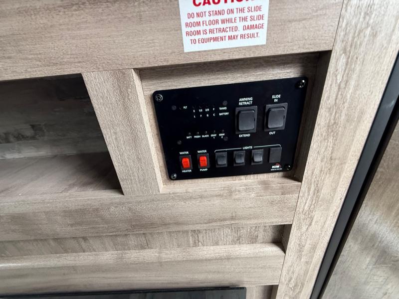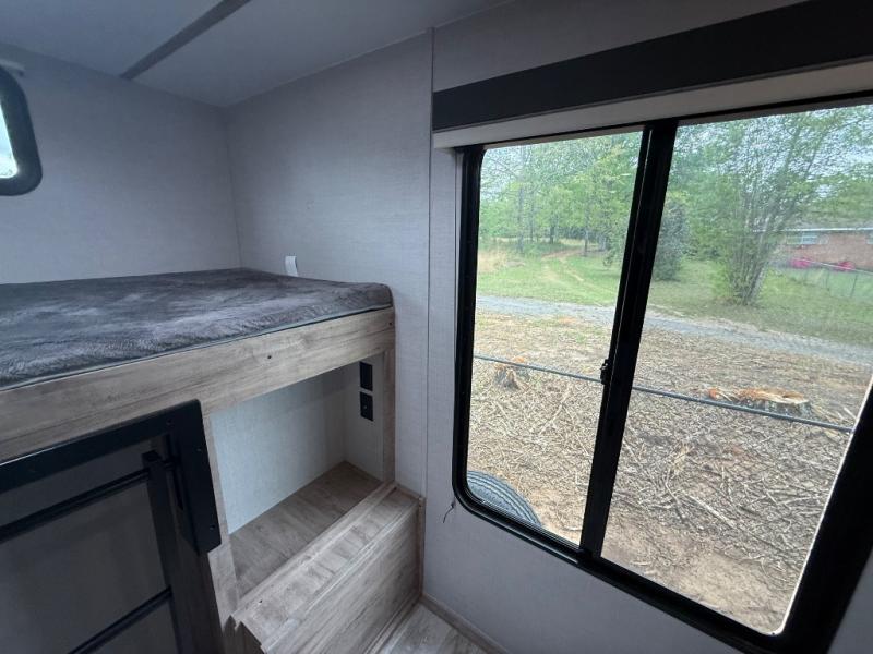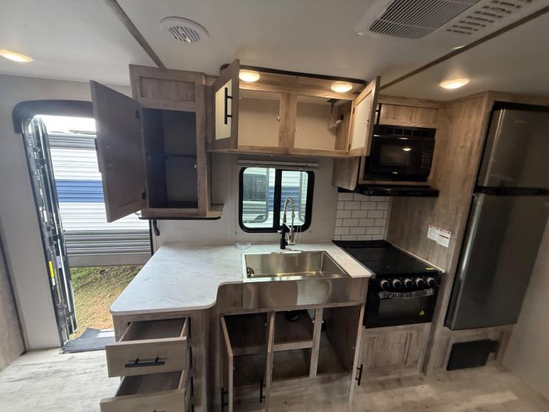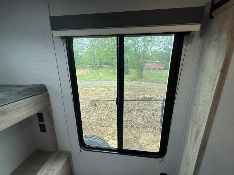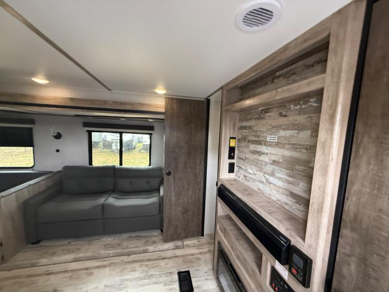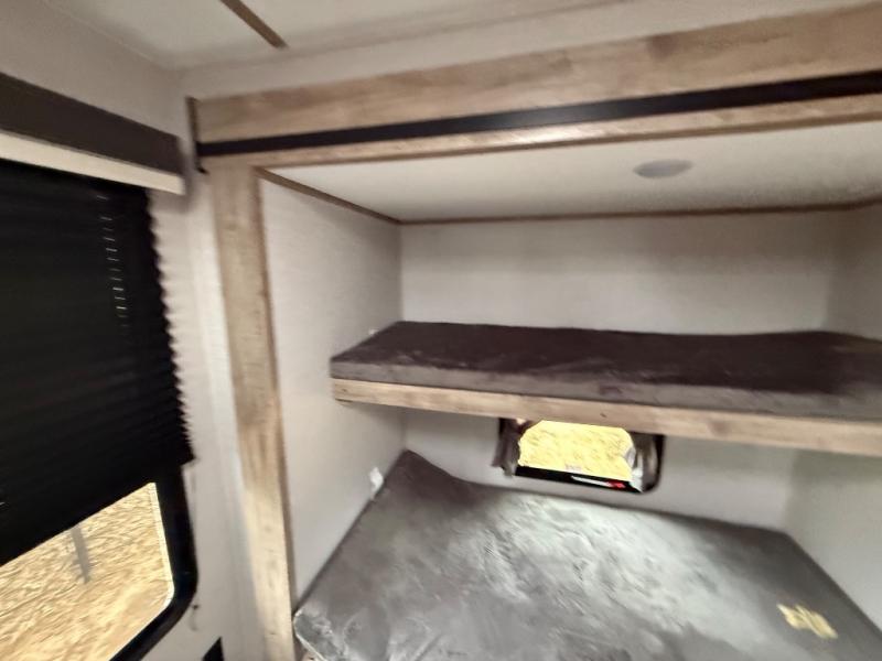 The whole family will have a comfortable place to sleep in this travel trailer! The kiddos can sleep in the rear private bunkhouse with the set of bunk beds slide and the bunk above the wardrobe and entertainment center. You will have your own privacy with the front private bedroom that has a queen bed, a shirt closet and a wardrobe on either side, and doors on either side of the living area entertainment center to enter/exit the bedroom. Take an afternoon nap on the sofa or play a card game at the U-shaped dinette after enjoying a delicious meal prepared with the three burner gas range with super burner and oven. There's even an outside kitchen that you can prepare your meals at too!