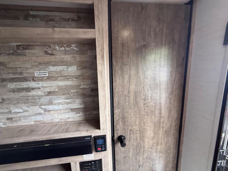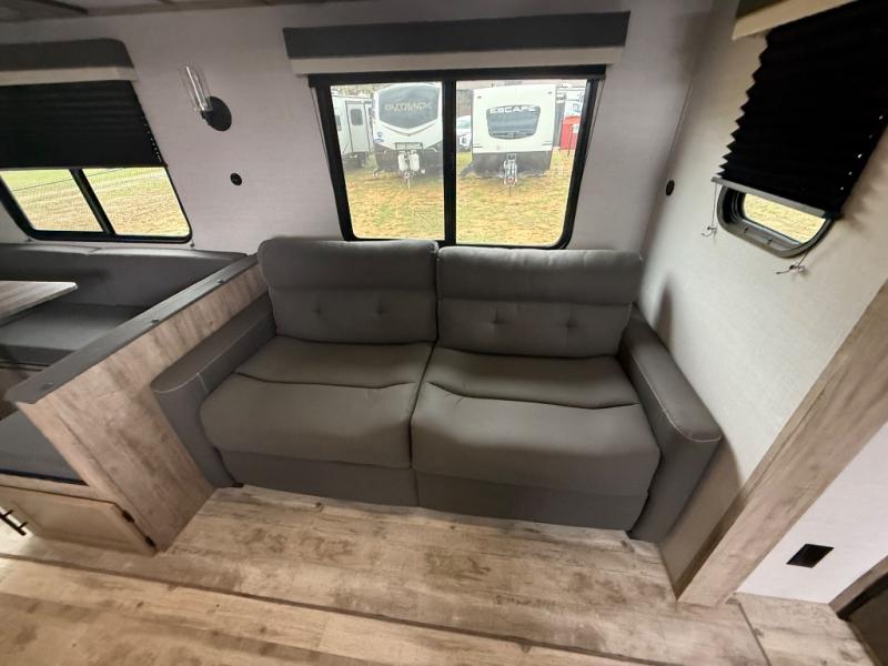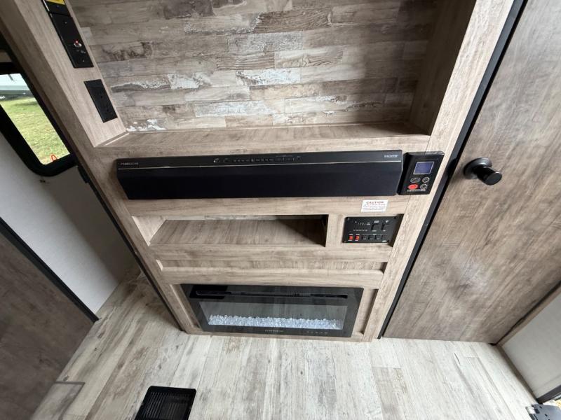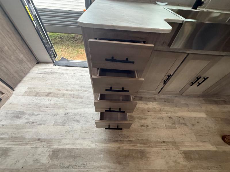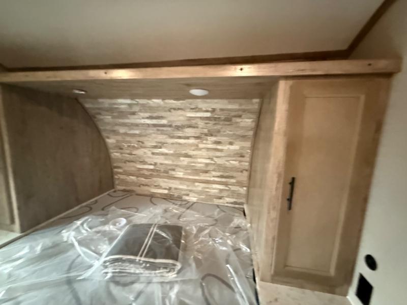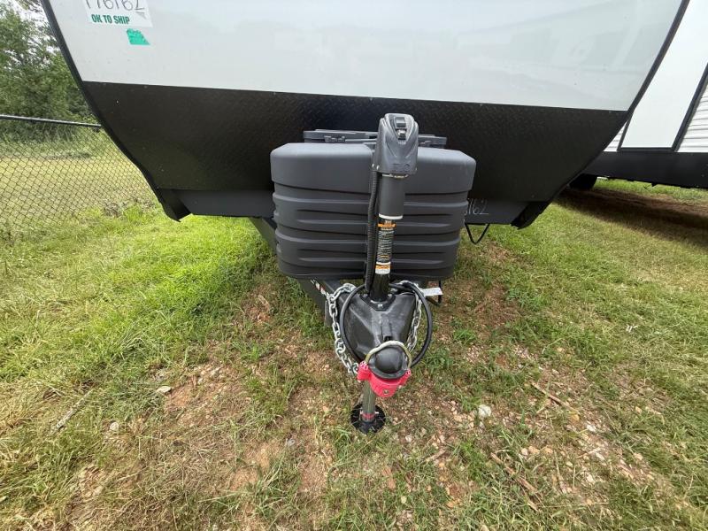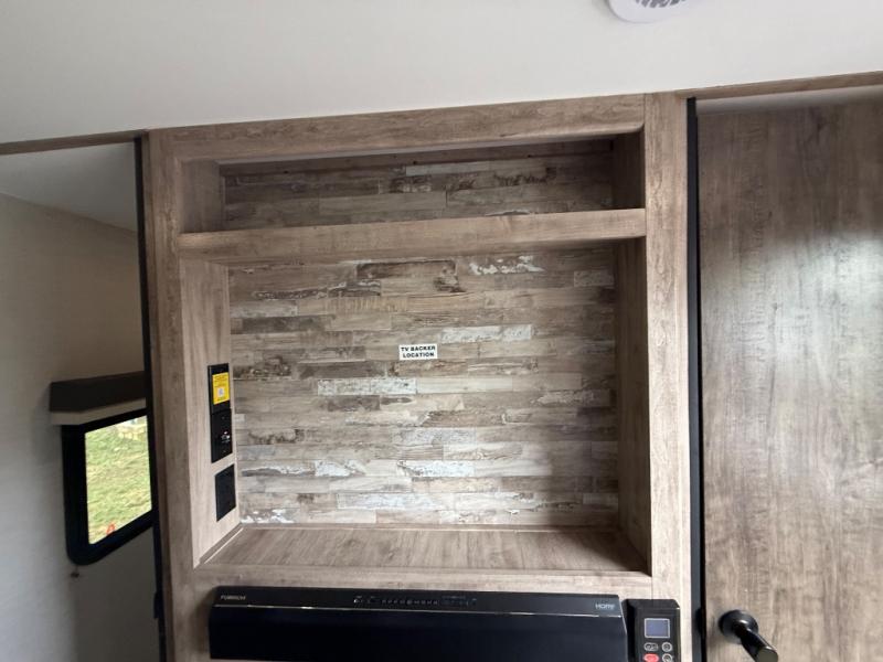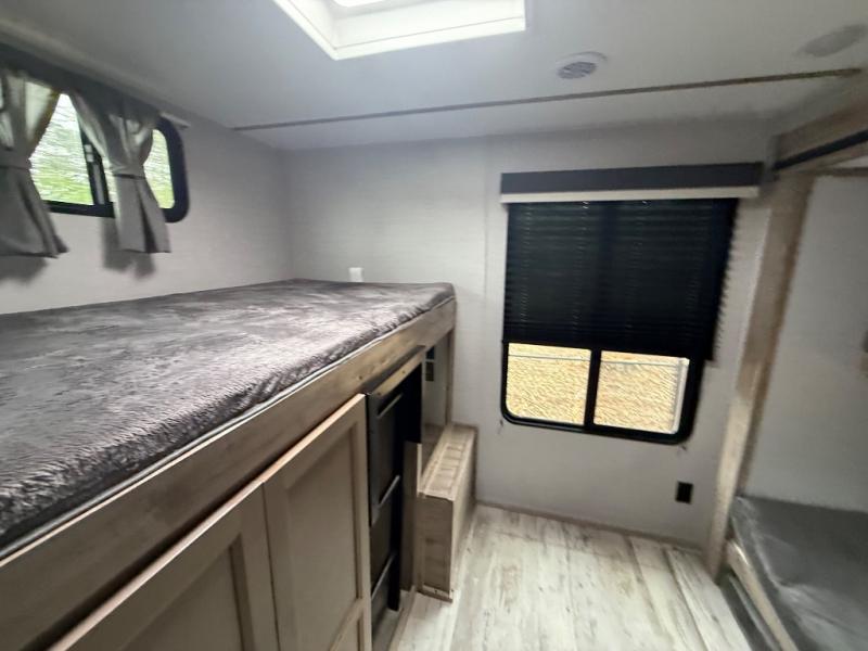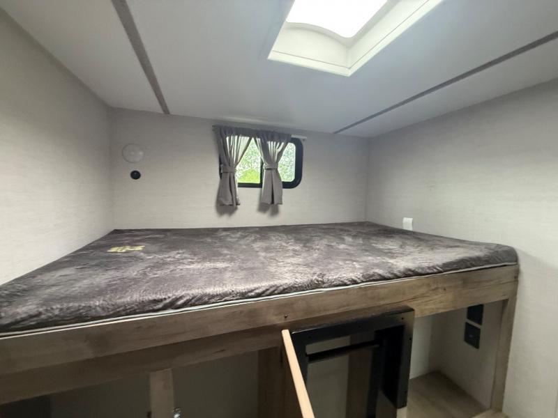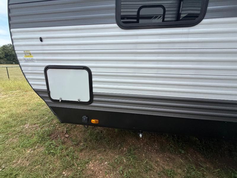 The whole family will have a comfortable place to sleep in this travel trailer! The kiddos can sleep in the rear private bunkhouse with the set of bunk beds slide and the bunk above the wardrobe and entertainment center. You will have your own privacy with the front private bedroom that has a queen bed, a shirt closet and a wardrobe on either side, and doors on either side of the living area entertainment center to enter/exit the bedroom. Take an afternoon nap on the sofa or play a card game at the U-shaped dinette after enjoying a delicious meal prepared with the three burner gas range with super burner and oven. There's even an outside kitchen that you can prepare your meals at too!
