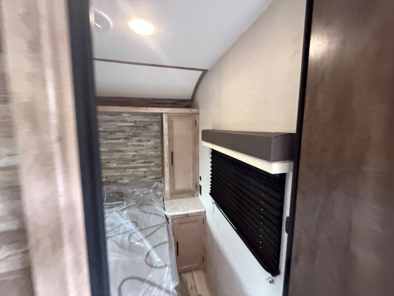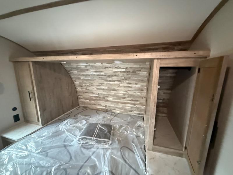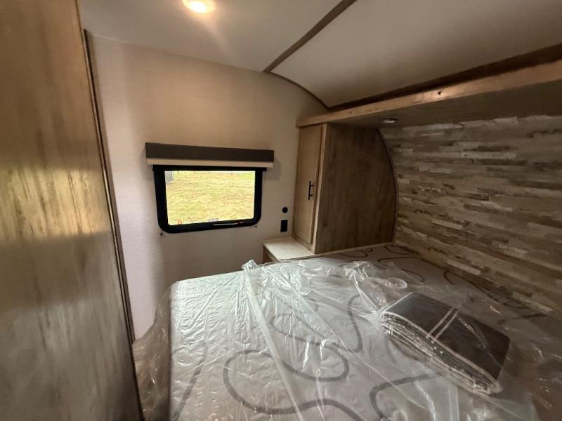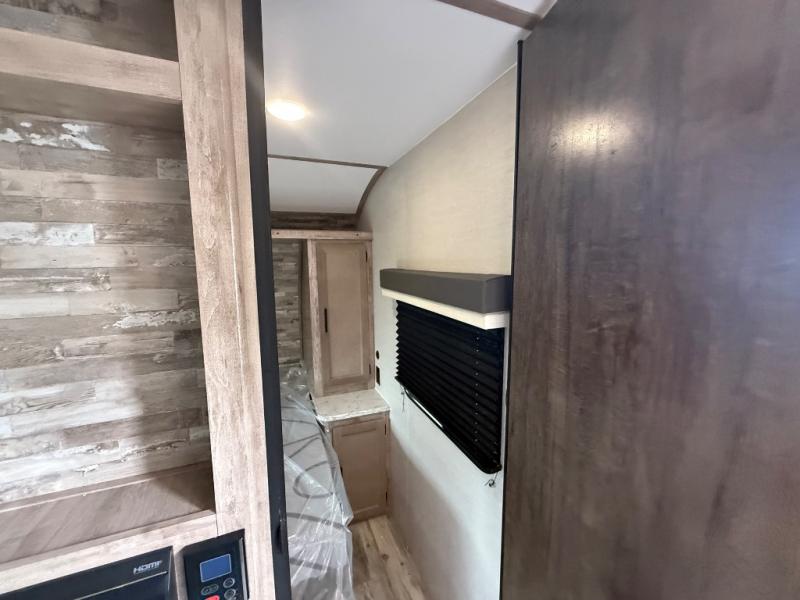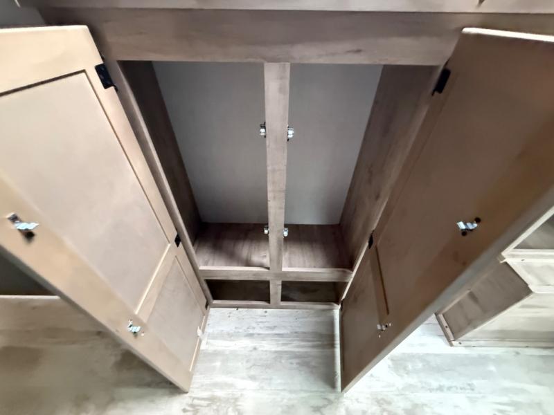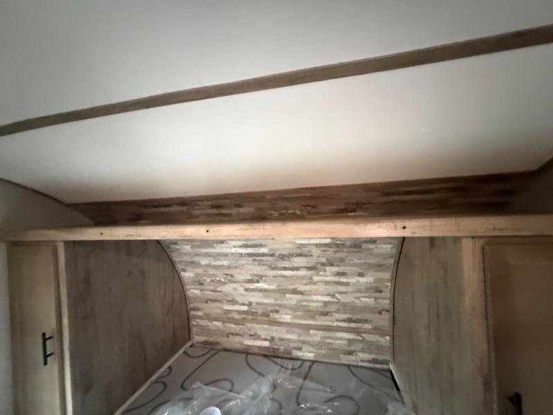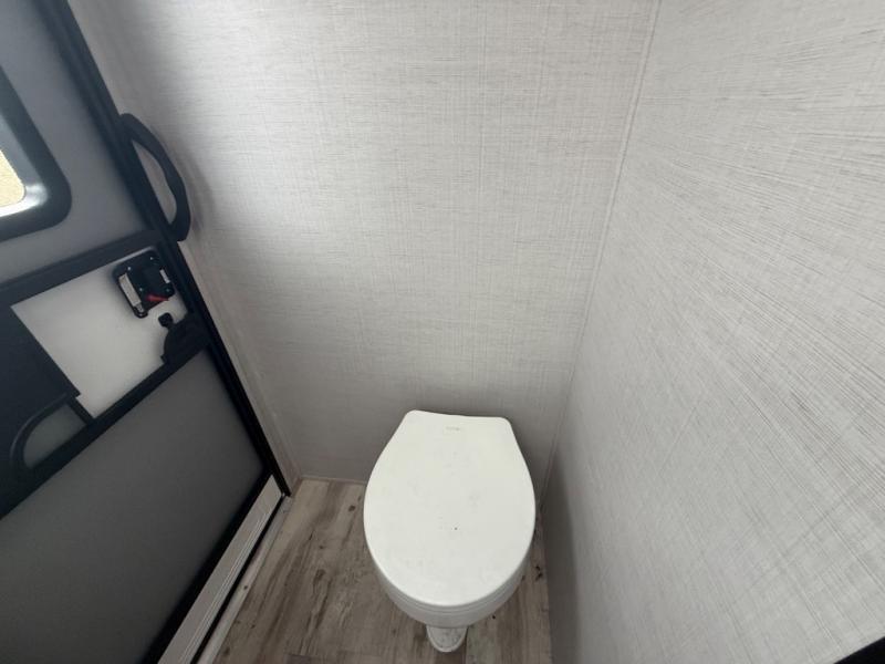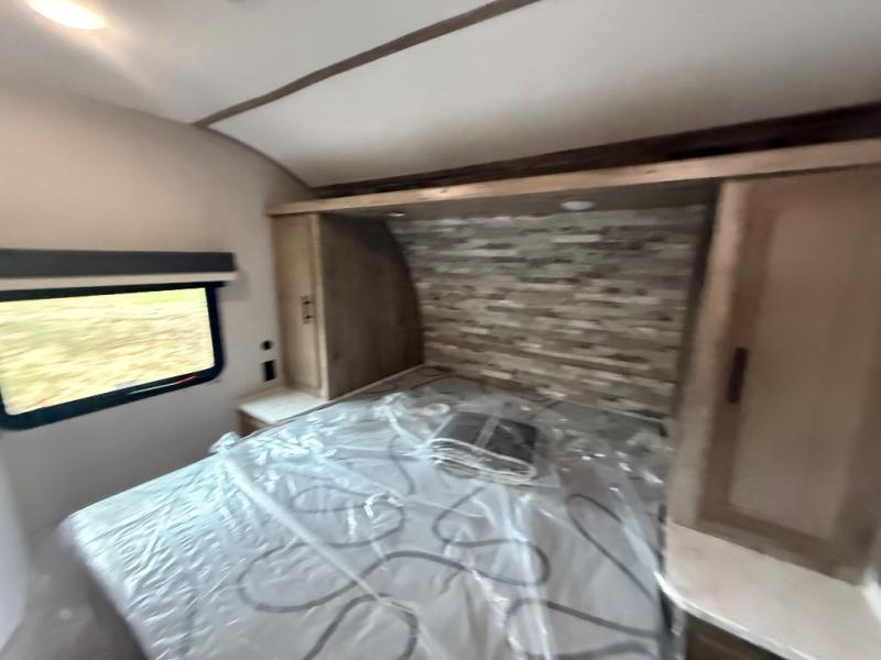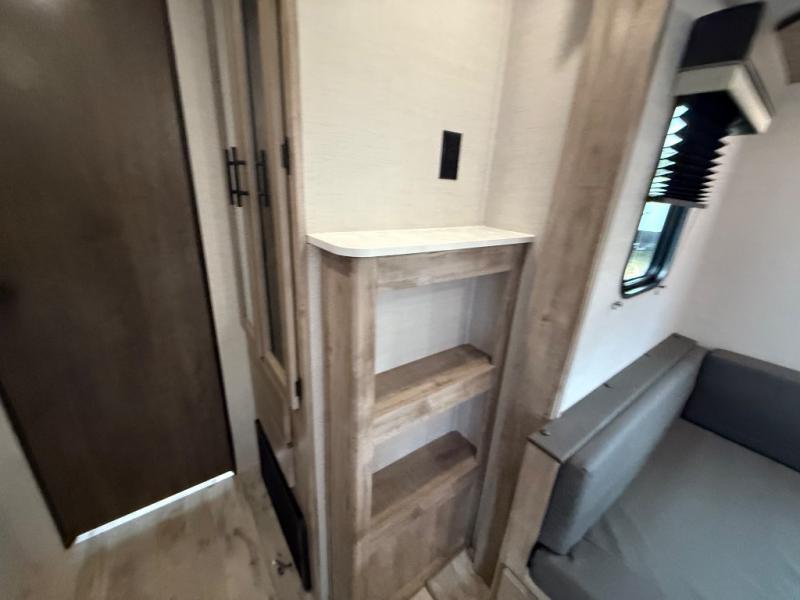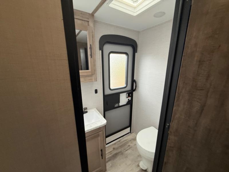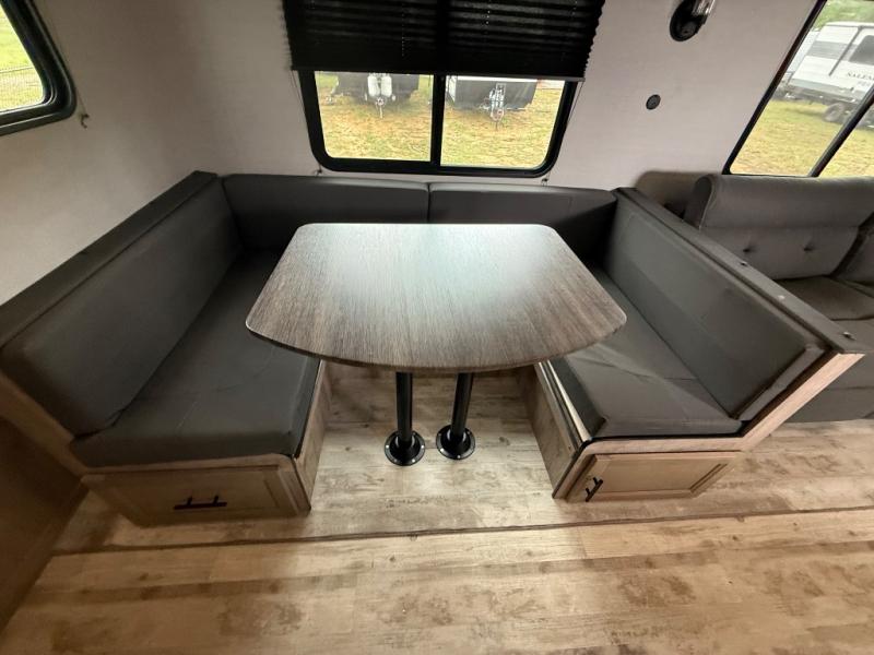 The whole family will have a comfortable place to sleep in this travel trailer! The kiddos can sleep in the rear private bunkhouse with the set of bunk beds slide and the bunk above the wardrobe and entertainment center. You will have your own privacy with the front private bedroom that has a queen bed, a shirt closet and a wardrobe on either side, and doors on either side of the living area entertainment center to enter/exit the bedroom. Take an afternoon nap on the sofa or play a card game at the U-shaped dinette after enjoying a delicious meal prepared with the three burner gas range with super burner and oven. There's even an outside kitchen that you can prepare your meals at too!
