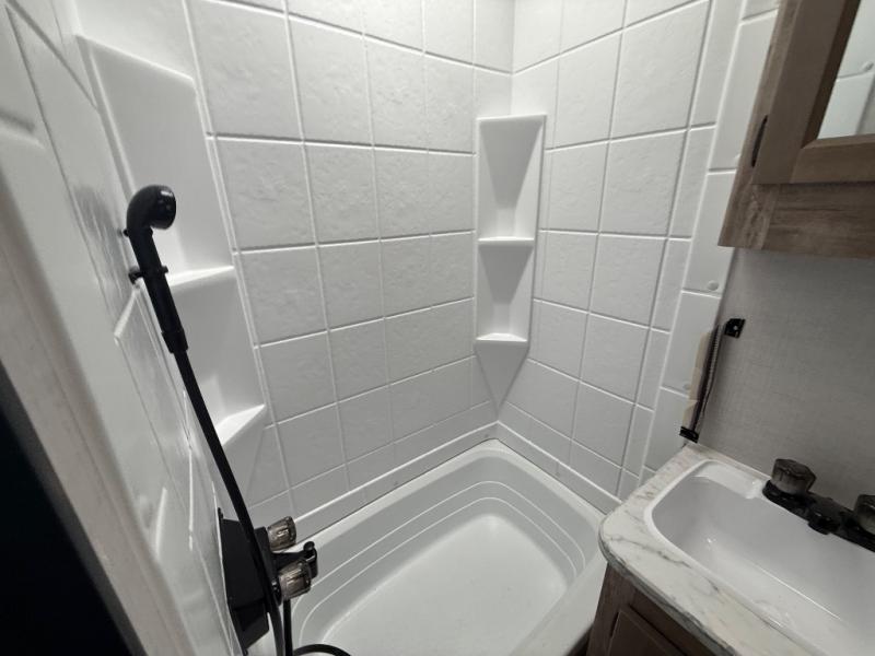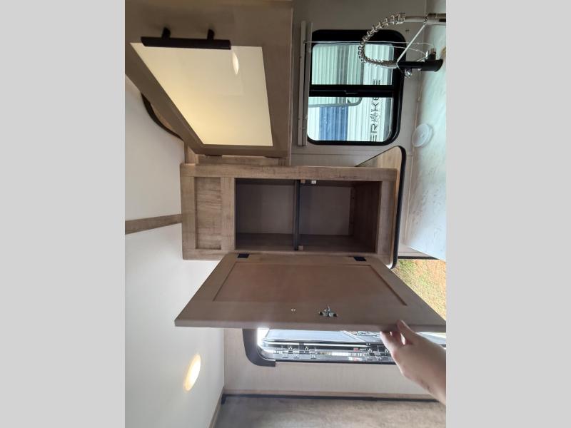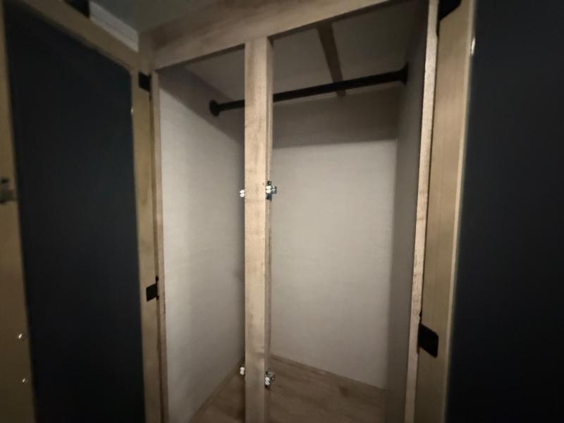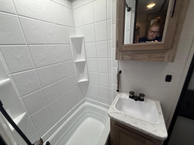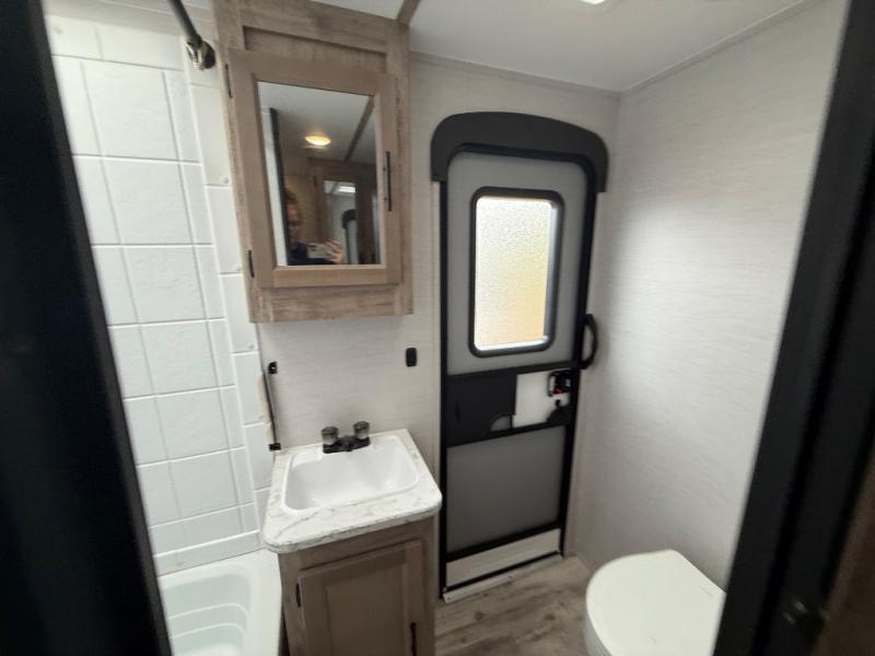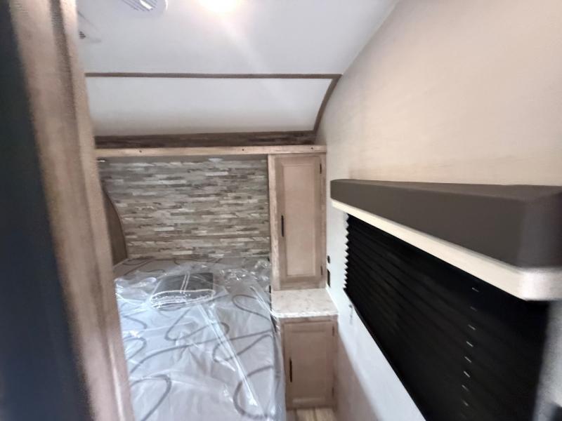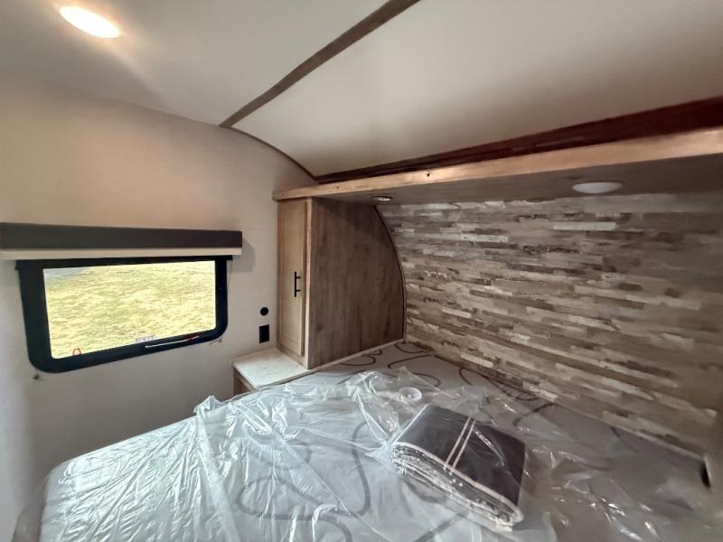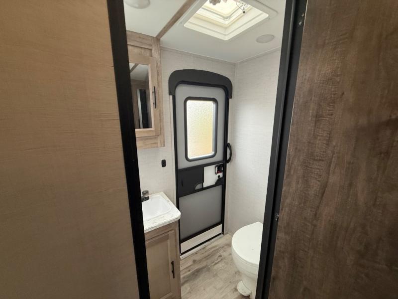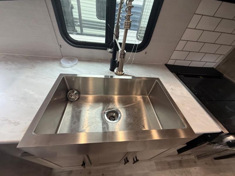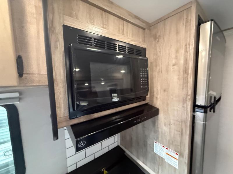 The whole family will have a comfortable place to sleep in this travel trailer! The kiddos can sleep in the rear private bunkhouse with the set of bunk beds slide and the bunk above the wardrobe and entertainment center. You will have your own privacy with the front private bedroom that has a queen bed, a shirt closet and a wardrobe on either side, and doors on either side of the living area entertainment center to enter/exit the bedroom. Take an afternoon nap on the sofa or play a card game at the U-shaped dinette after enjoying a delicious meal prepared with the three burner gas range with super burner and oven. There's even an outside kitchen that you can prepare your meals at too!