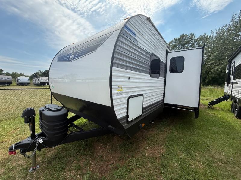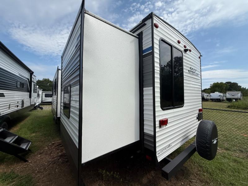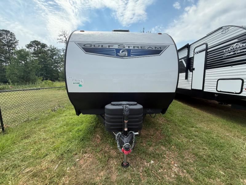 One of these Gulf Stream Conquest Supreme Series travel trailers is ideal for you whether you are looking for a family-friendly unit or a two person getaway! Their uni-body construction is made up of sidewalls, ceiling and floor screwed, glued and tied together with steel straps for unmatched strength and resilience. A powder-coated steel I-beam frame with welded outriggers hold them together and the one-piece seamless roof will last for years to come. Each model includes a 13,500 BTU ducted roof A/C and a gas furnace to keep you comfortable all year long, and the tankless water heater will provide endless hot showers. The included Supreme Package includes upgraded graphics and bigger slide windows, a heated and enclosed underbelly, solar and backup camera prep, and many more hassle-free features. You will appreciate the lighted storage area to easily pack your gear, and the Bluetooth soundbar with outside speakers will make unloading fun!
