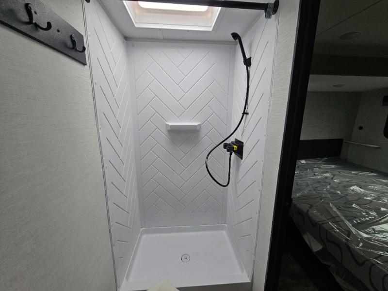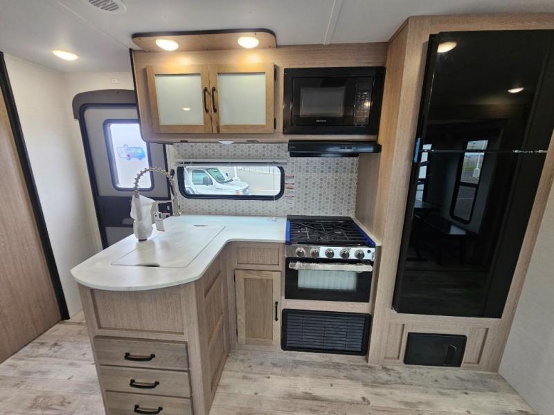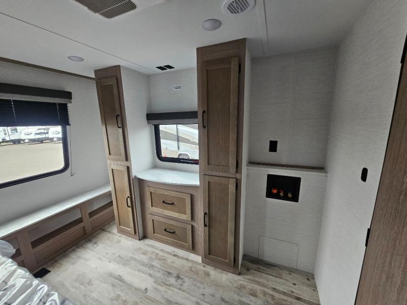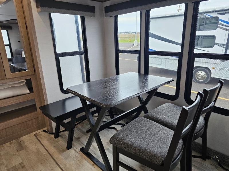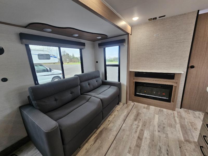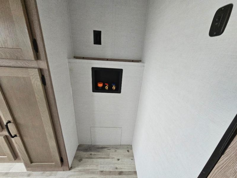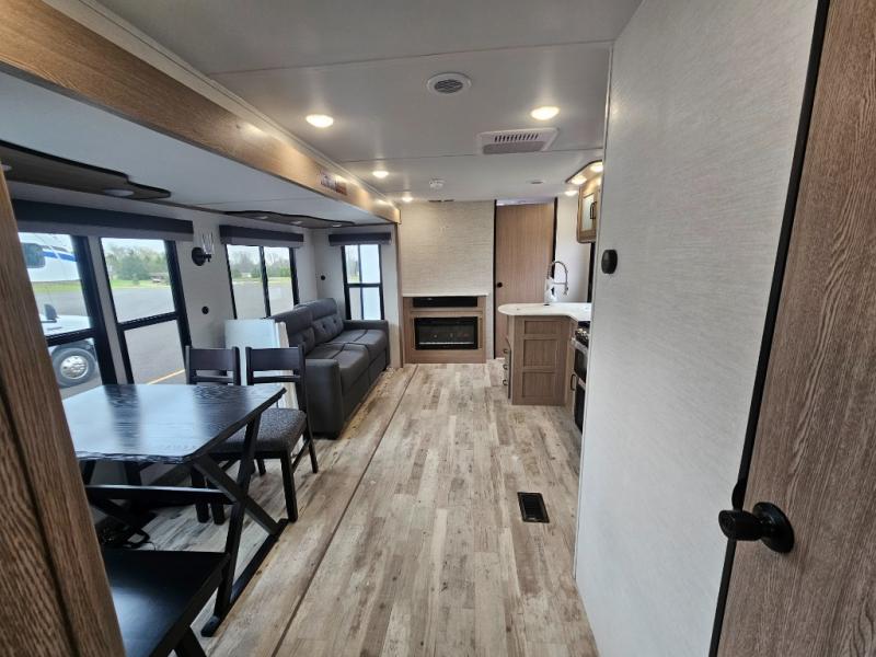 This travel trailer will have you feeling right at home! The front private bedroom has a king bed slide to lay your head on at night across from a vanity with wardrobes on either side, an area prepped to add an optional washer and dryer, plus an entrance into the walk-through bathroom. There is also a rear private bedroom which has a queen bed slide across from a vanity with wardrobes on either side. Just outside the bedroom is the second full bathroom so everyone can quickly get ready in the mornings. Keep your bellies full with delicious home cooked meals prepared on the three burner cooktop then enjoy them at the U-shaped dinette. You can read the morning newspaper while relaxing on the sofa in front of the electric fireplace at the entertainment center!