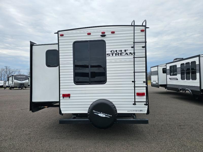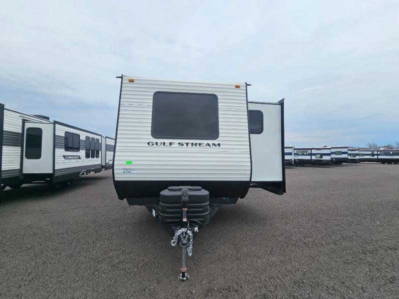 One of these Gulf Stream Conquest Supreme Series travel trailers is ideal for you whether you are looking for a family-friendly unit or a two person getaway! Their uni-body construction is made up of sidewalls, ceiling and floor screwed, glued and tied together with steel straps for unmatched strength and resilience. A powder-coated steel I-beam frame with welded outriggers hold them together and the one-piece seamless roof will last for years to come. Each model includes a 13,500 BTU ducted roof A/C and a gas furnace to keep you comfortable all year long, and the tankless water heater will provide endless hot showers. The included Supreme Package includes upgraded graphics and bigger slide windows, a heated and enclosed underbelly, solar and backup camera prep, and many more hassle-free features. You will appreciate the lighted storage area to easily pack your gear, and the Bluetooth soundbar with outside speakers will make unloading fun!