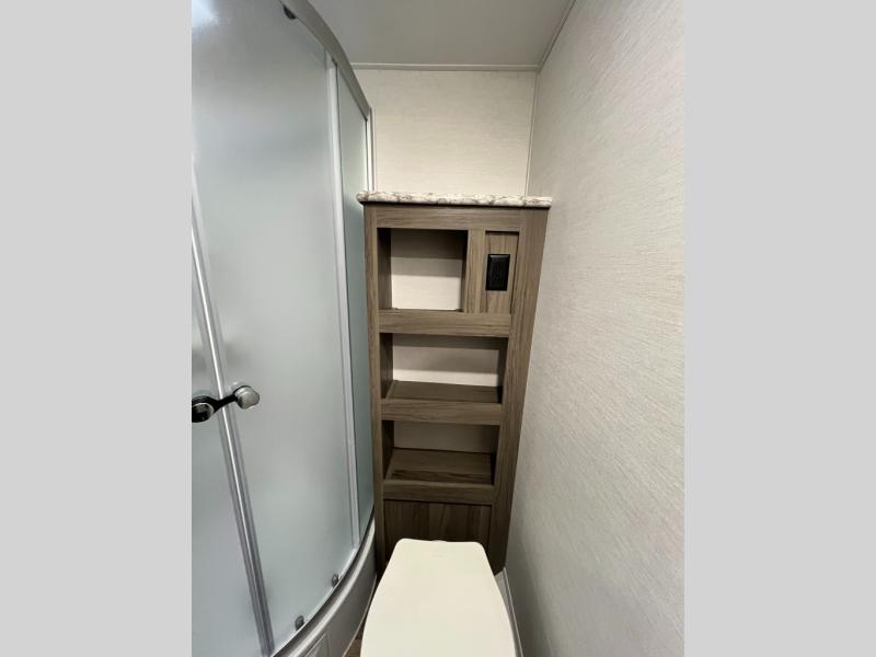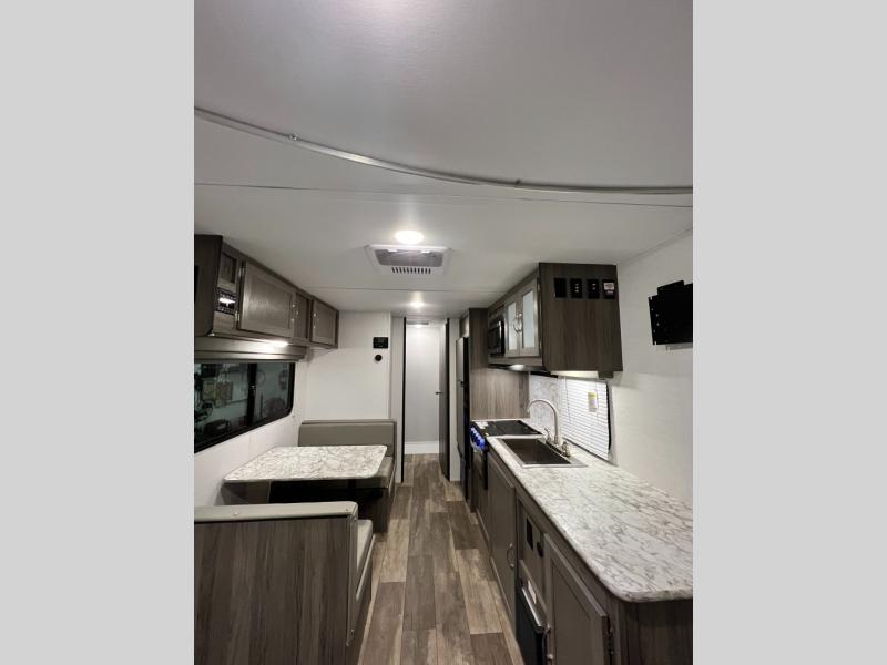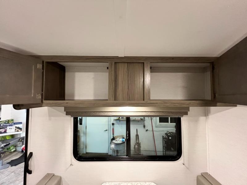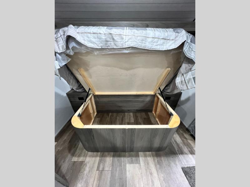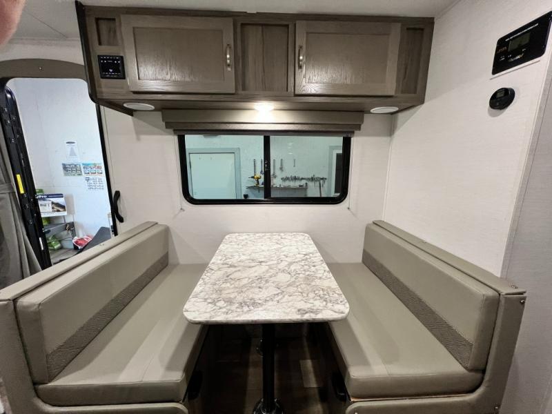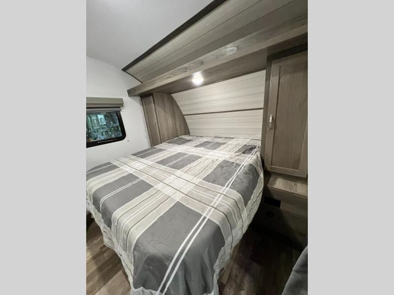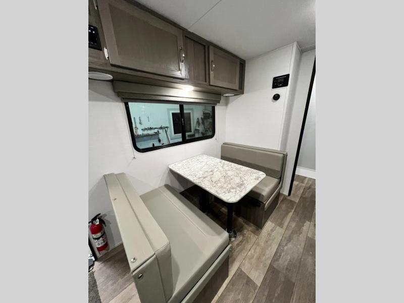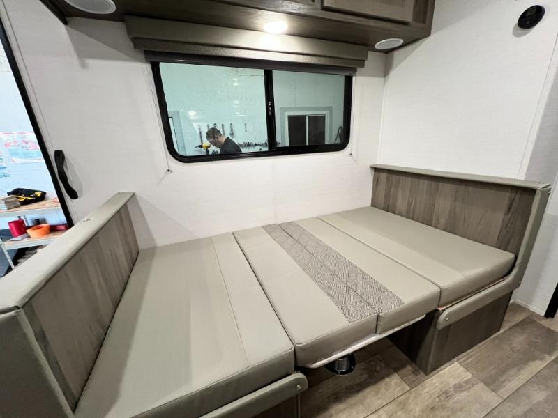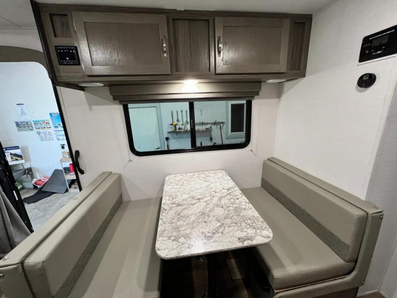 Are you looking for the perfect couples trailer you can take on weekend excursions? Look no further than this model that includes a front queen bed that will feel just like home. If you have any overnight guests they can sleep on the booth dinette. The queen bed can also be switched out for an optional jack knife sofa and optional fold-up Murphy bed, which would give you more seating space during the day if you choose. Each morning you can prepare a hot breakfast on the cooktop, and the 8 cu. ft. 12V refrigerator will be perfect for milk and eggs. This model also includes plenty of storage space, including a linen closet in the bath, a closet just outside the bathroom, and dual wardrobes for all your clothes!