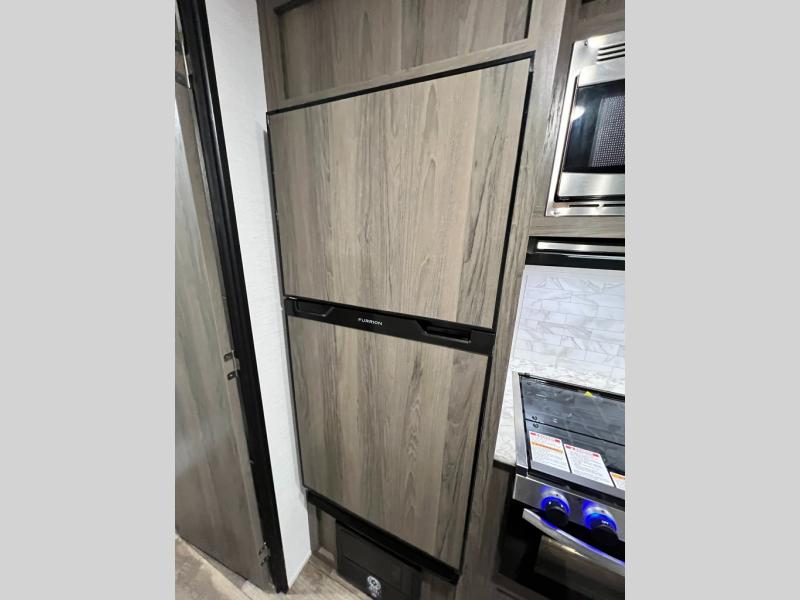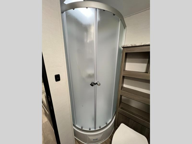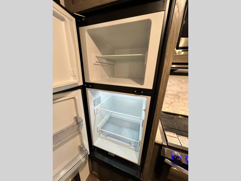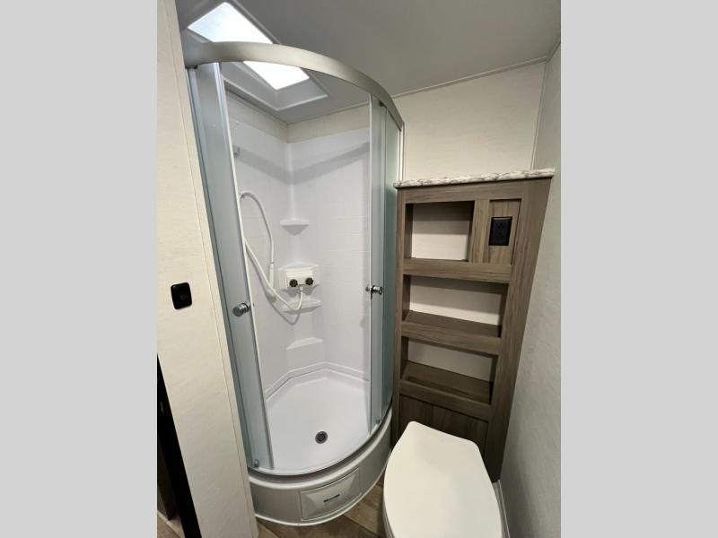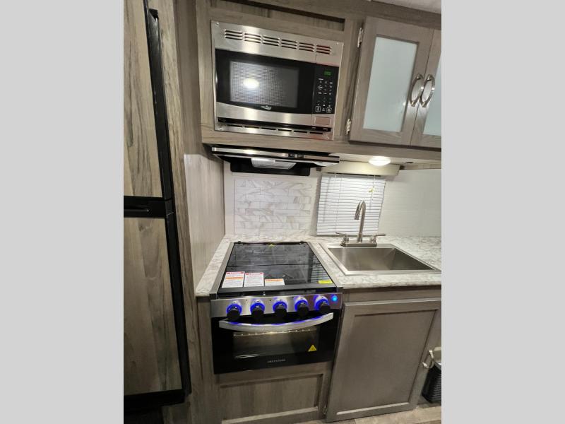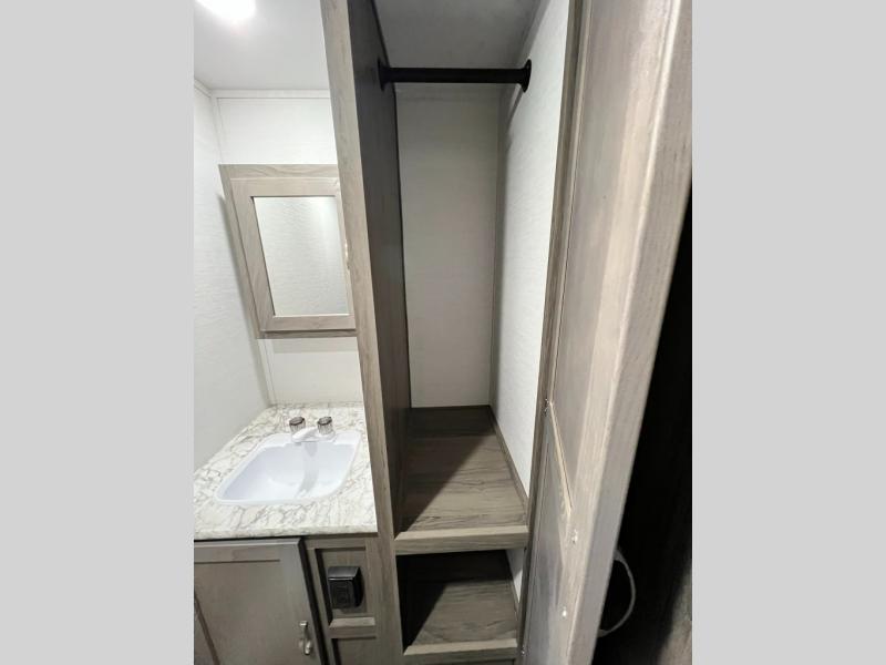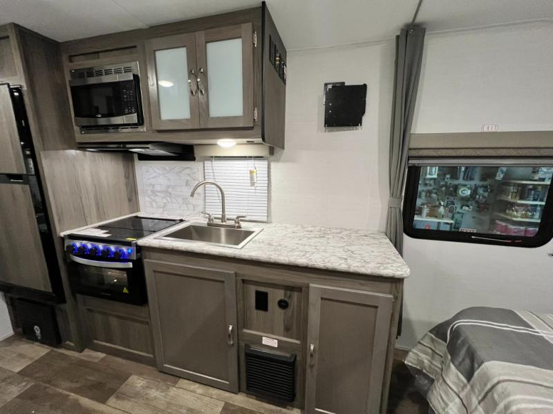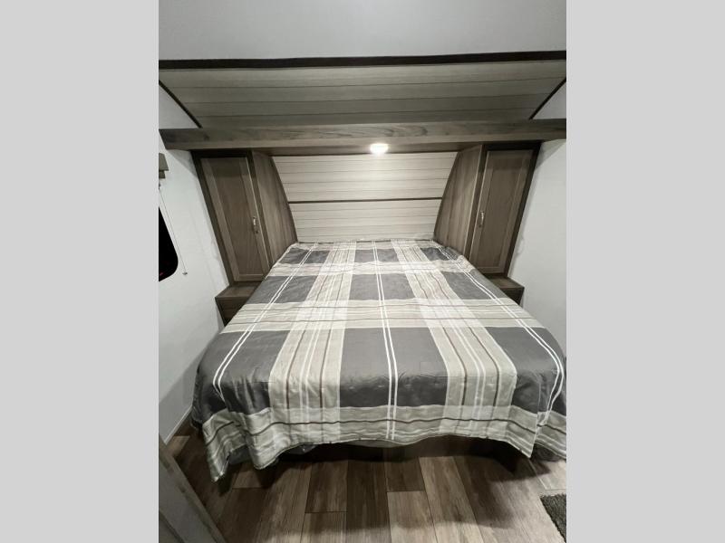 Are you looking for the perfect couples trailer you can take on weekend excursions? Look no further than this model that includes a front queen bed that will feel just like home. If you have any overnight guests they can sleep on the booth dinette. The queen bed can also be switched out for an optional jack knife sofa and optional fold-up Murphy bed, which would give you more seating space during the day if you choose. Each morning you can prepare a hot breakfast on the cooktop, and the 8 cu. ft. 12V refrigerator will be perfect for milk and eggs. This model also includes plenty of storage space, including a linen closet in the bath, a closet just outside the bathroom, and dual wardrobes for all your clothes!