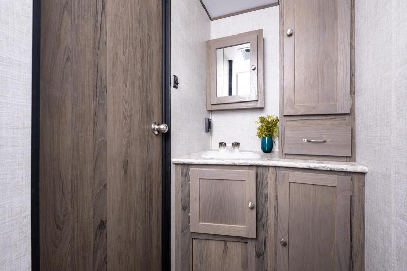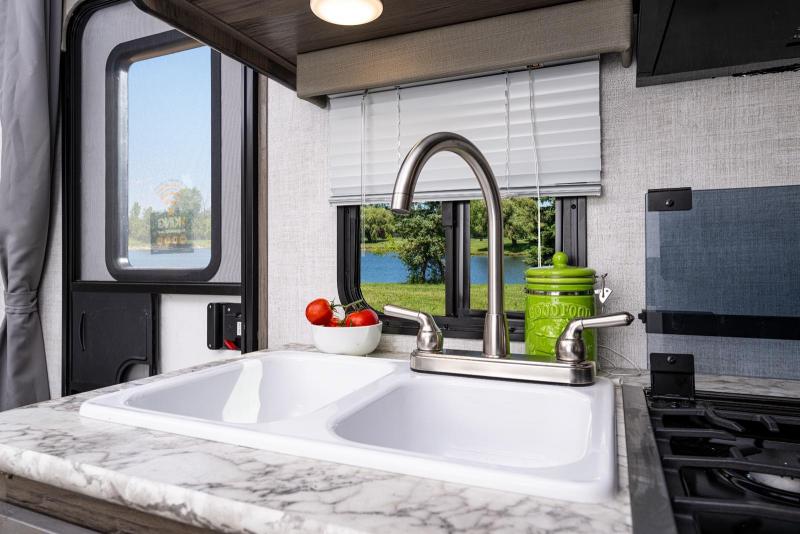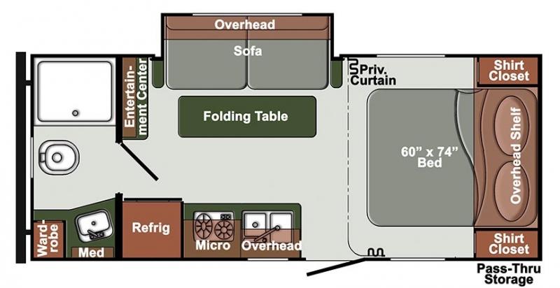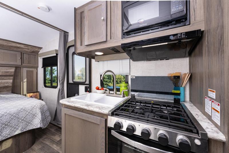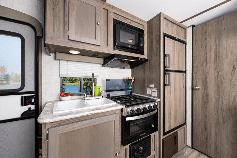 Are you looking for a lightweight travel trailer to take to the lake or woods? This model includes an RV queen bed up front with dual shirt closets and a privacy curtain for you own space. The kids can sleep on the slide out sofa, and the folding table here be perfect for meal times and game night. If you don't want to roast hot dogs every day, the cooktop is sure to come in handy, plus there is a microwave oven for popcorn. This model also in includes a full rear bath so you can clean up before bed just like you do at home!