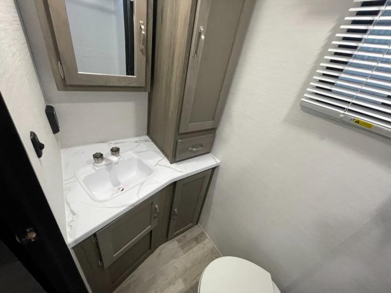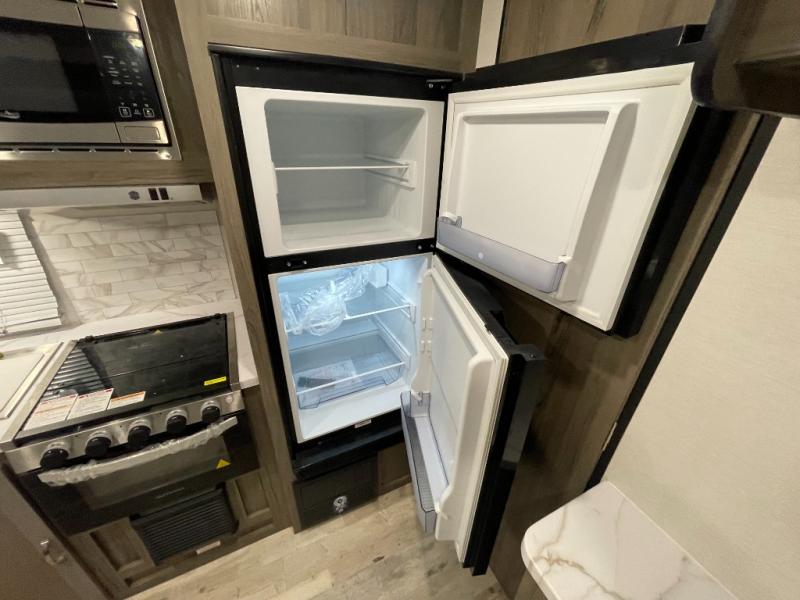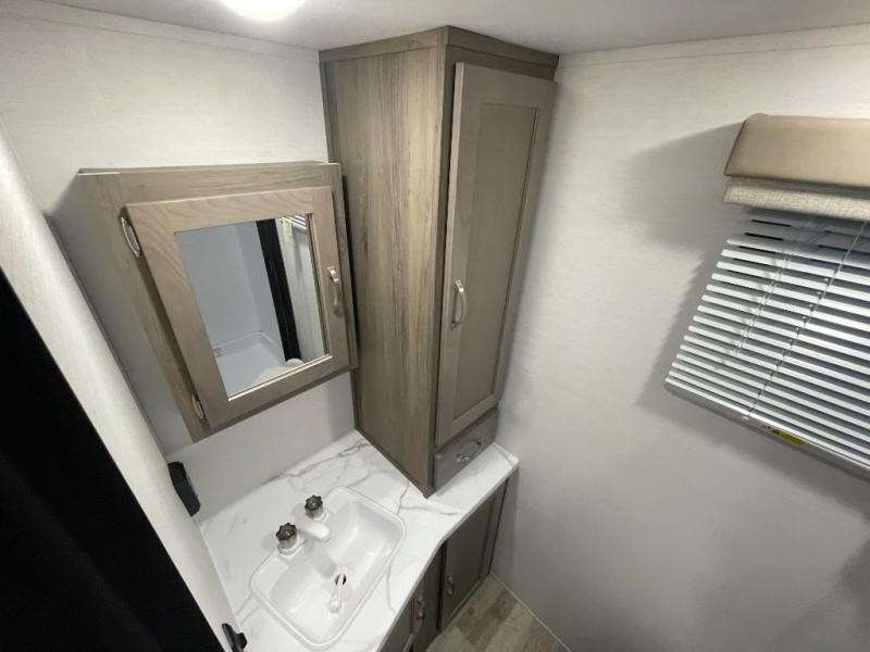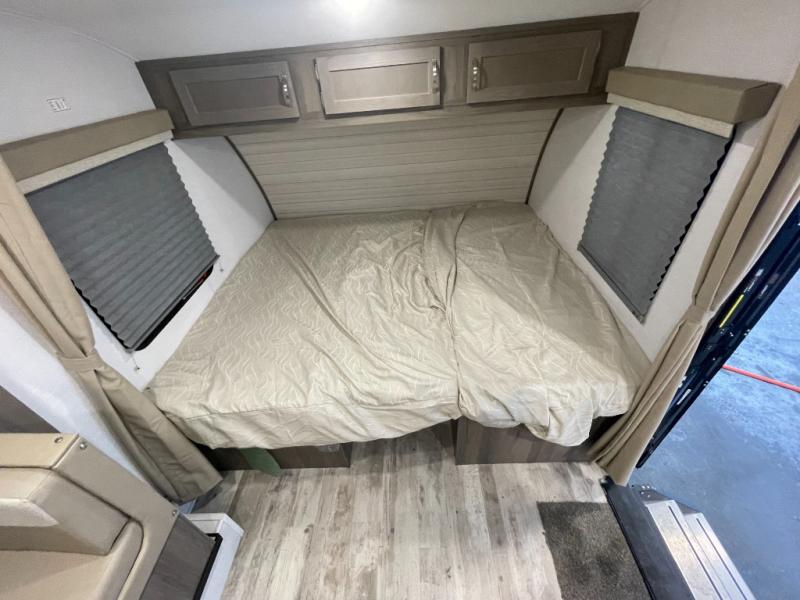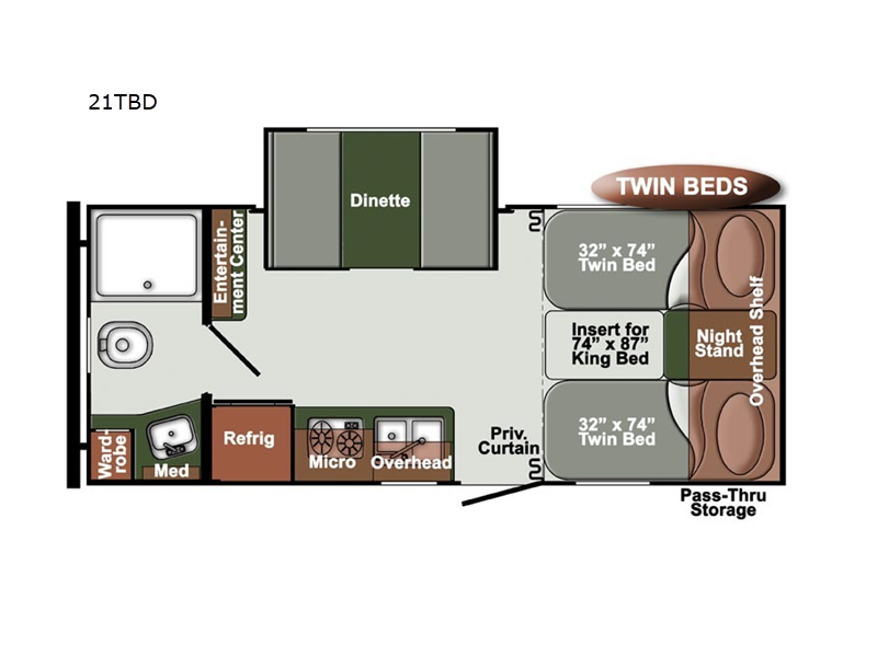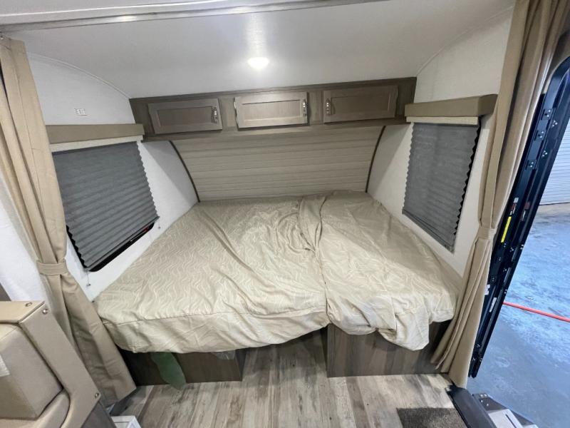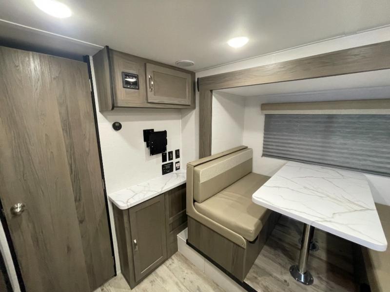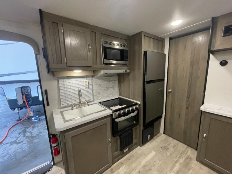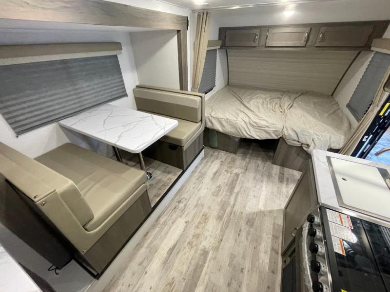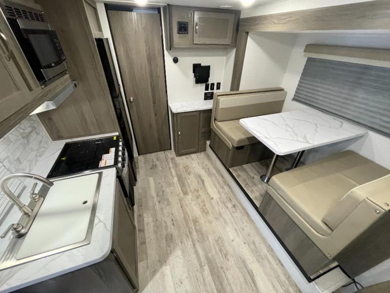 Whether you're camping with your spouse or friends, this travel trailer will be perfect for all your needs. There are two twin beds up front that include an insert to convert them into a king-size bed if you choose. Since there is a privacy curtain in front of the bed(s), you can have an overnight guest stay on the slide out booth dinette and still enjoy your own space. Everyone can stay fresh and clean in the full rear bath, and there is a closet/storage space for necessities or towels. This model includes a cooktop and a microwave oven to cook up your best meals, and if the weather is nice you can dine outside under the electric awning with LED lights.