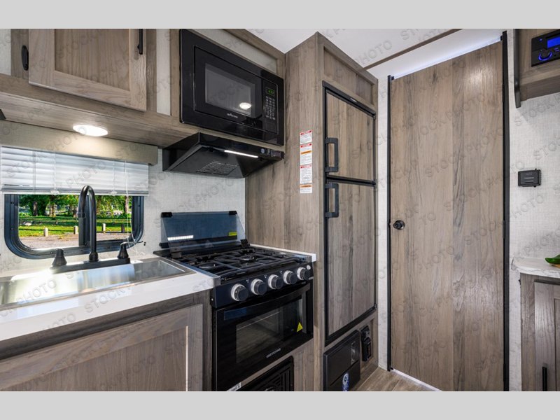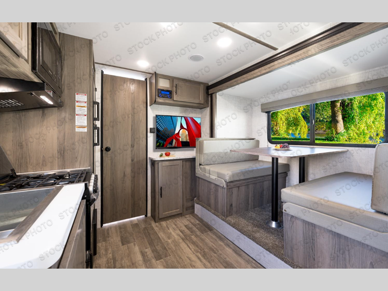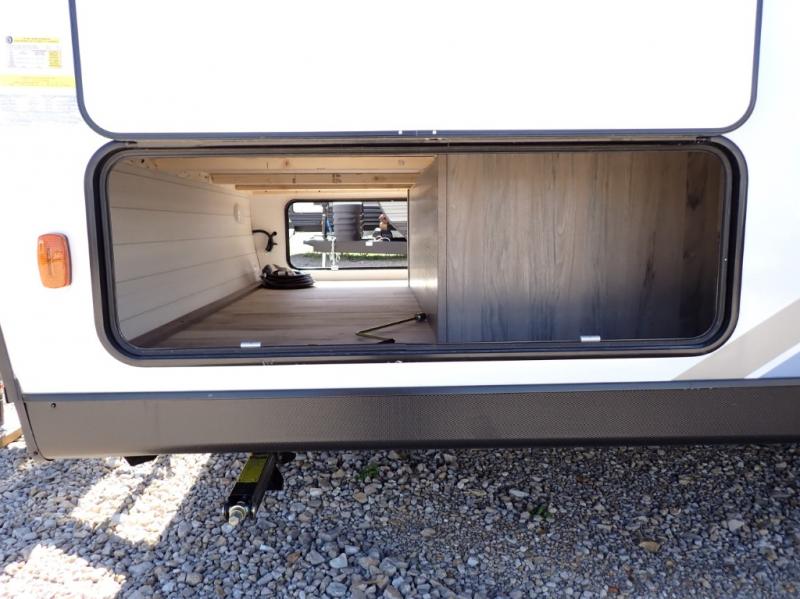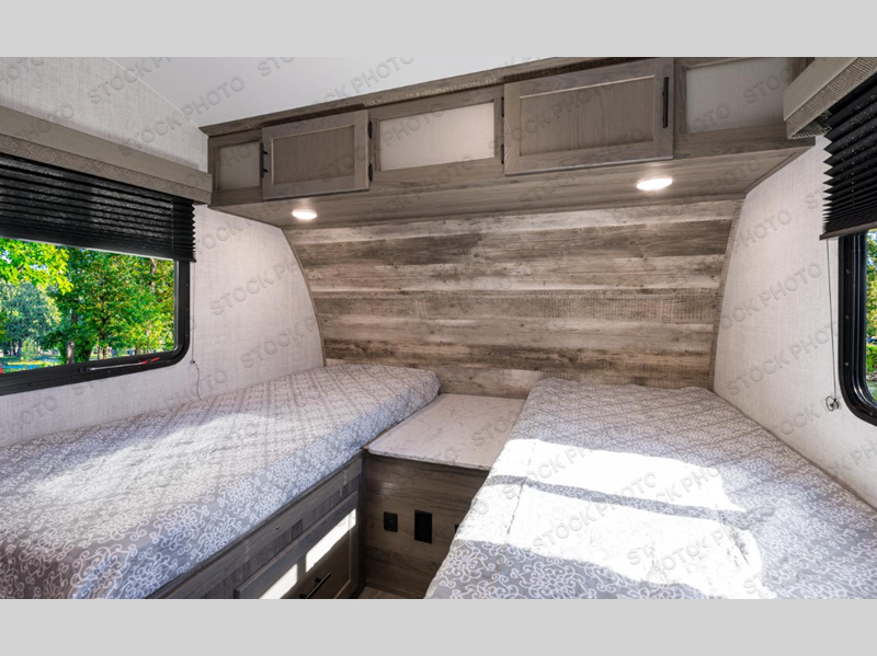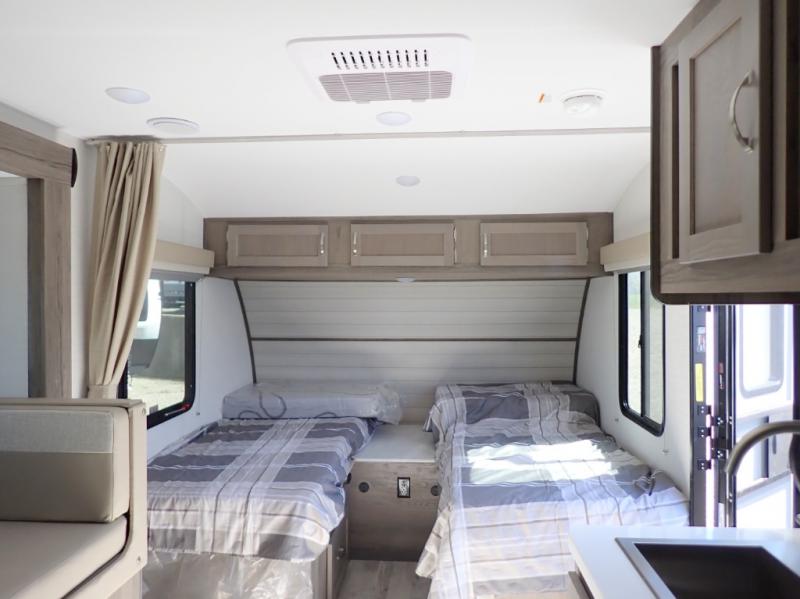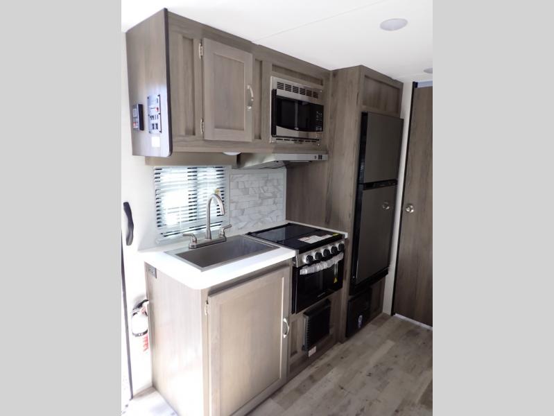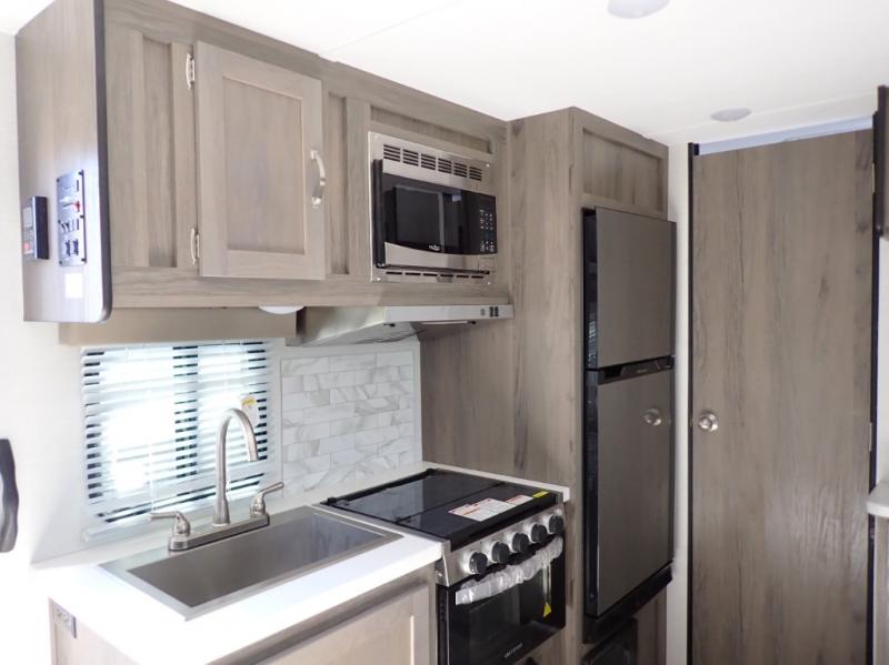 Whether you're camping with your spouse or friends, this travel trailer will be perfect for all your needs. There are two twin beds up front that include an insert to convert them into a king-size bed if you choose. Since there is a privacy curtain in front of the bed(s), you can have an overnight guest stay on the slide out booth dinette and still enjoy your own space. Everyone can stay fresh and clean in the full rear bath, and there is a closet/storage space for necessities or towels. This model includes a cooktop and a microwave oven to cook up your best meals, and if the weather is nice you can dine outside under the electric awning with LED lights.