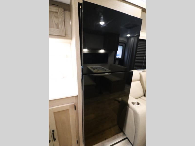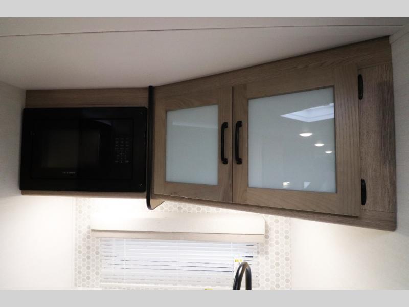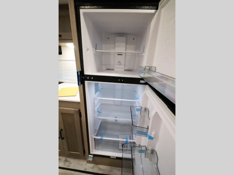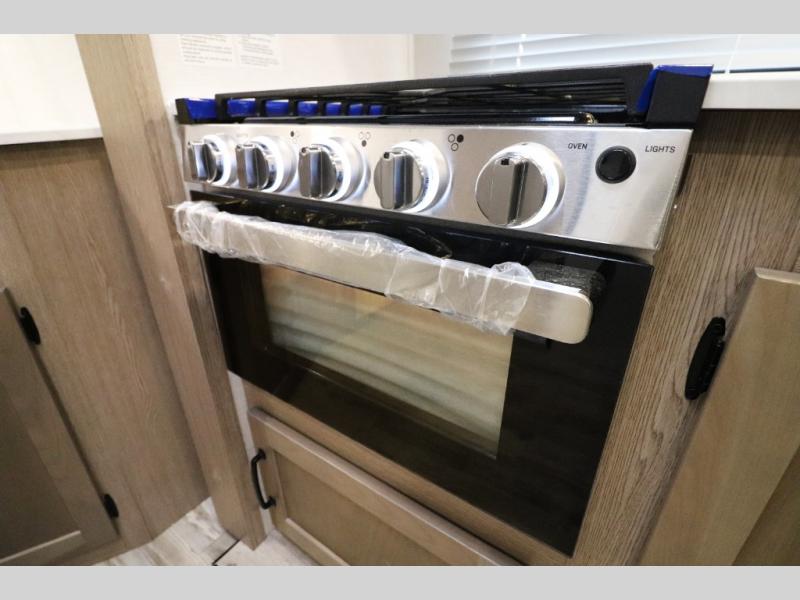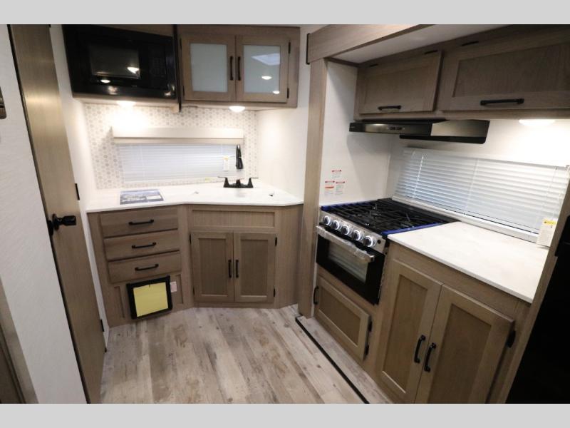 Spacious Rear Kitchen: The 240RK features a well-appointed rear kitchen equipped with a three-burner cooktop, an Everchill 10.7 cu ft refrigerator/freezer, and ample counter space, allowing you to prepare meals with ease.