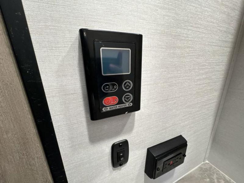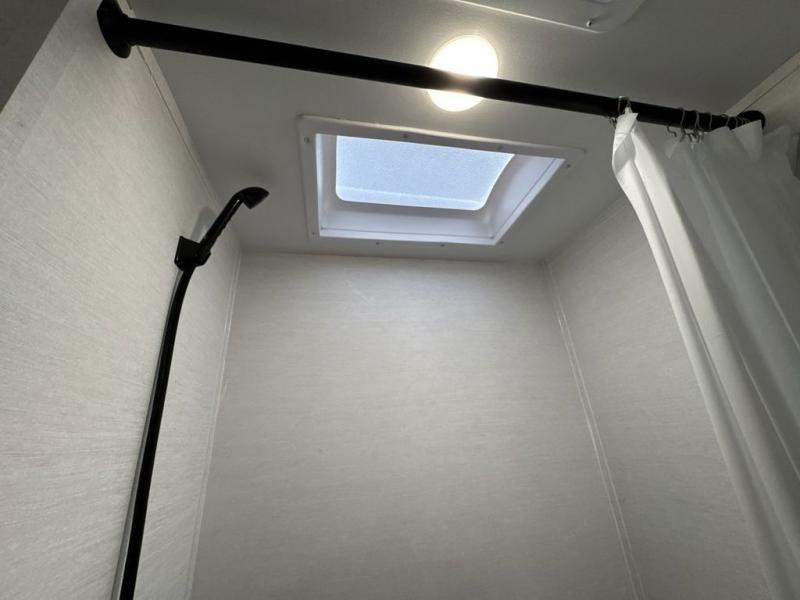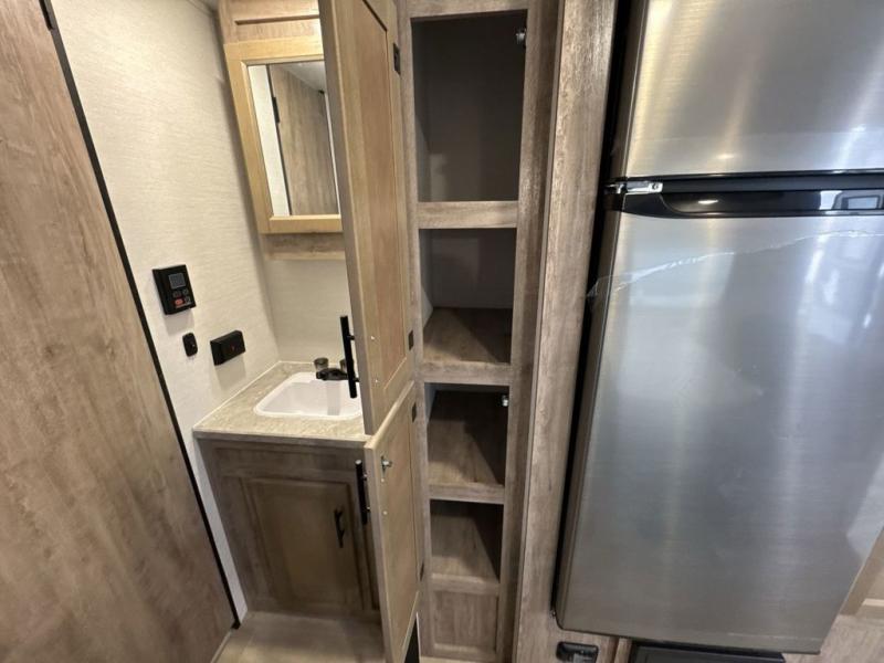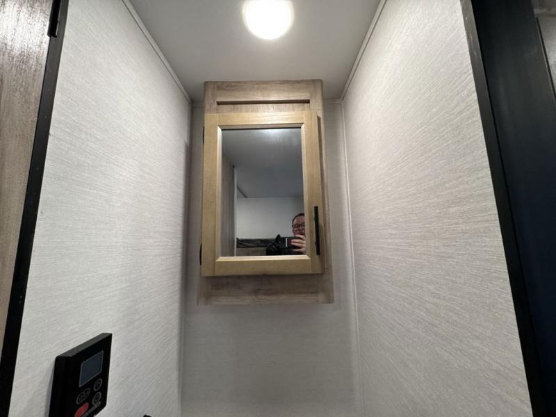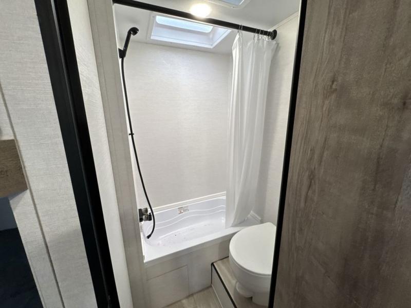 This semi-private front bedroom travel trailer allows you to change in privacy when you close the curtain and sleep on a queen-size bed or choose the optional Murphy bed/sofa for versatility. You will find your own wardrobe and a handy shelf at the head of the bed for your belongings. Your friends or kids will loving sleeping on the double-size bunks in the rear next to the private toilet and tub/shower room. The bathroom sink is just outside the door which is handy when two people need to get ready at once. And the cook will have full amenities plus a pantry and overhead storage for all the dishes, pots, and spices.