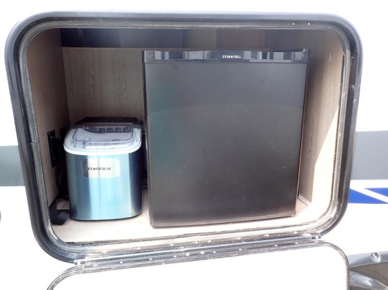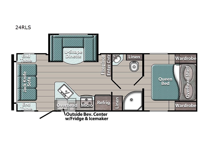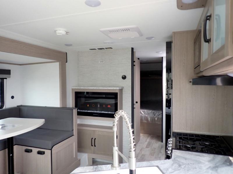 You're going to love camping in this spacious travel trailer with friends and family. Since there is a front bedroom with a queen bed, a rear jack knife sofa, and a U-shaped dinette, you can comfortably sleep five to six people each night. The chef of your group can whip up breakfast on the three burner cooktop, or use the microwave oven. You will also love the outside beverage center with a refrigerator and an icemaker for cold drinks as you visit under the awning. If you'd rather stay in for the evening, the fireplace will make you feel right at home, and you can bring along your own TV for the entertainment center!