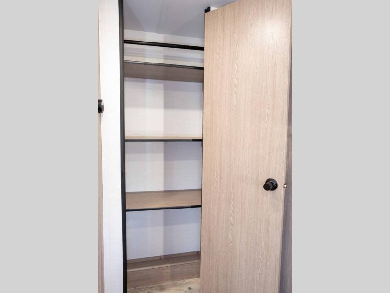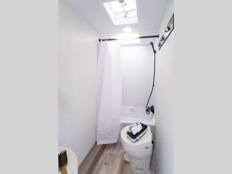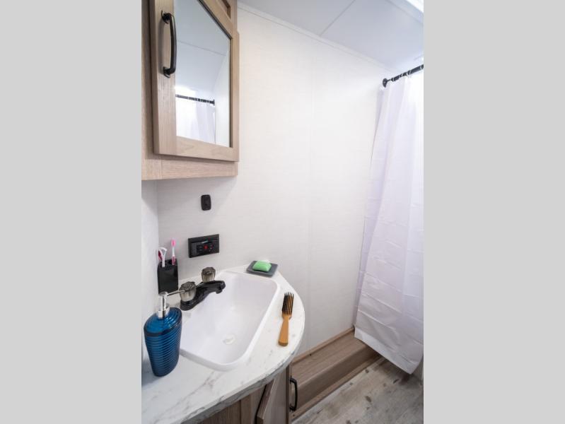 Invite more along with double-size bunks in this 'Show Stopper' travel trailer! The private shower and toilet is close to the bunks if you're camping with little ones making it quite convenient, especially at night. You will be comfortable on the front RV queen bed with dual bedside nightstands and shirt closets. The kitchen features everything you need to create meals and snacks for your entire family, and the outside pass-through storage allows you to easily tuck away your gear like fishing poles, camp chairs and games, plus more!